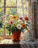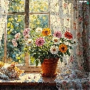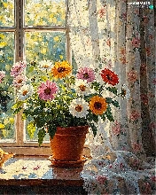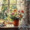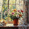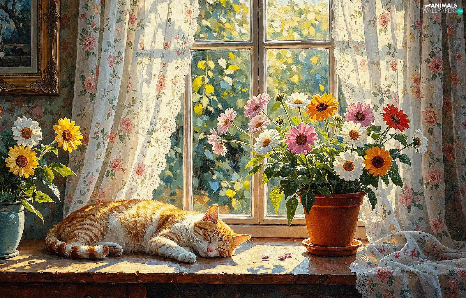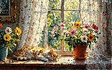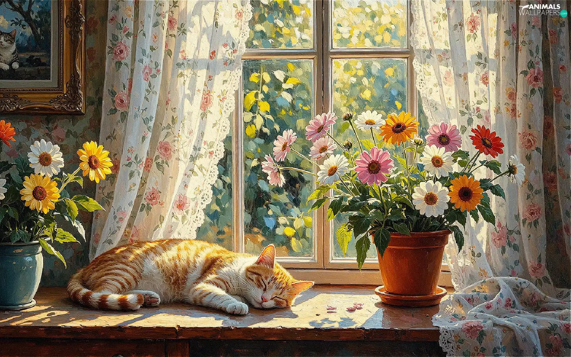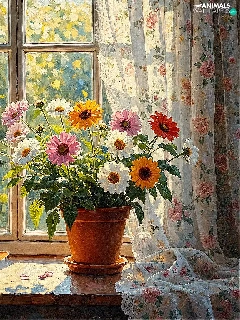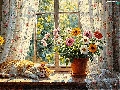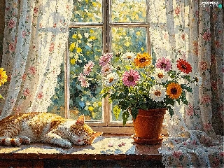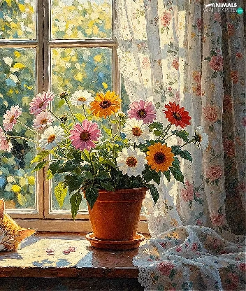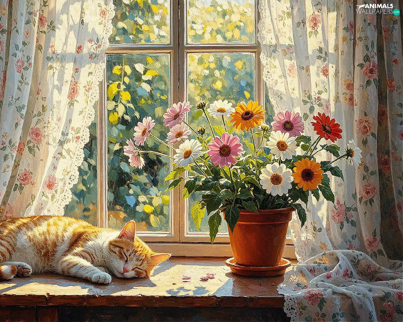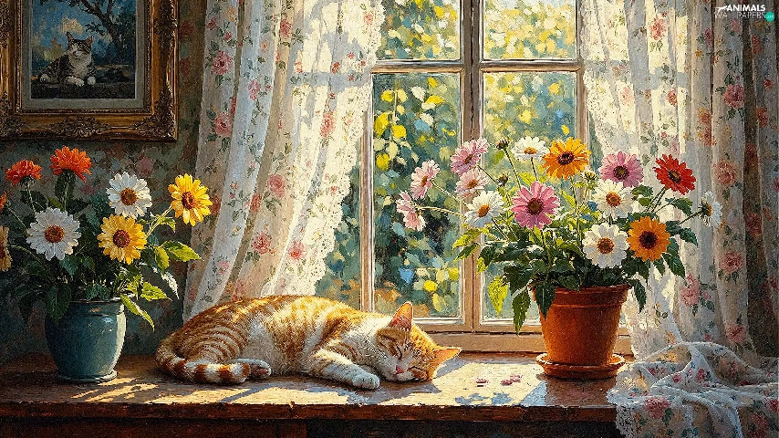 cat, parapet, Vase, Window, pot, sleepy, ginger, Flowers