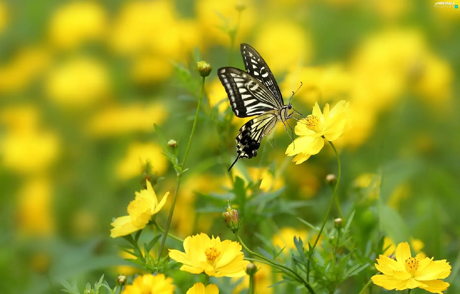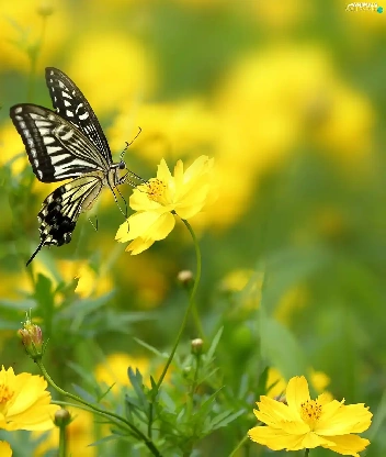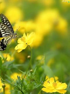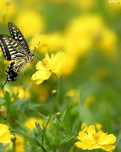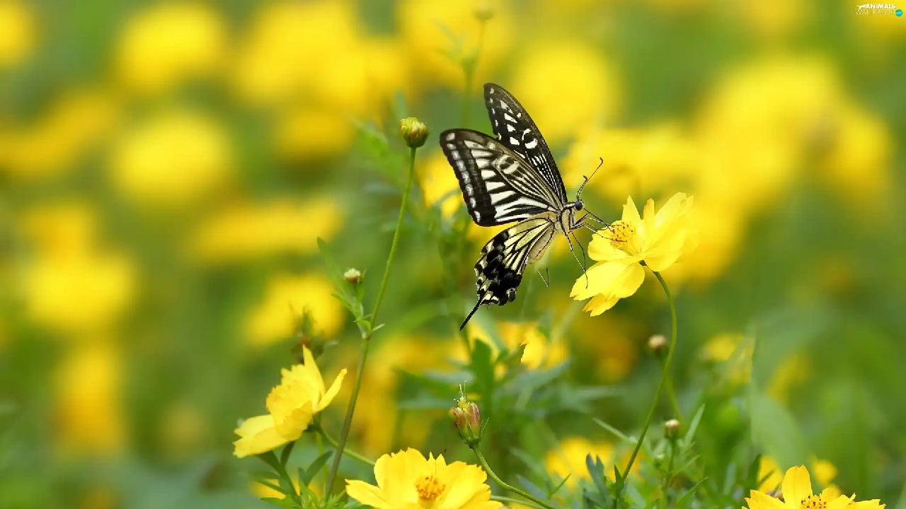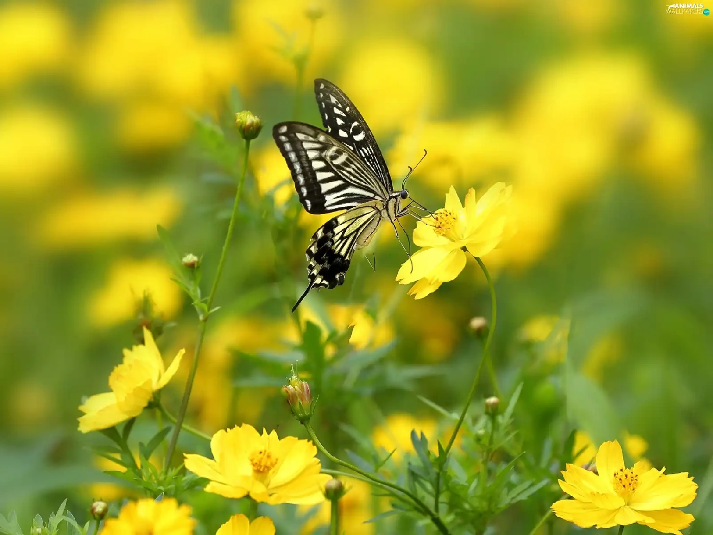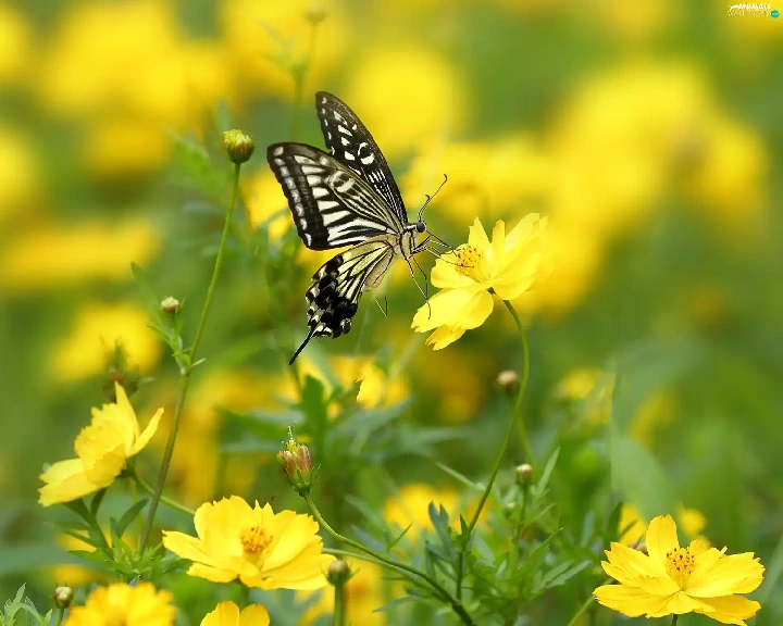 Yellow, Cosmos, butterfly, Flowers