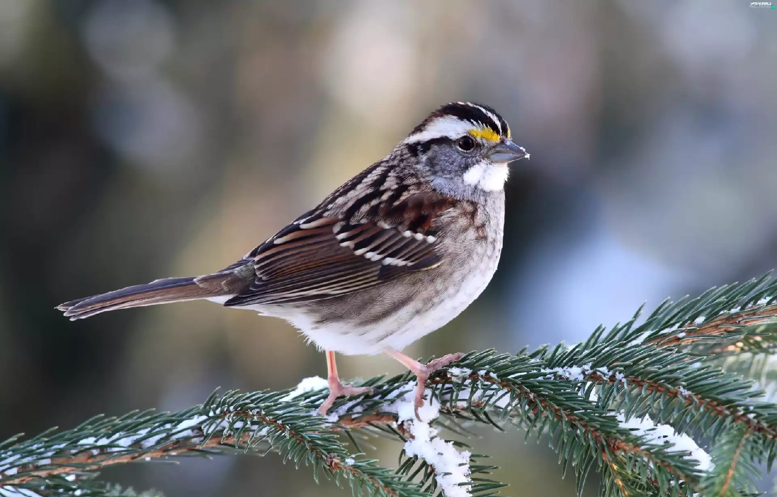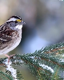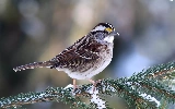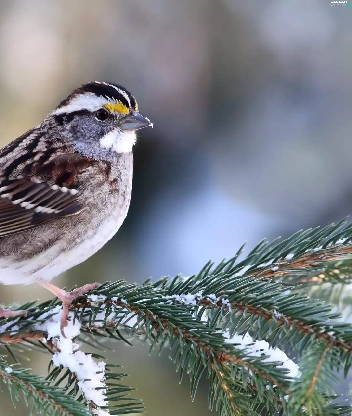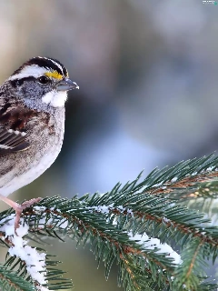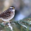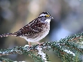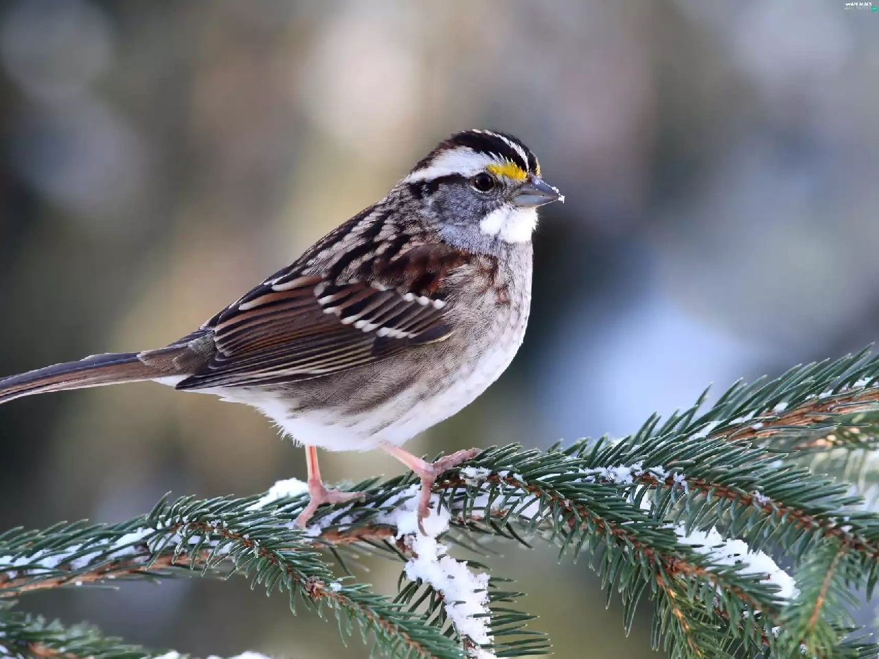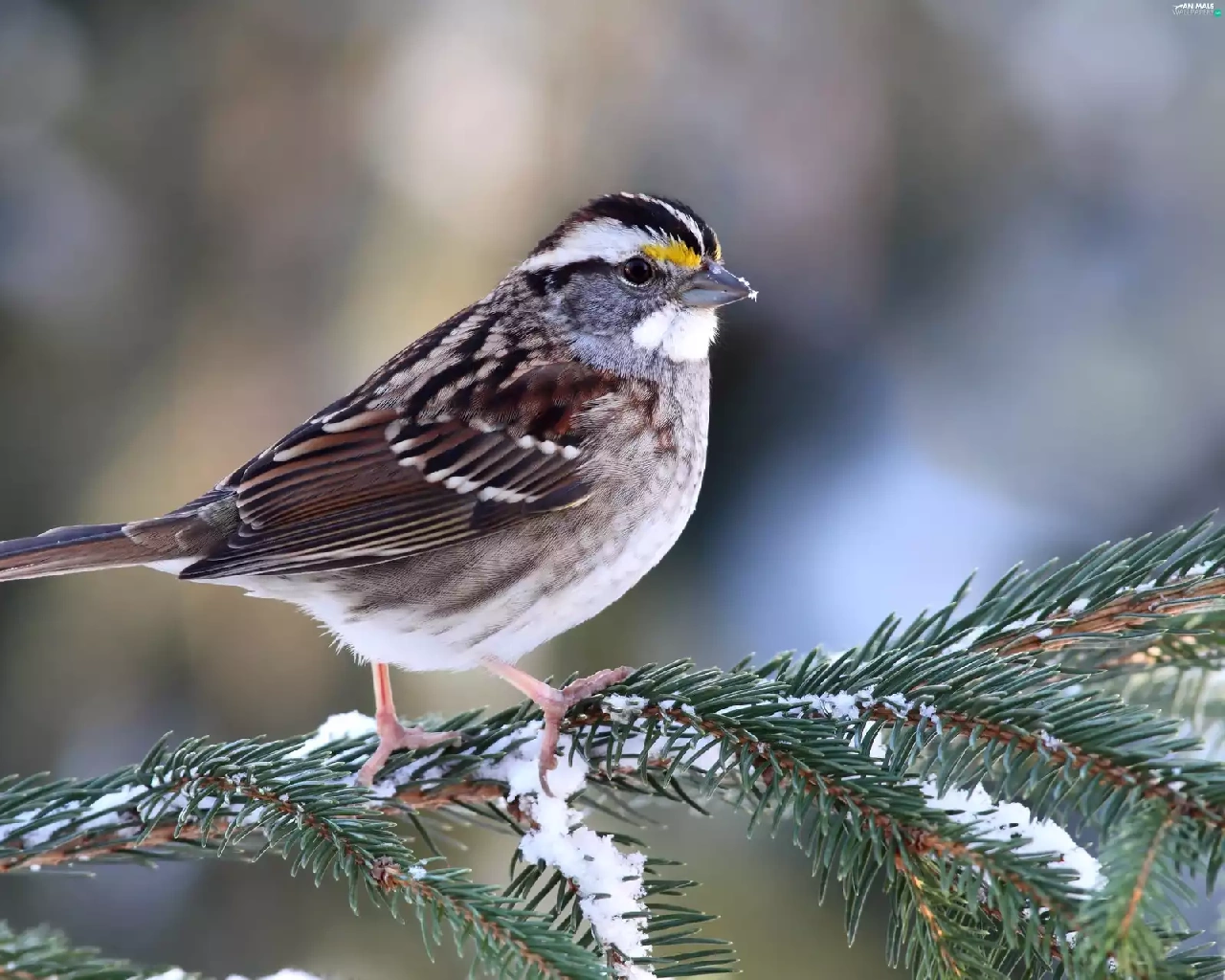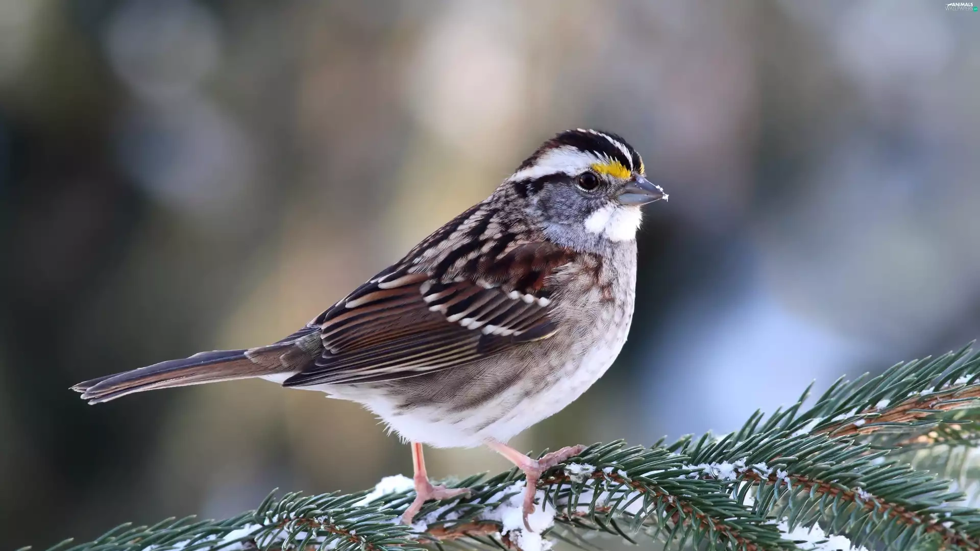 conifer, snow, Restless Flycatcher, twig, Zonotrichia