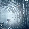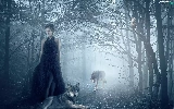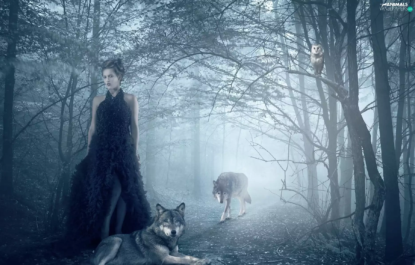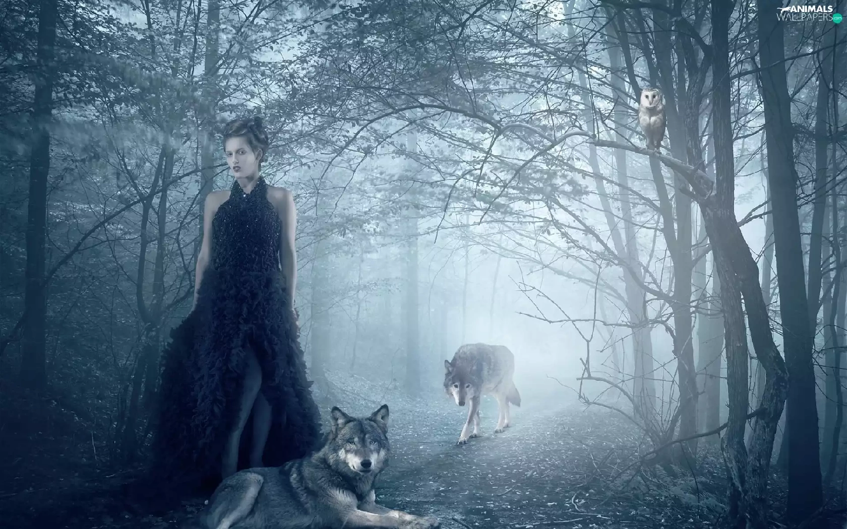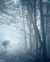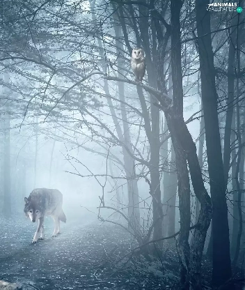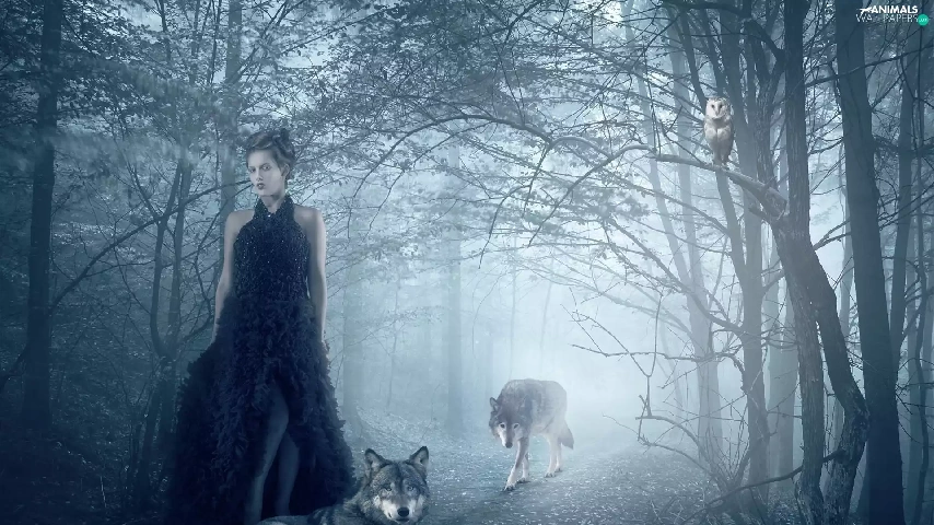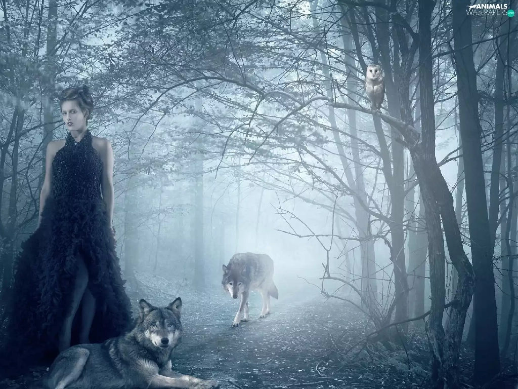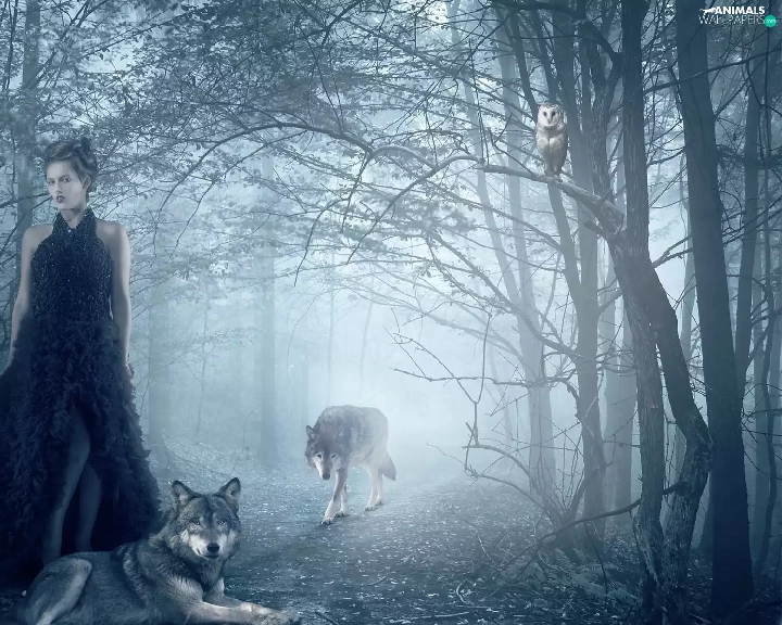 owl, Fog, forest, wolves, Women