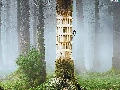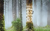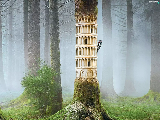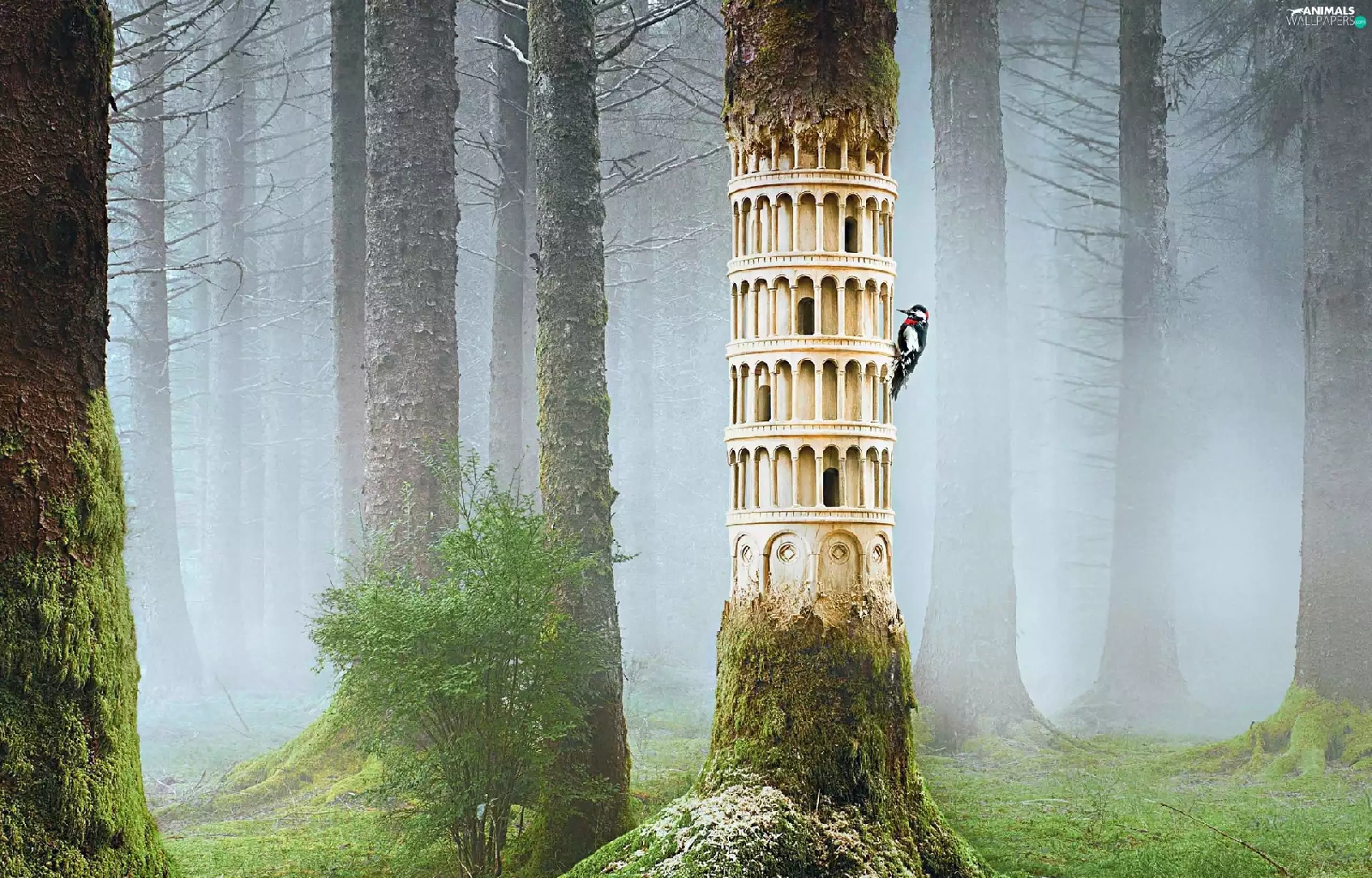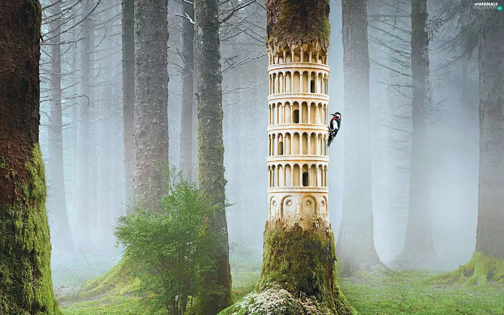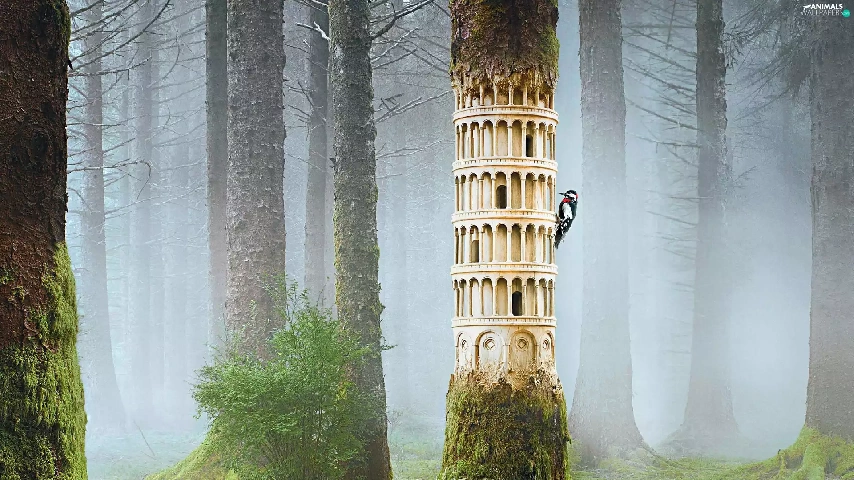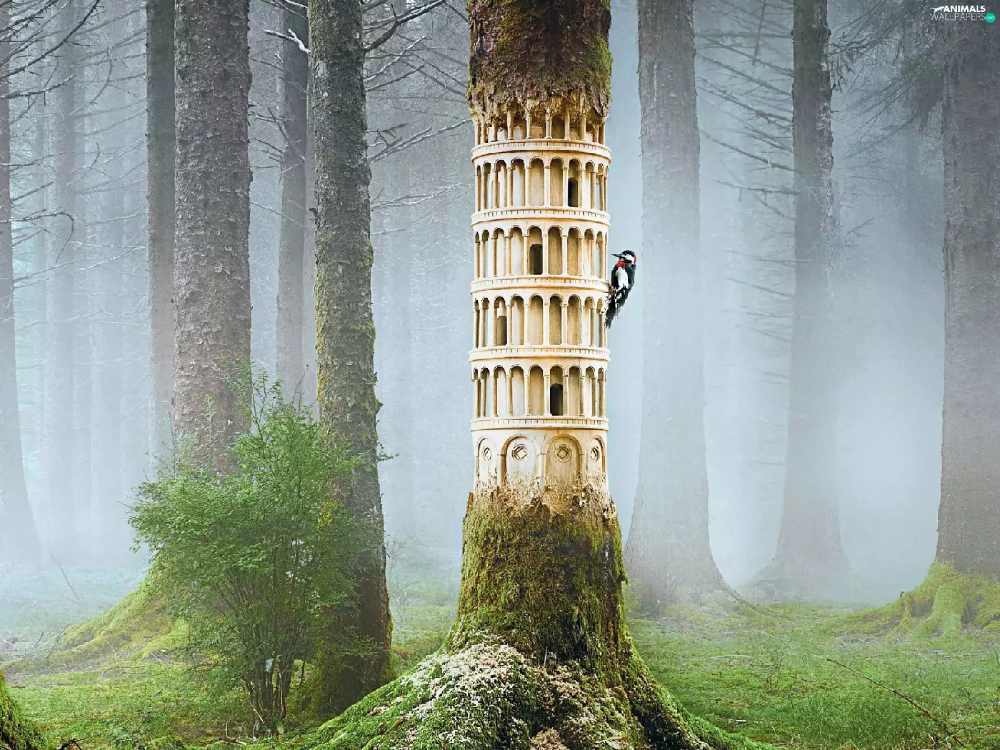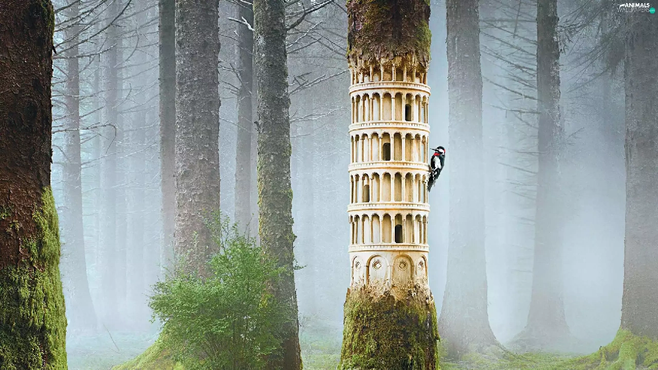 Fog, woodpecker, forest