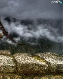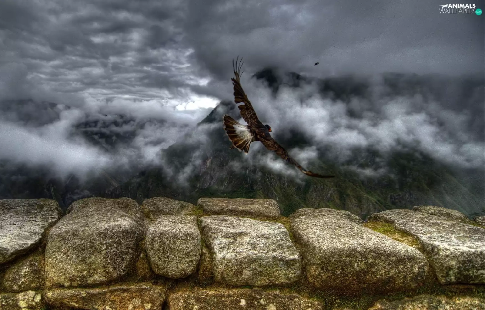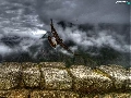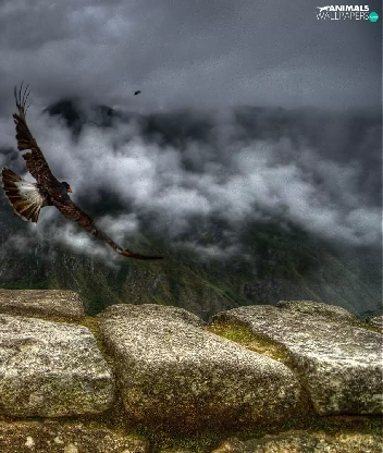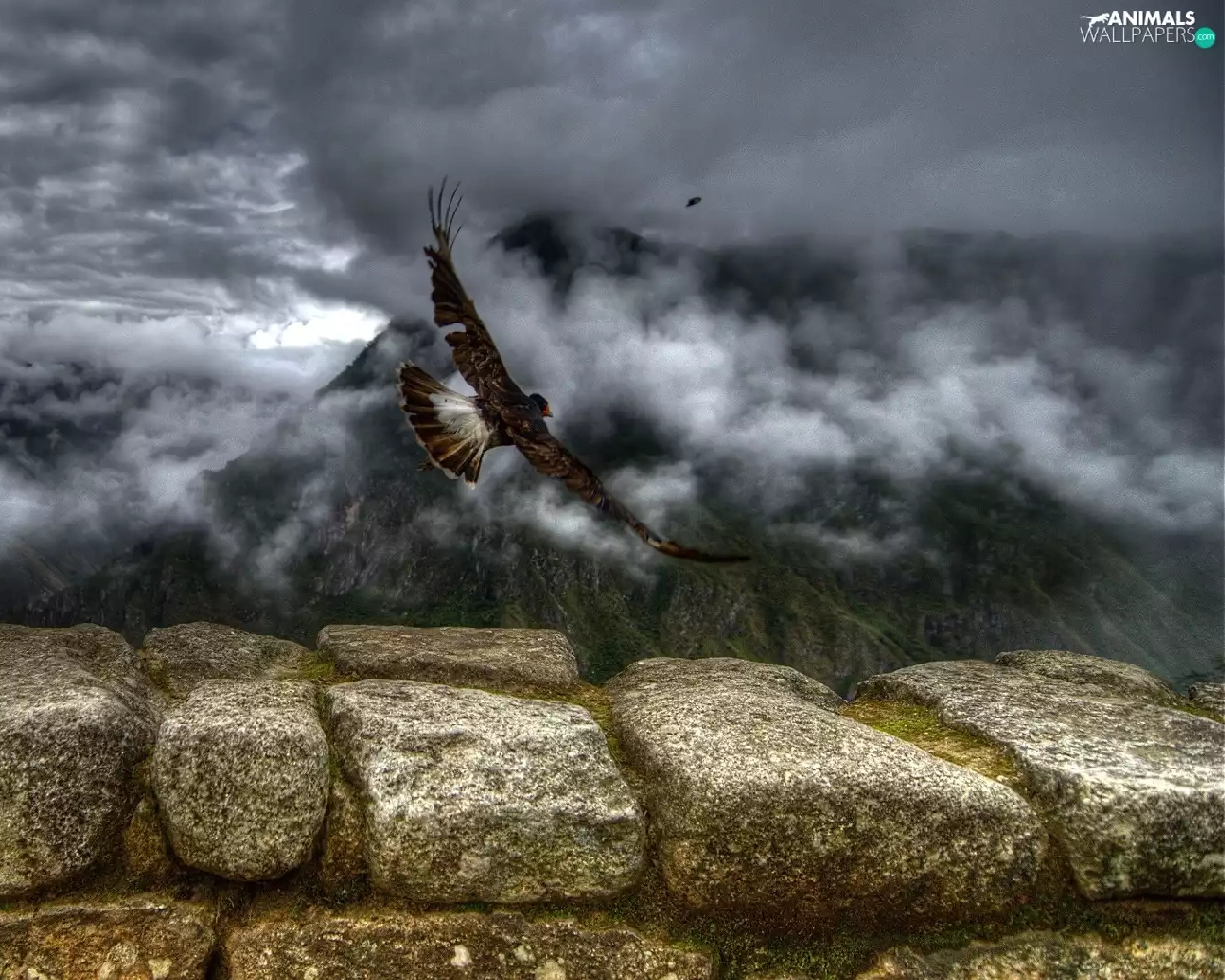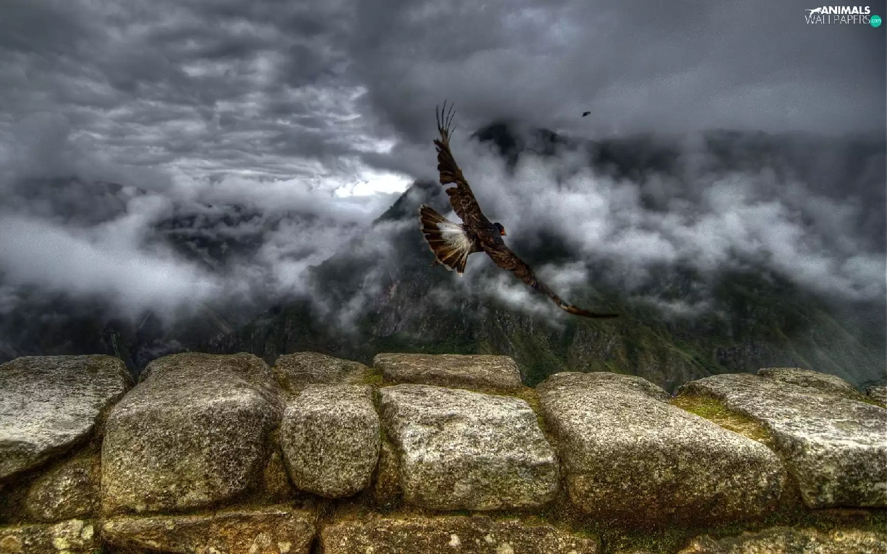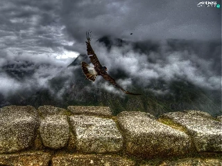 Mountains, birds, ledge, Fog