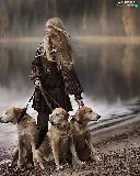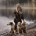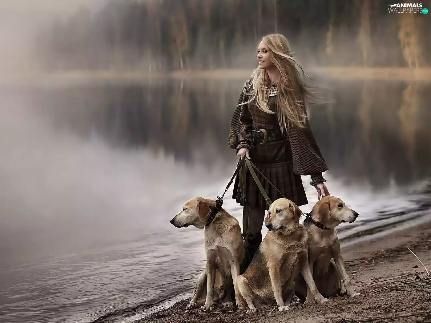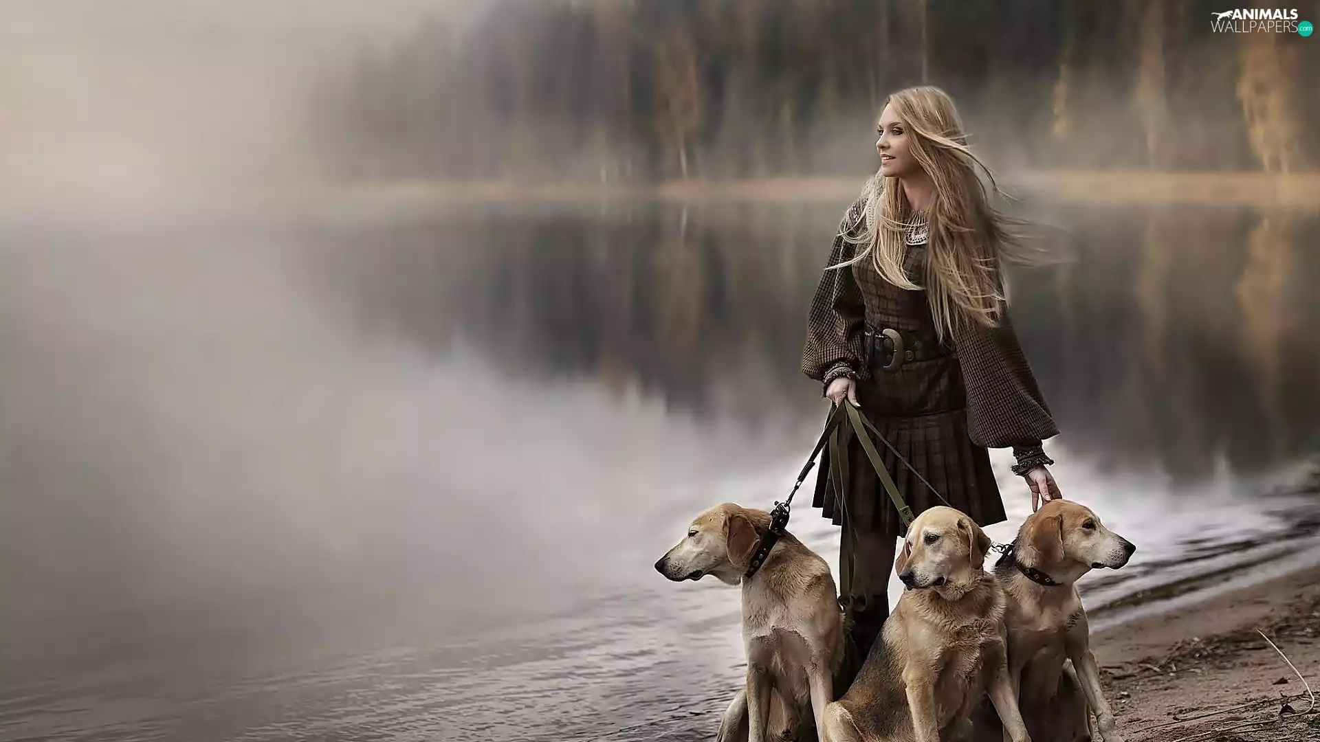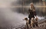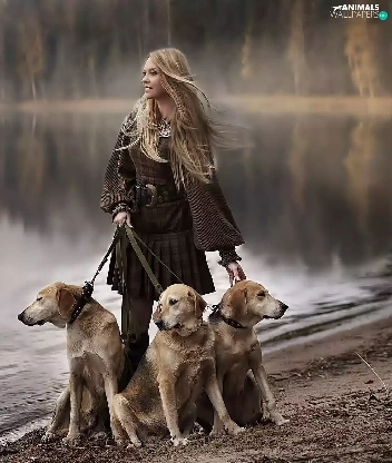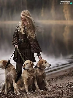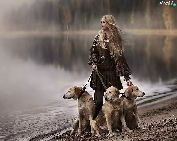 River, forest, Blonde, Dogs, Women