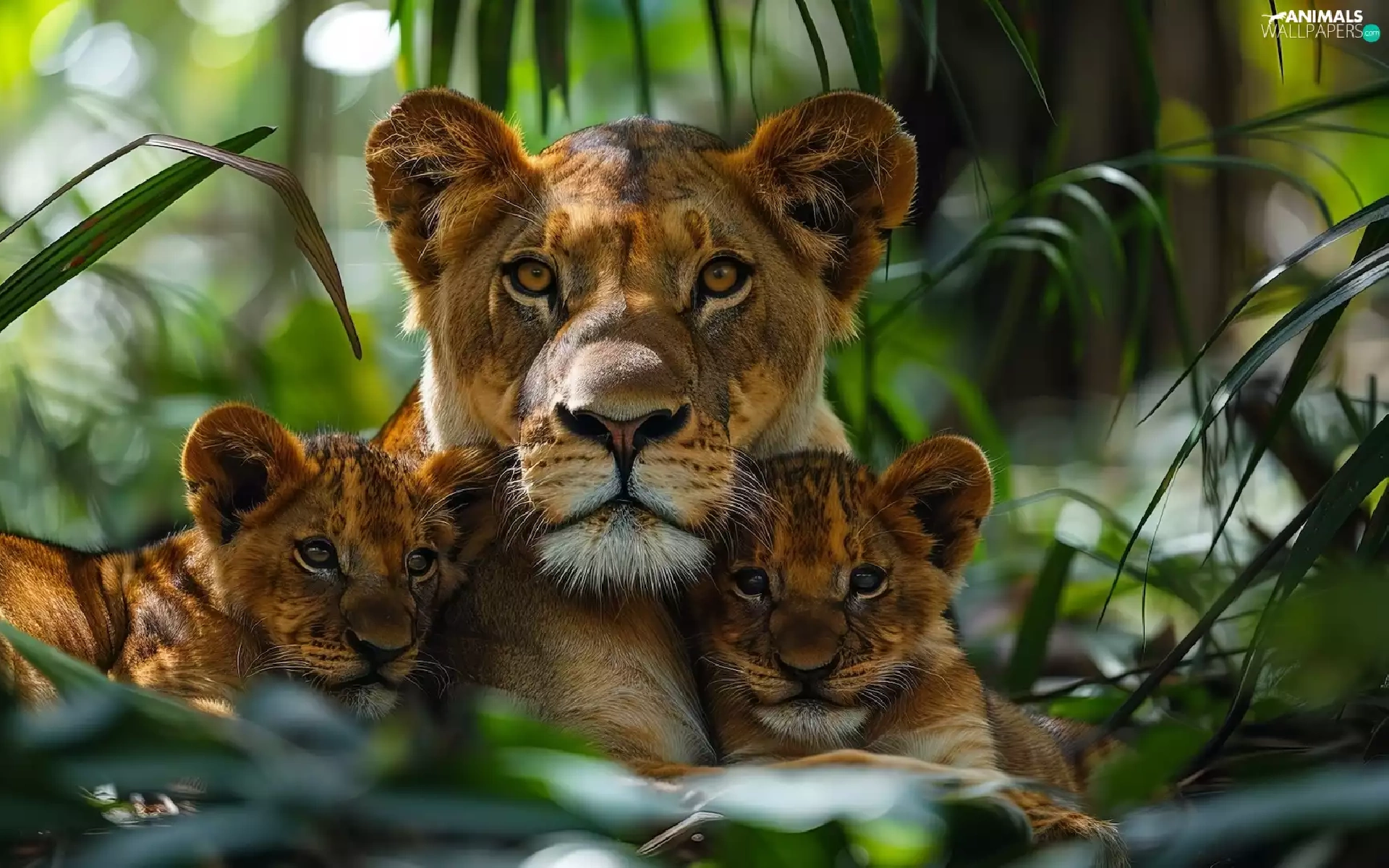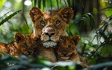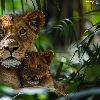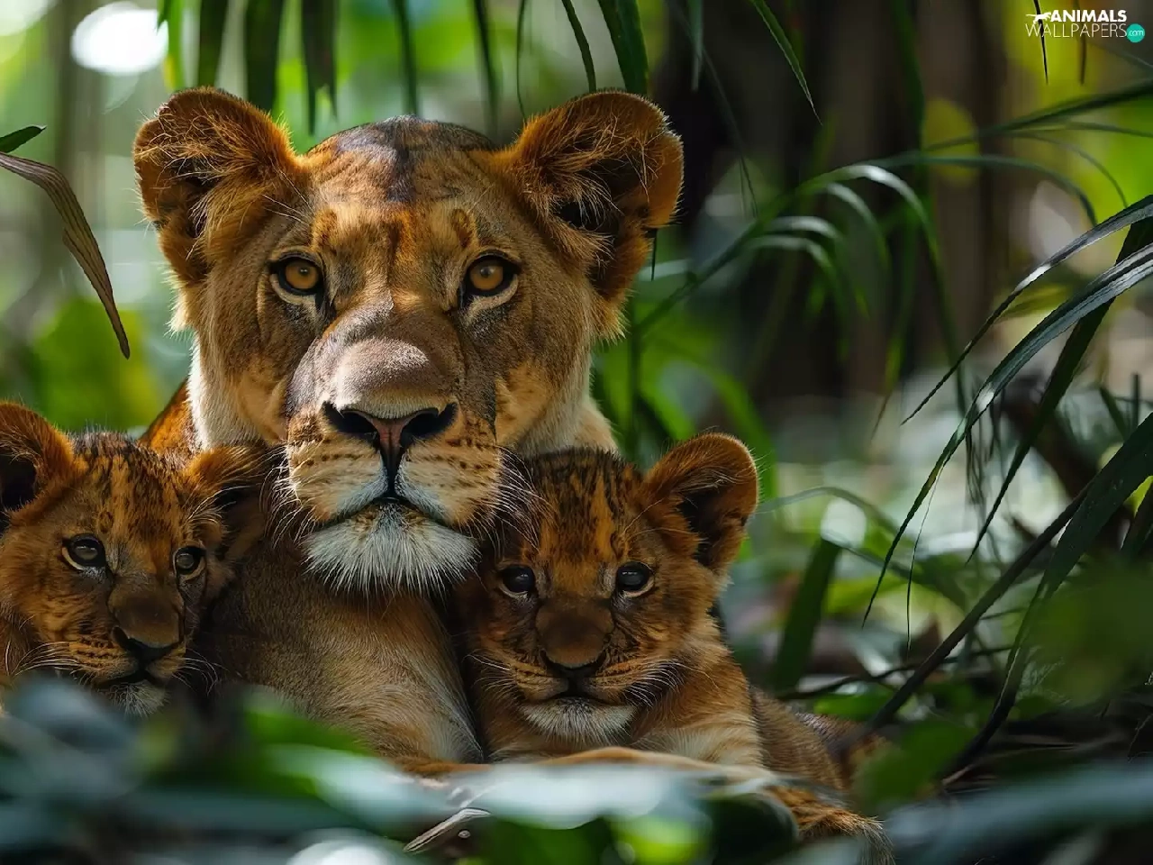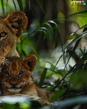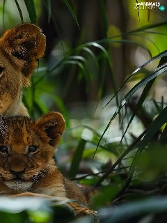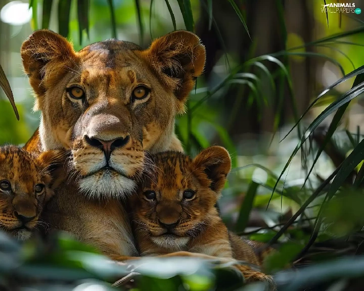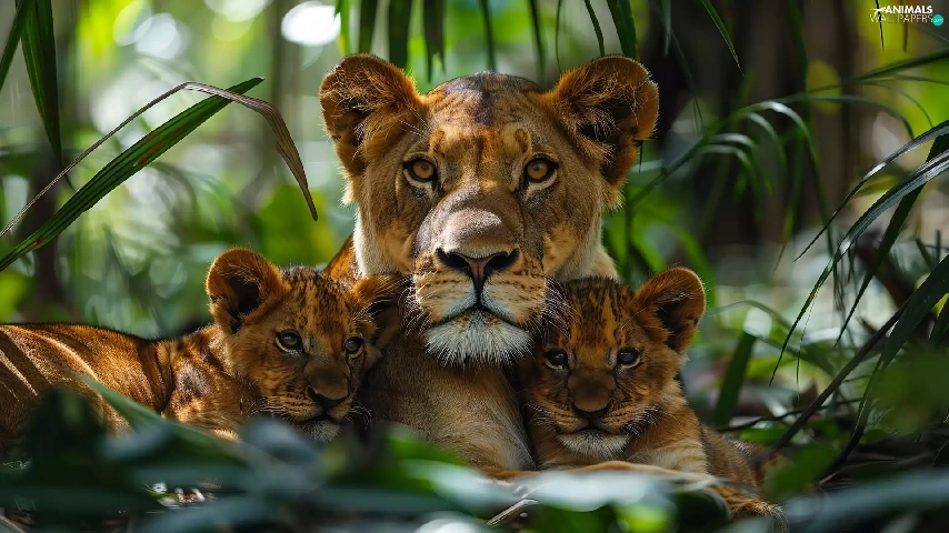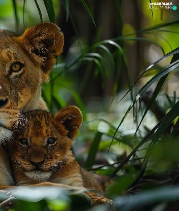Two cars, Lion, forest, Leaf, tigers, Lioness