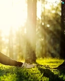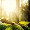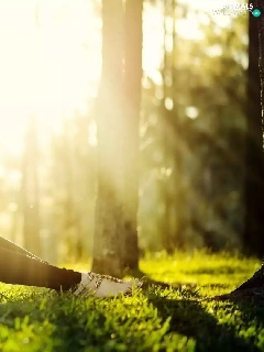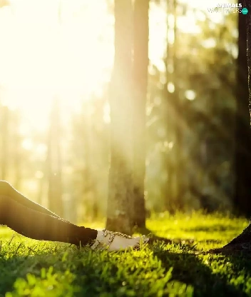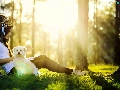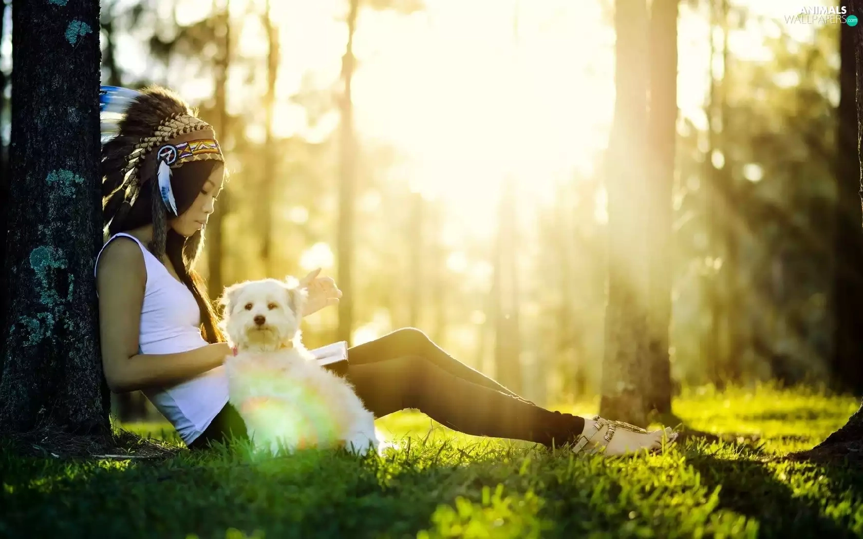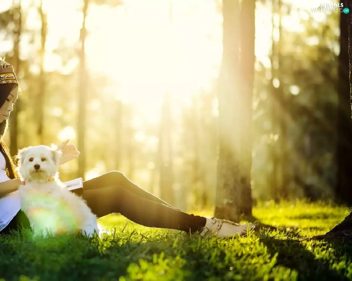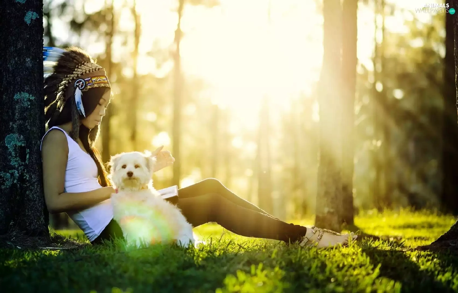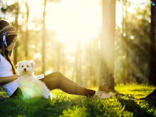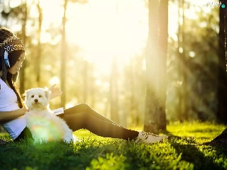 forest, plume, rays, doggy, girl, car in the meadow, sun