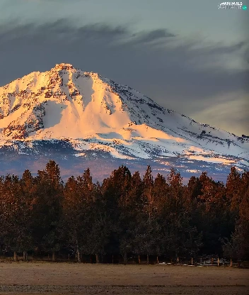 Mountains, Meadow, Horse, forest