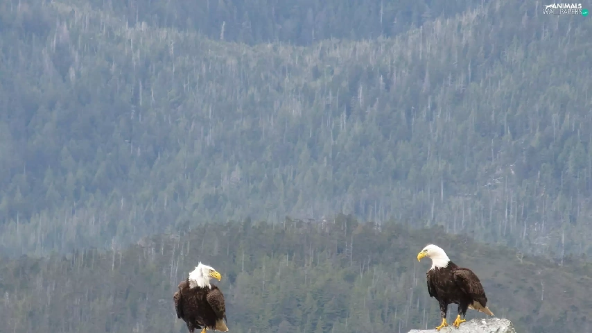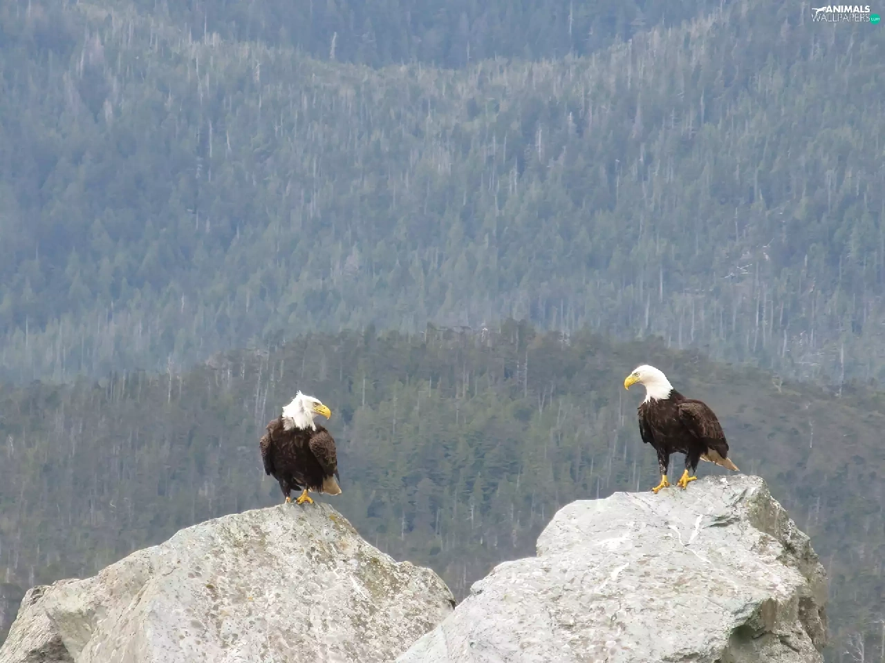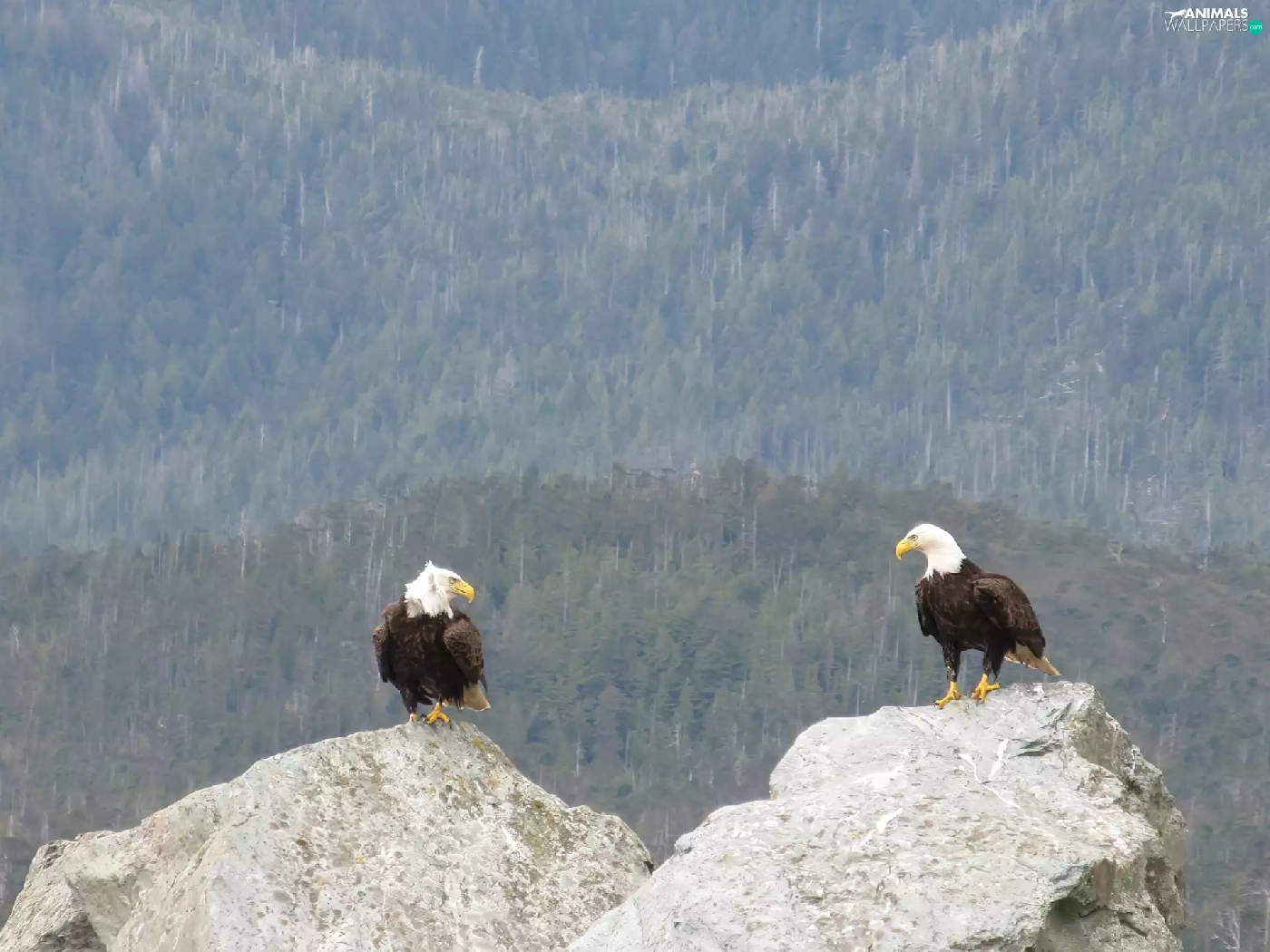 forest, Eagles, rocks