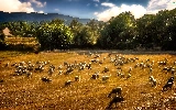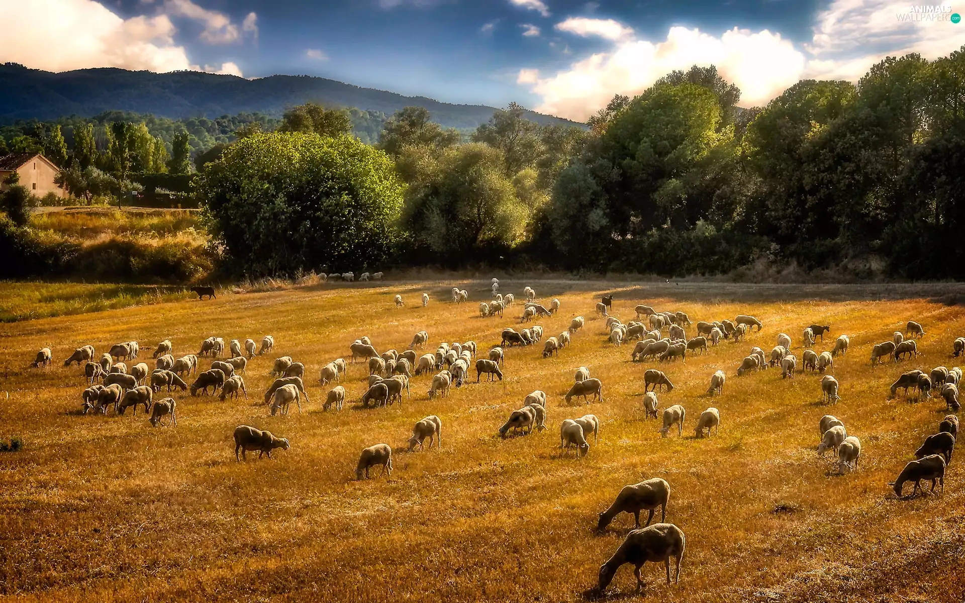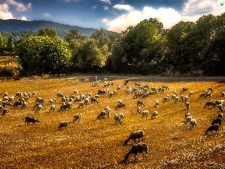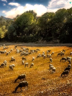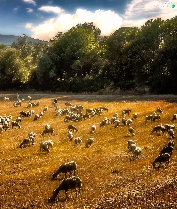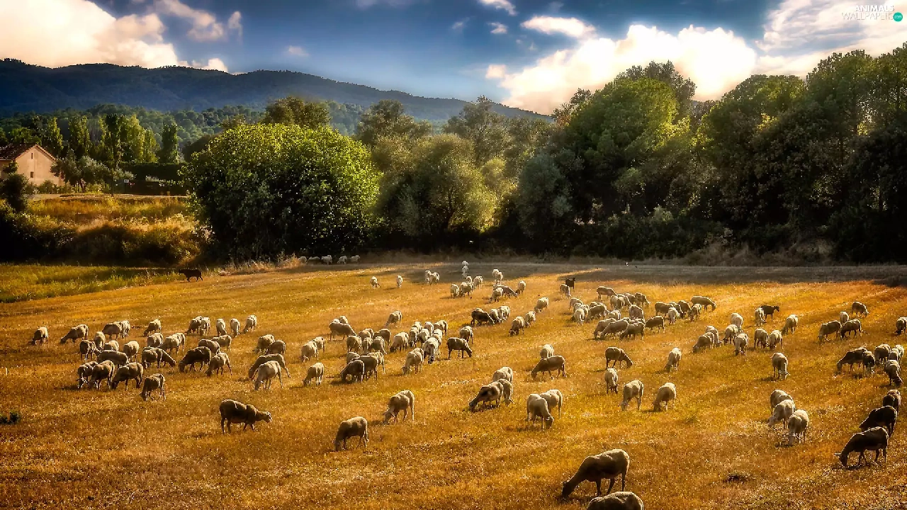 pasture, rams, Mountains, forest, Meadow, Sheep