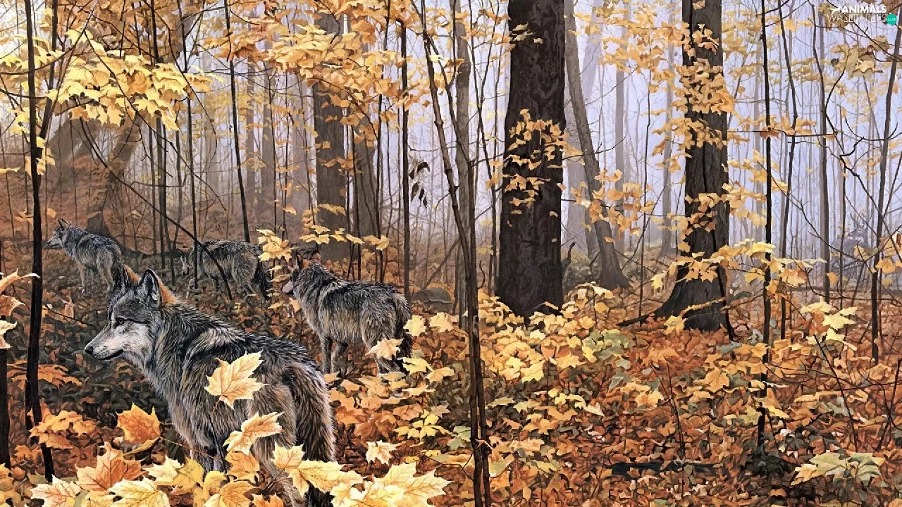 wolves, Yellow, Leaf, forest