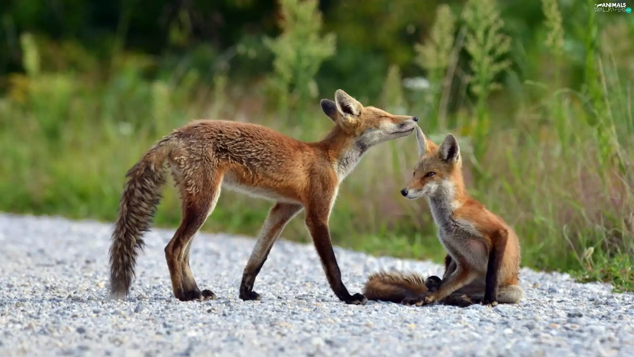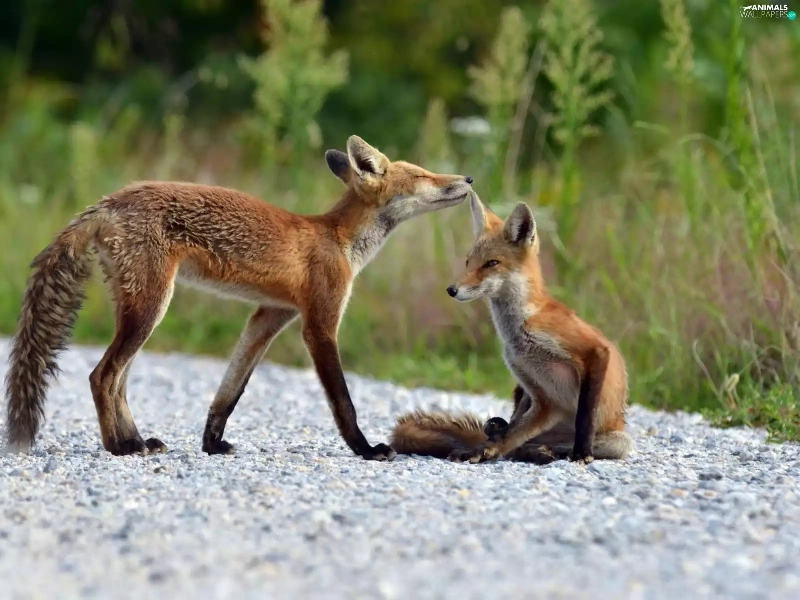 grass, Two cars, foxes