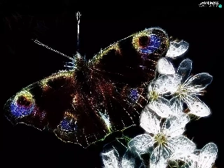 Flowers, butterfly, background, Fractalius, Black, White