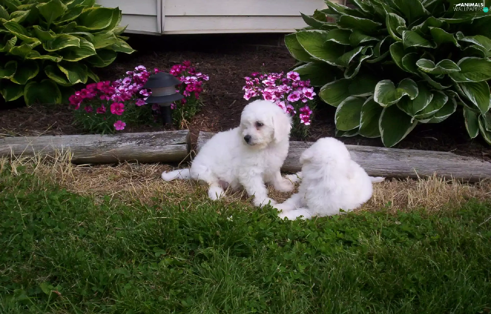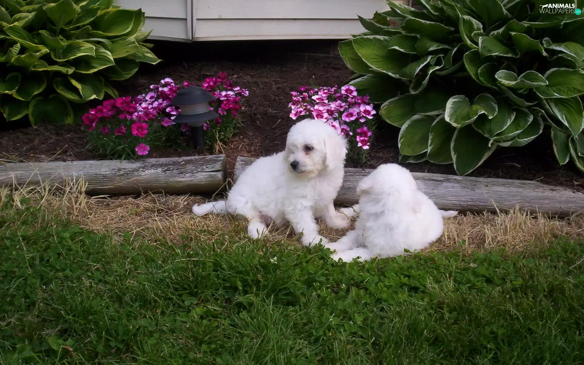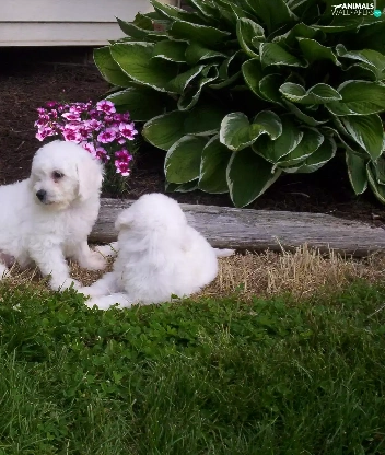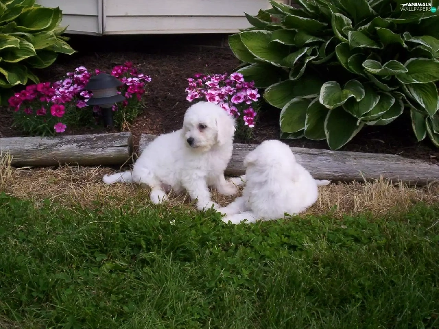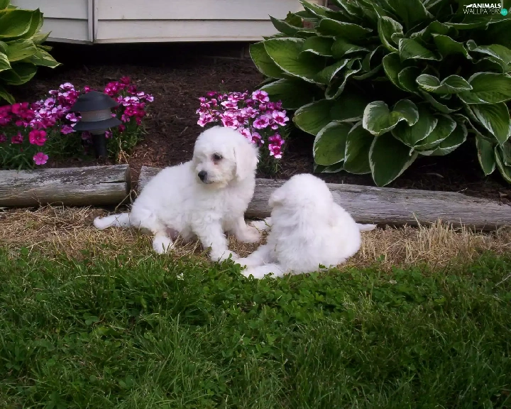 Two cars, Bichon frise, Garden, White