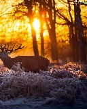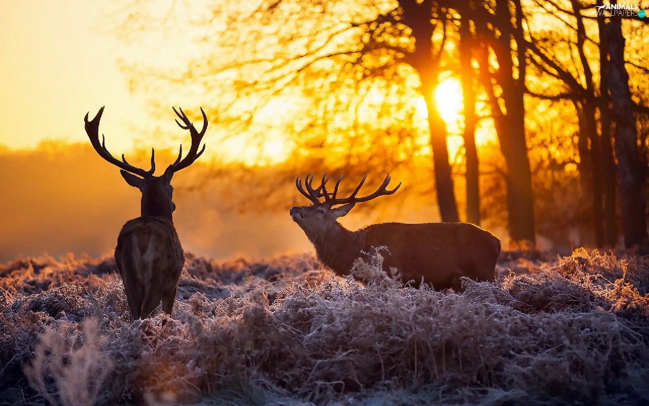 sun, forest, Meadow, luminosity, Przebijające, Deer, frosted, dawn, flash, ligh