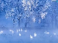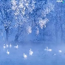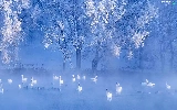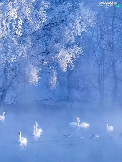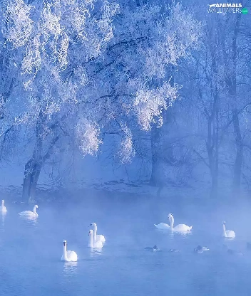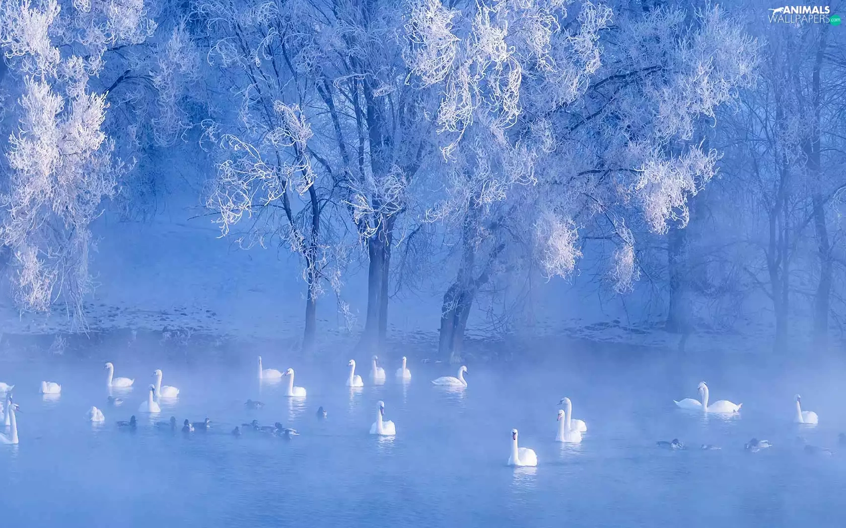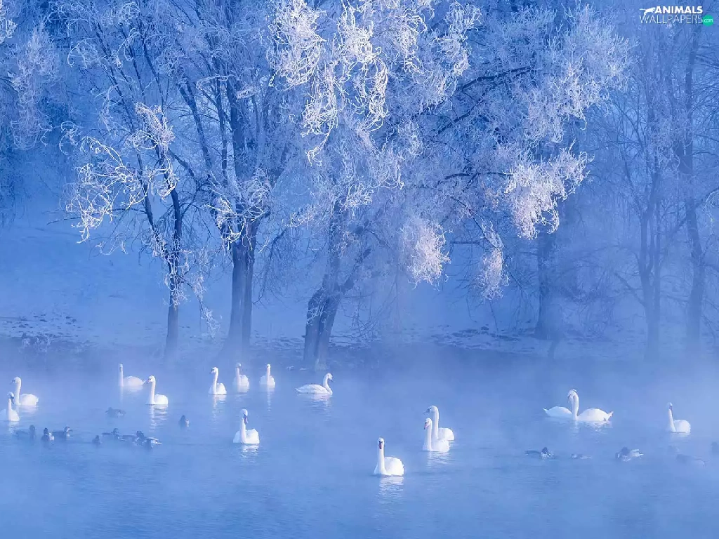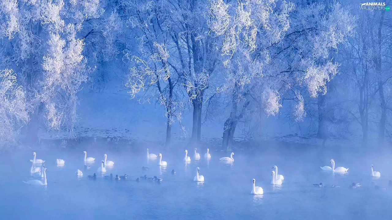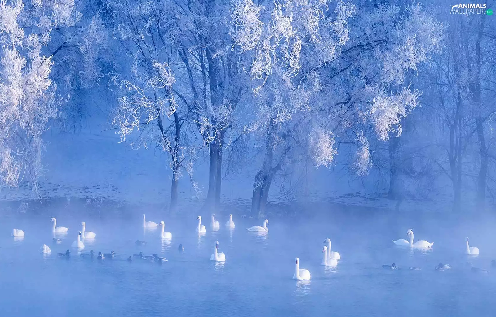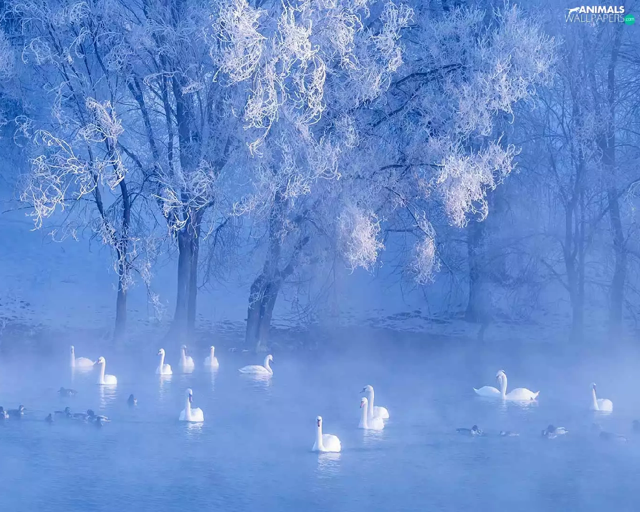 Fog, Swan, viewes, ducks, trees, lake, winter, frosty