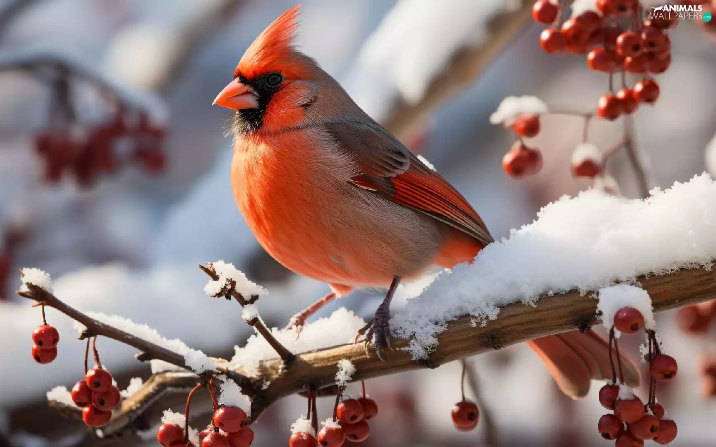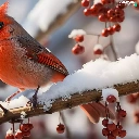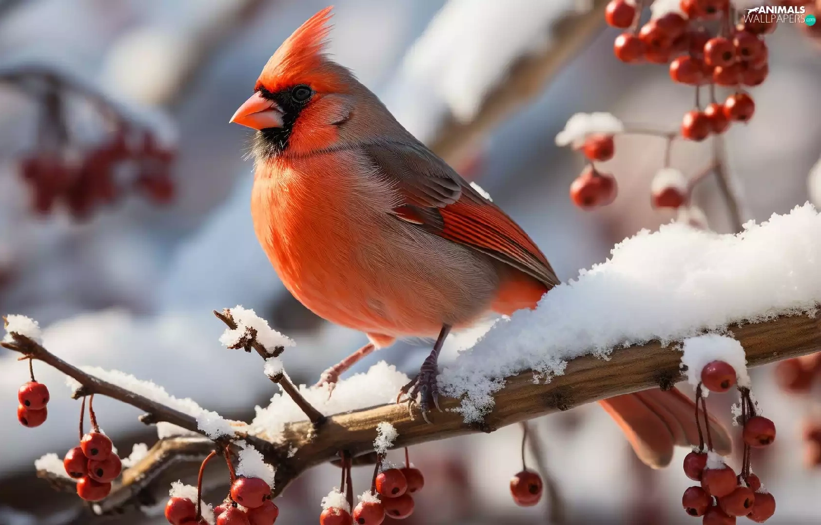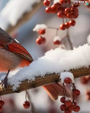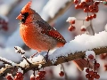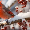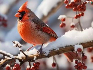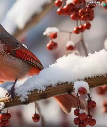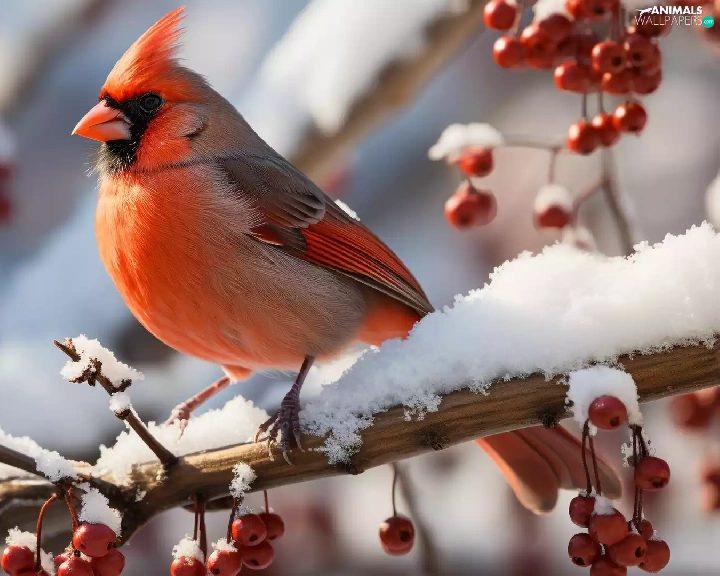 snow, Bird, Red, Fruits, Twigs, Northern Cardinal