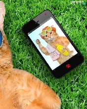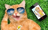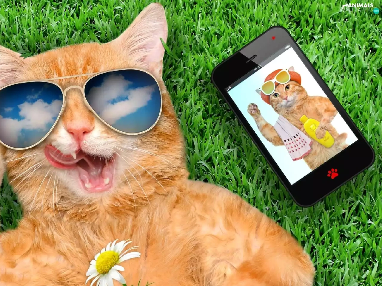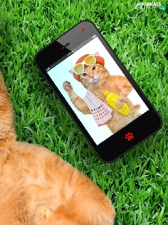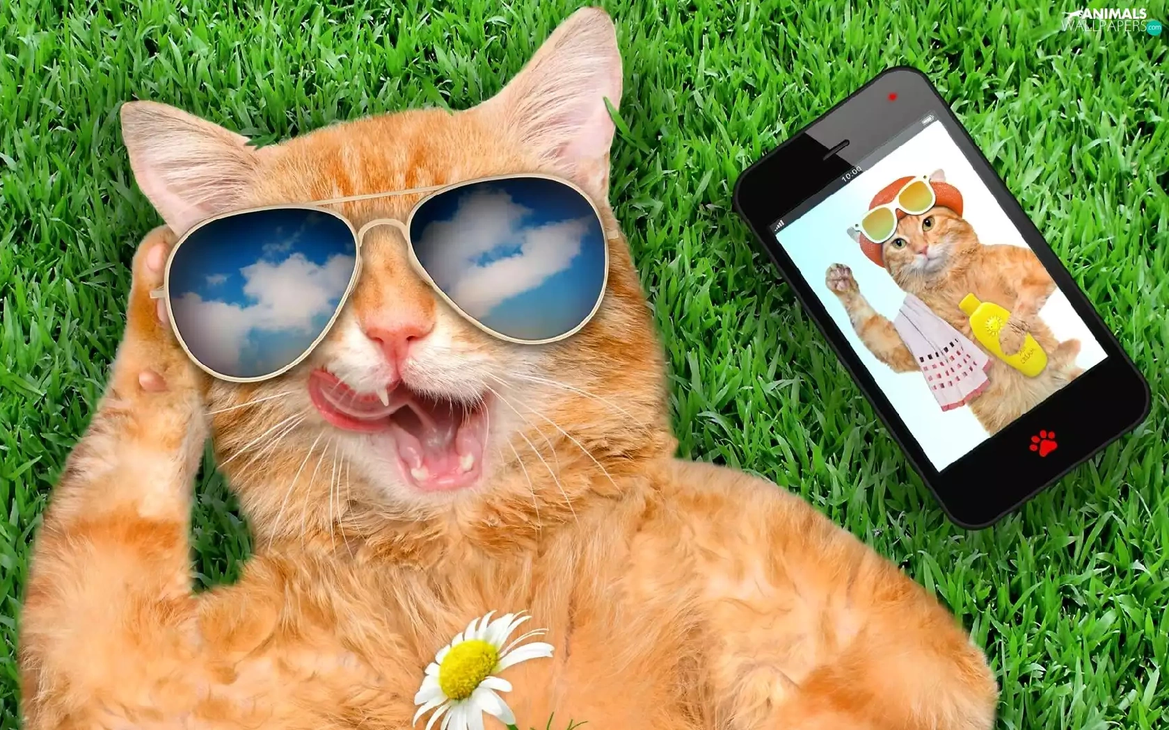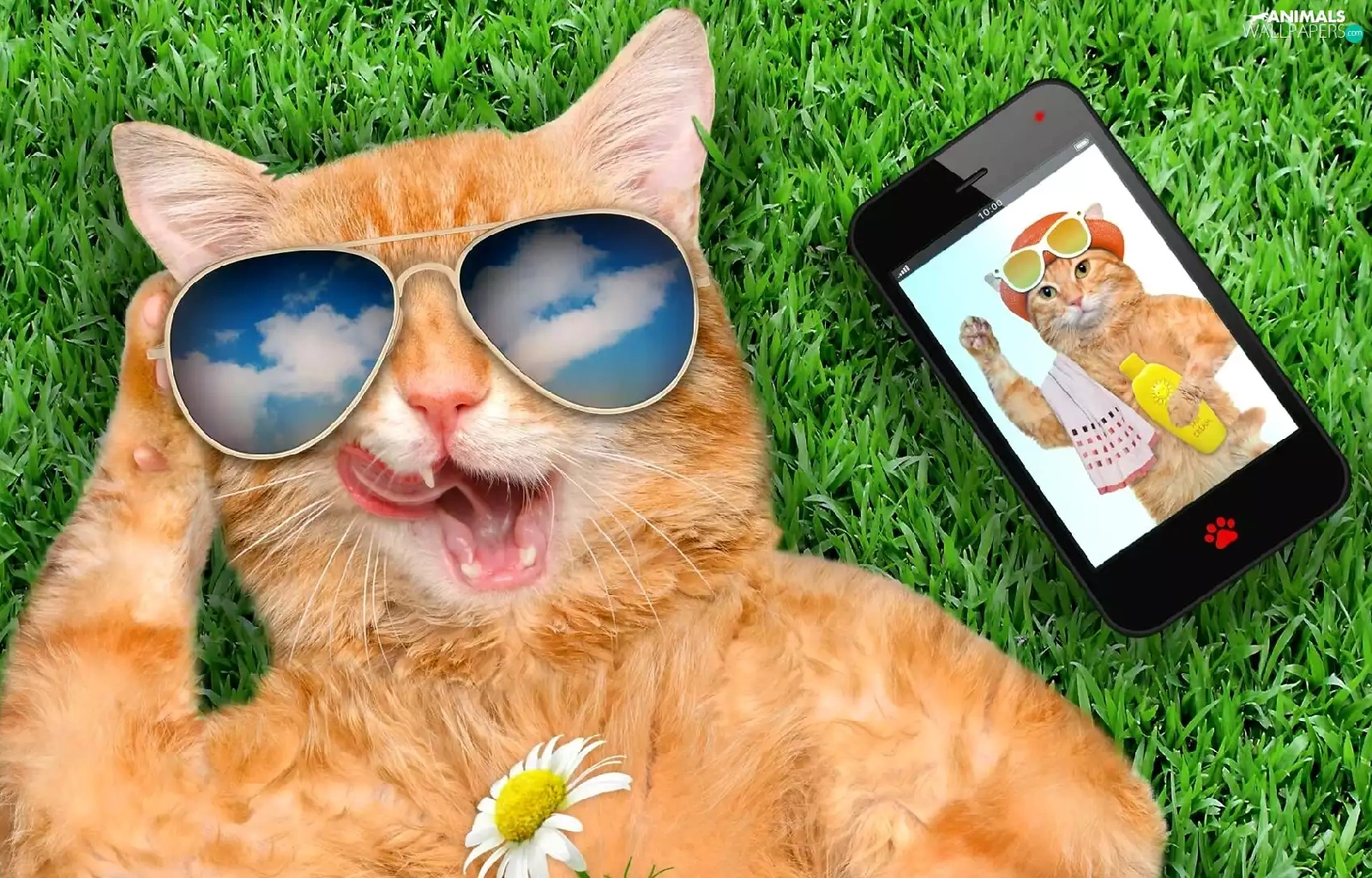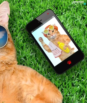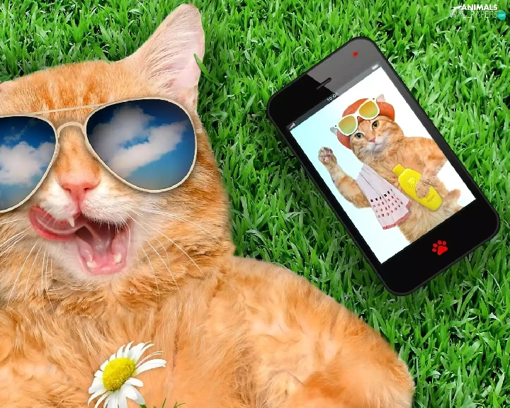 grass, Funny, Glasses, Telephone, cat