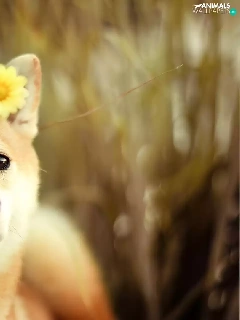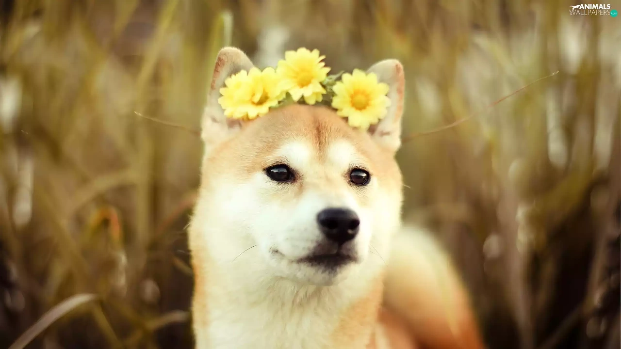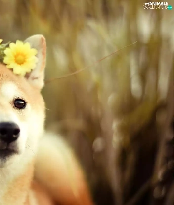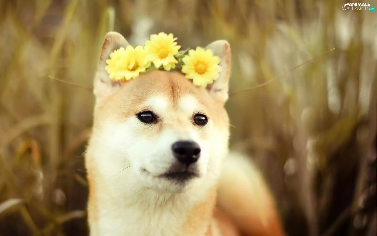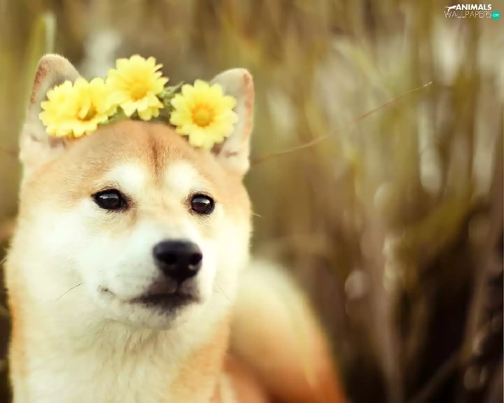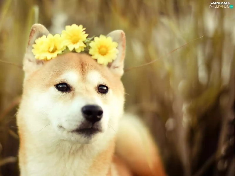 Yellow, gerberas, Akita, Inu, dog