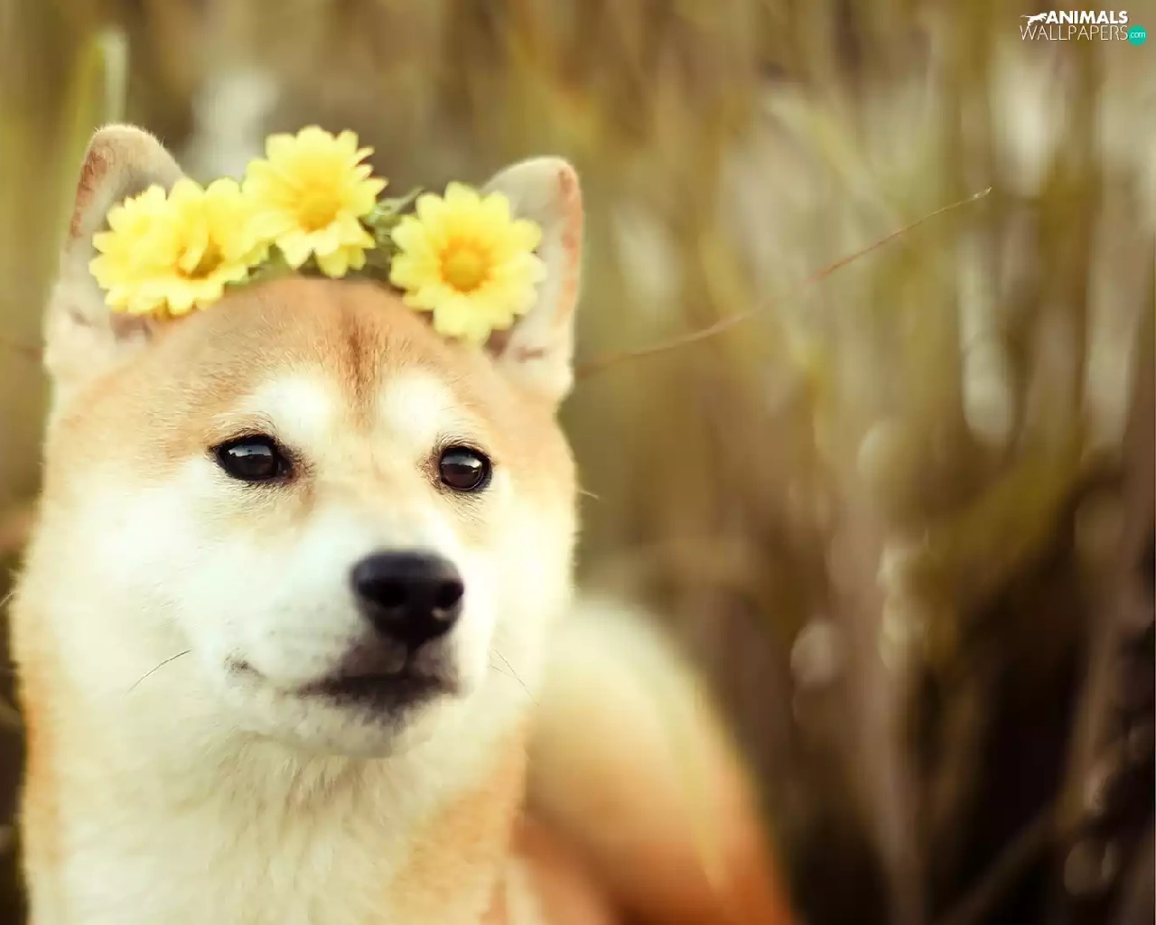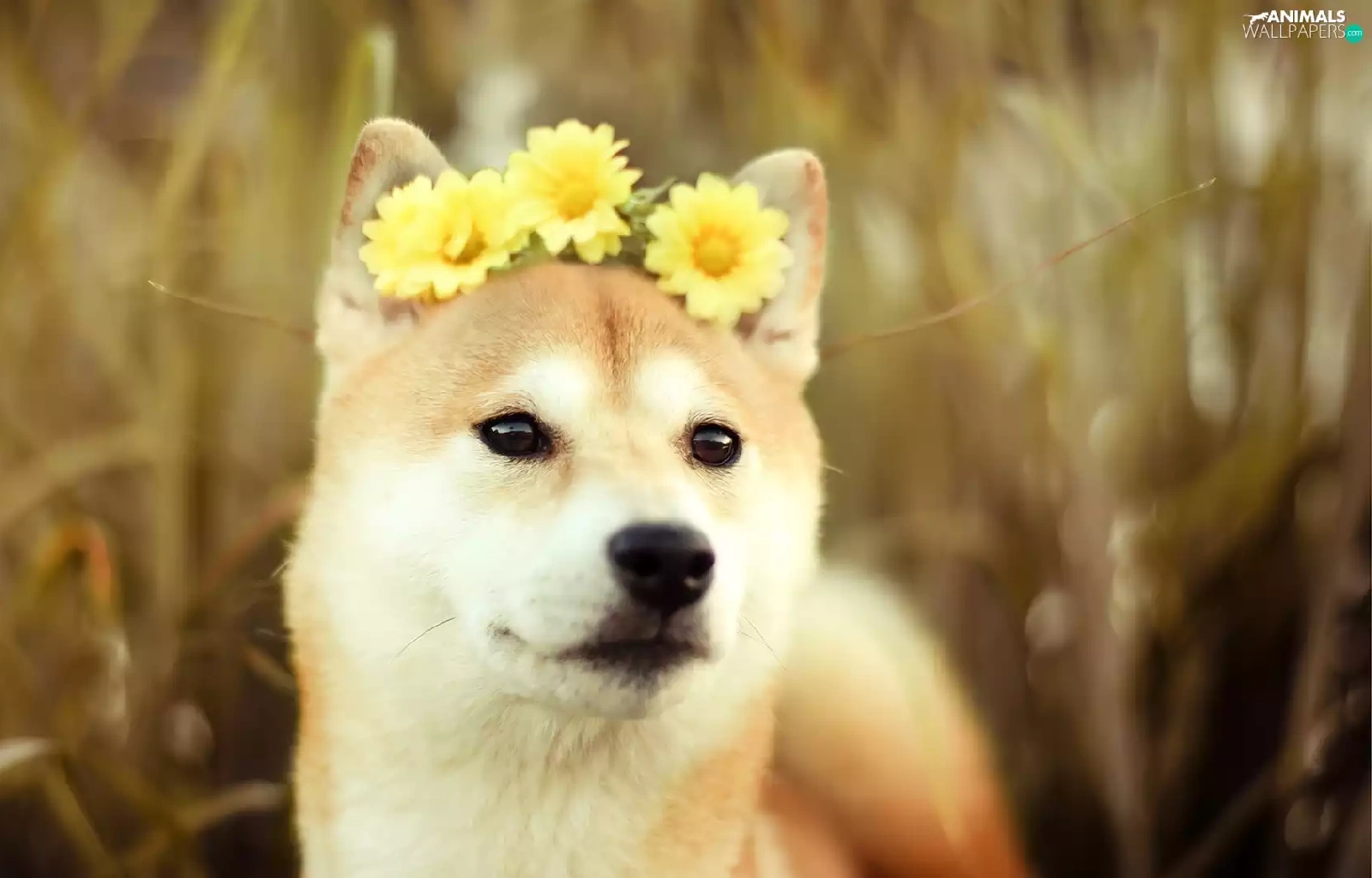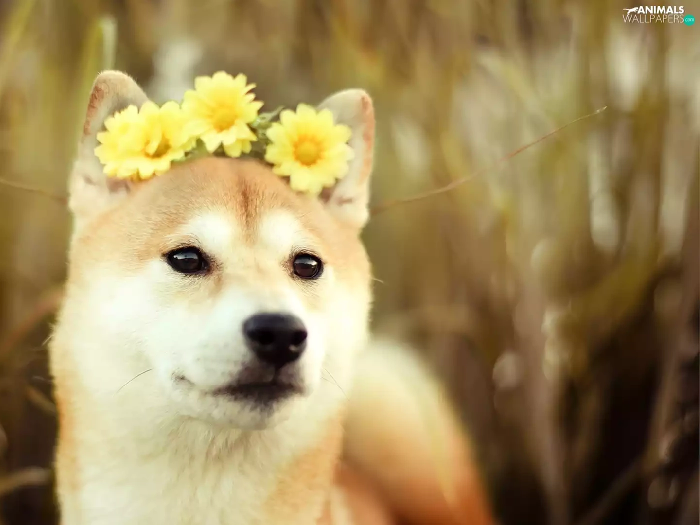Yellow, gerberas, Akita, Inu, dog