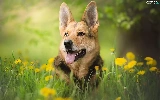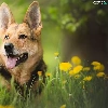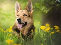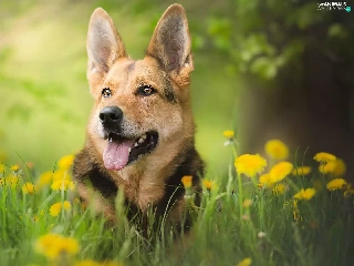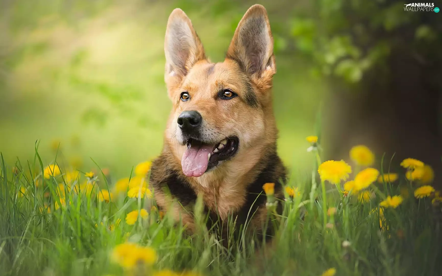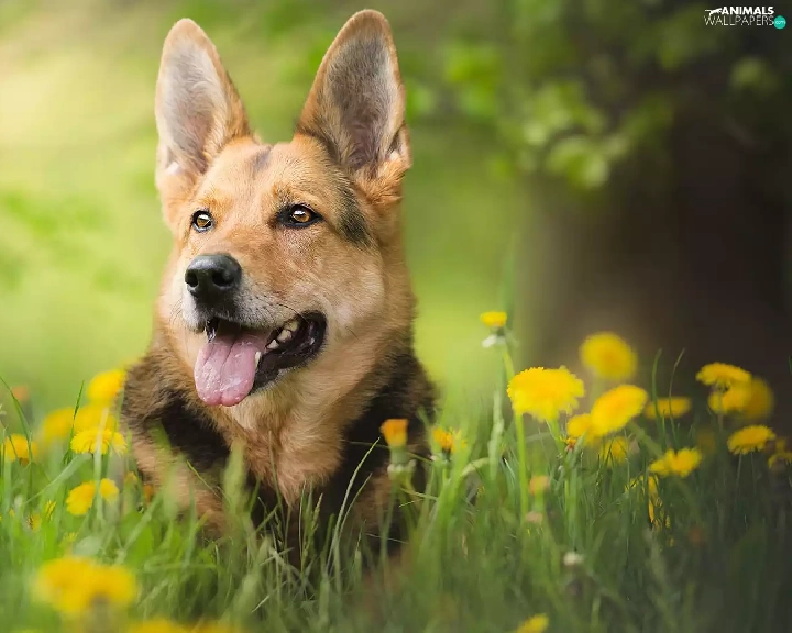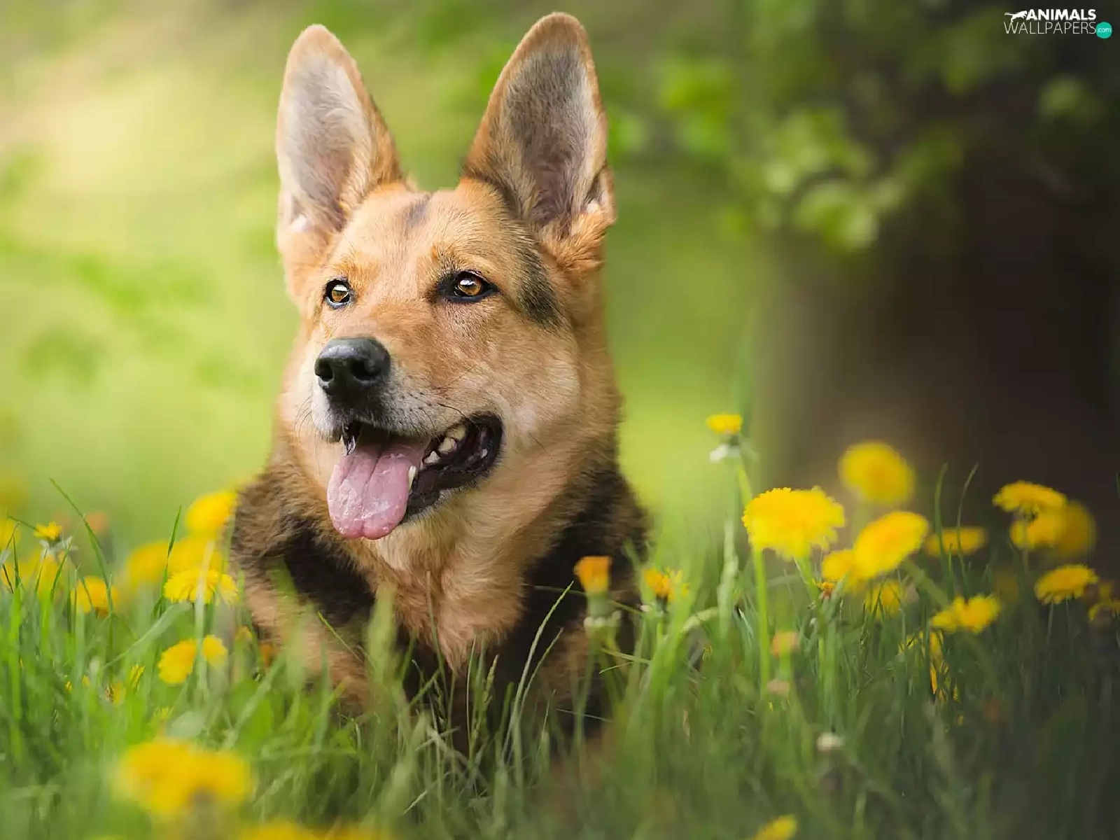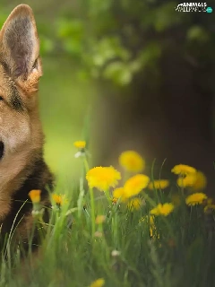 Meadow, Common Dandelion, German Shepherd, muzzle, dog
