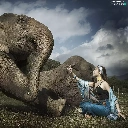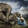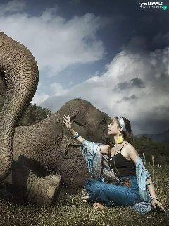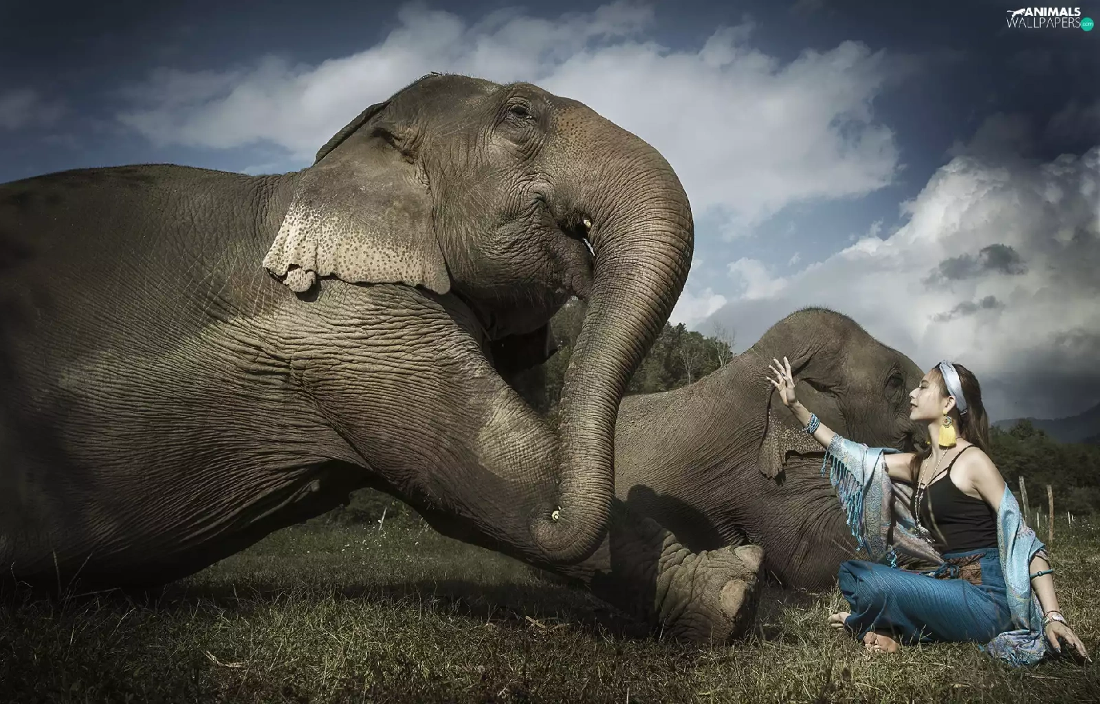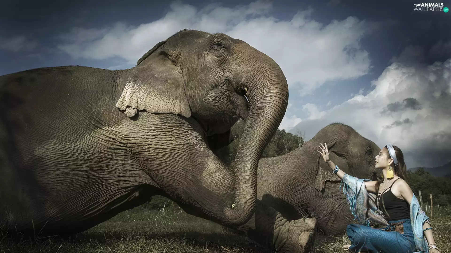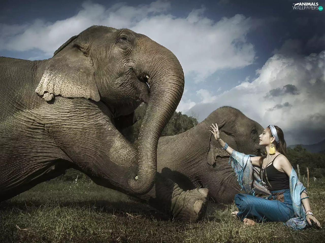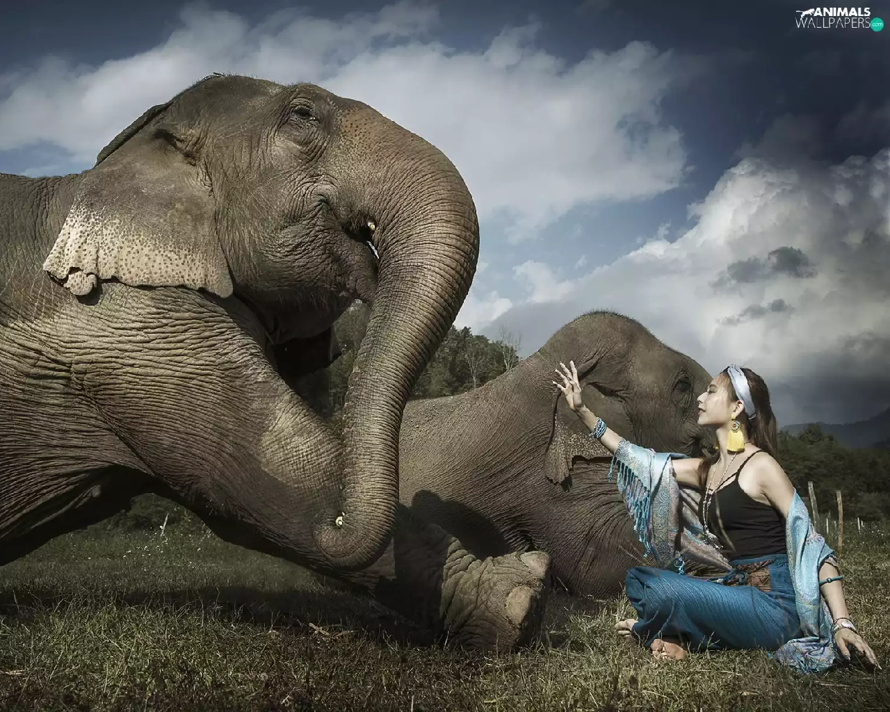 grass, sitting, viewes, girl, Elephants, trees, Sky