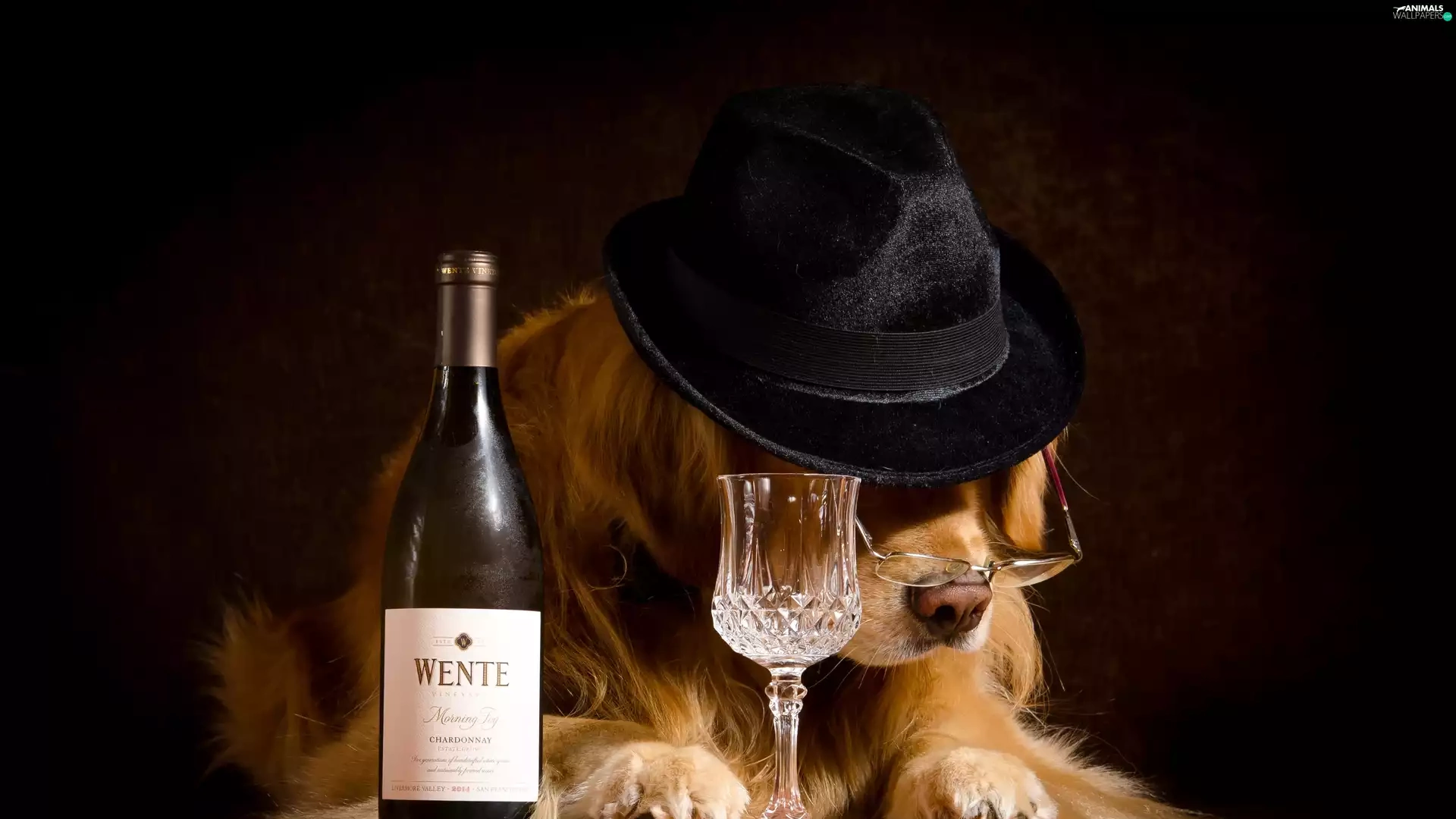 Hat, Funny, Wines, glass, Bottle, dog