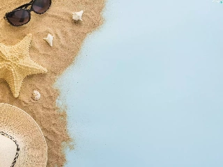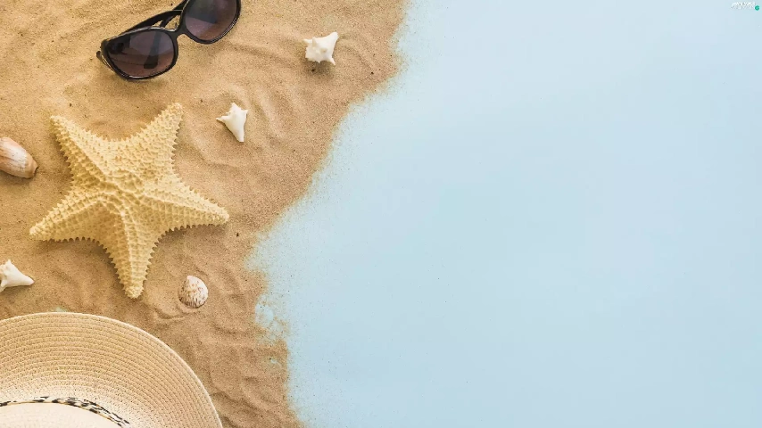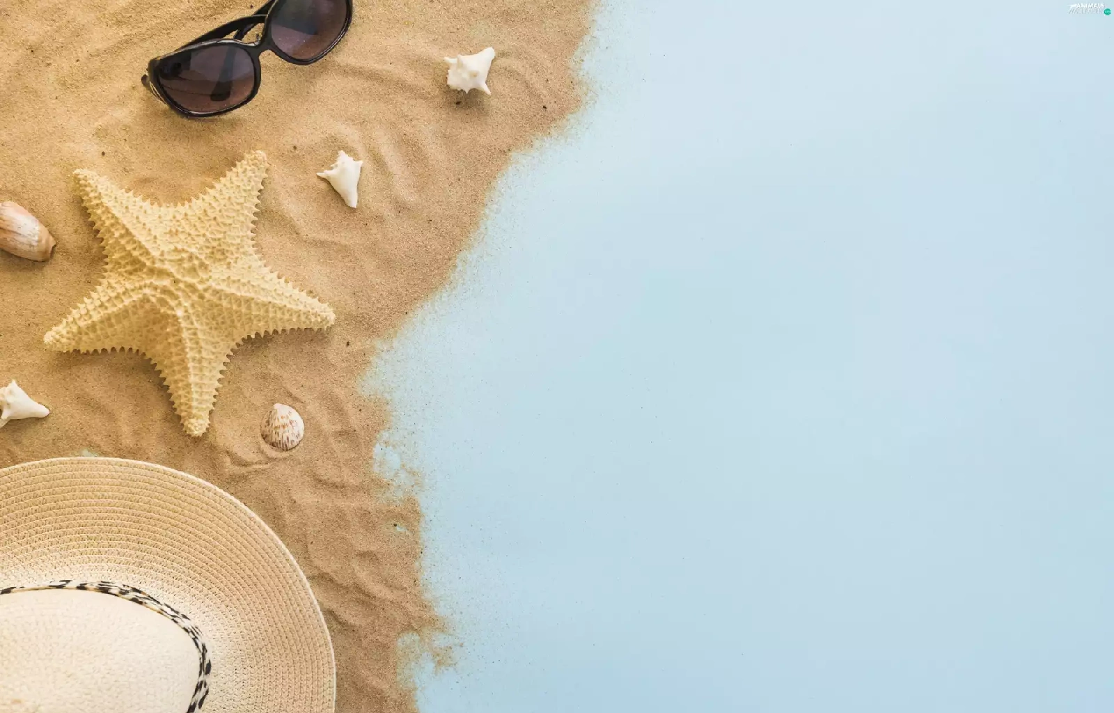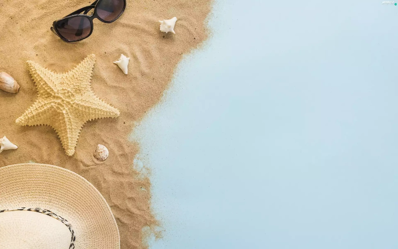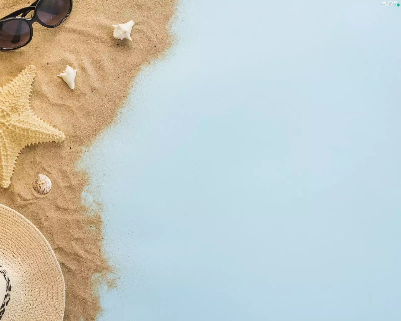 Shells, Hat, background, Glasses, holiday, starfish, Blue