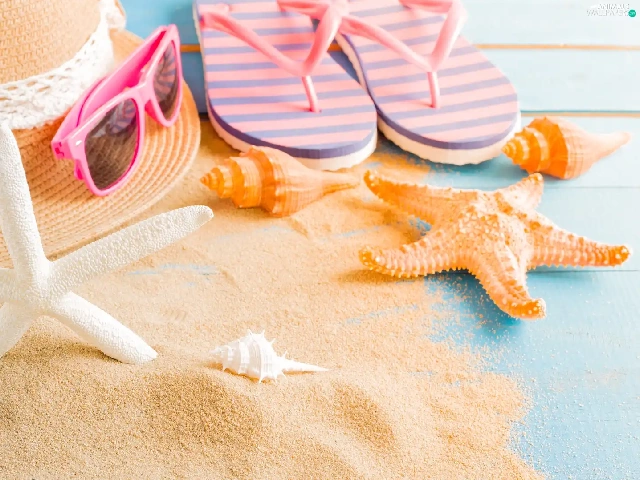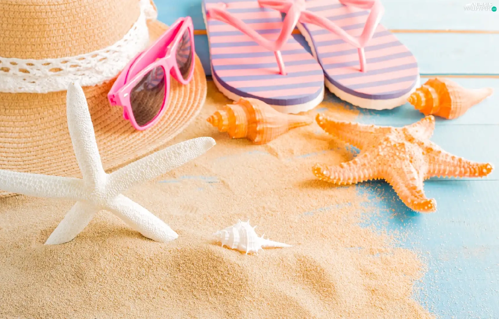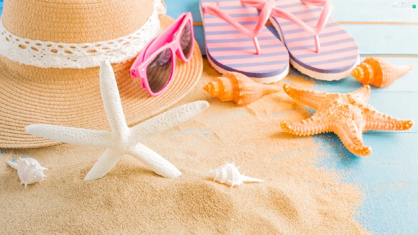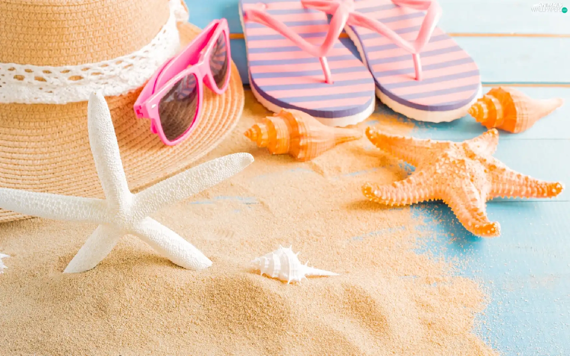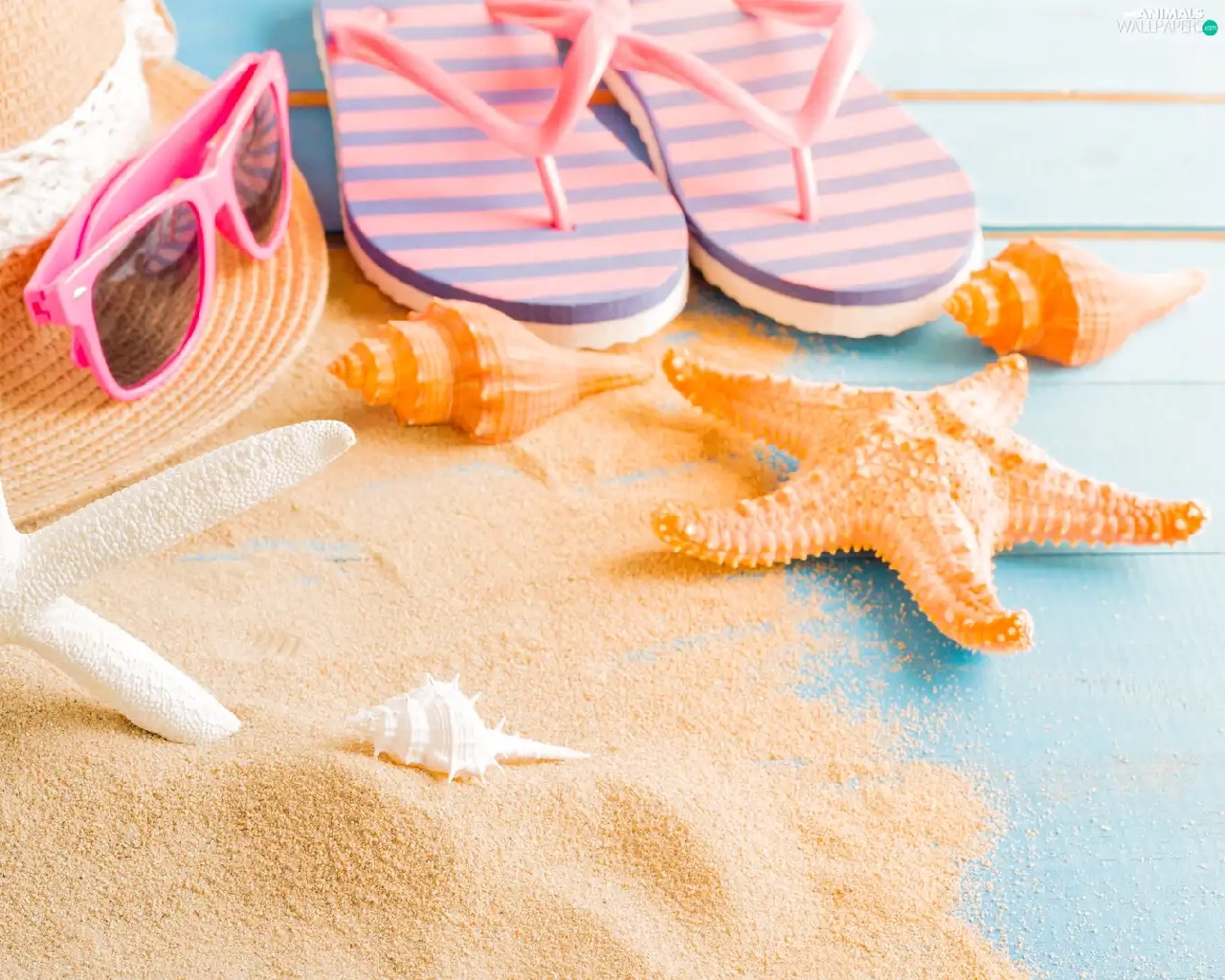 Flaps, Hat, starfish, Glasses, Sand, Shells, summer