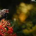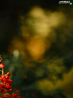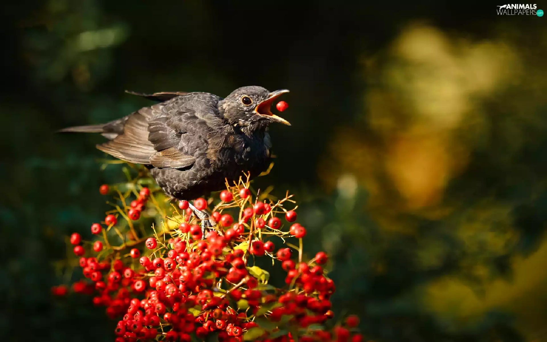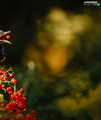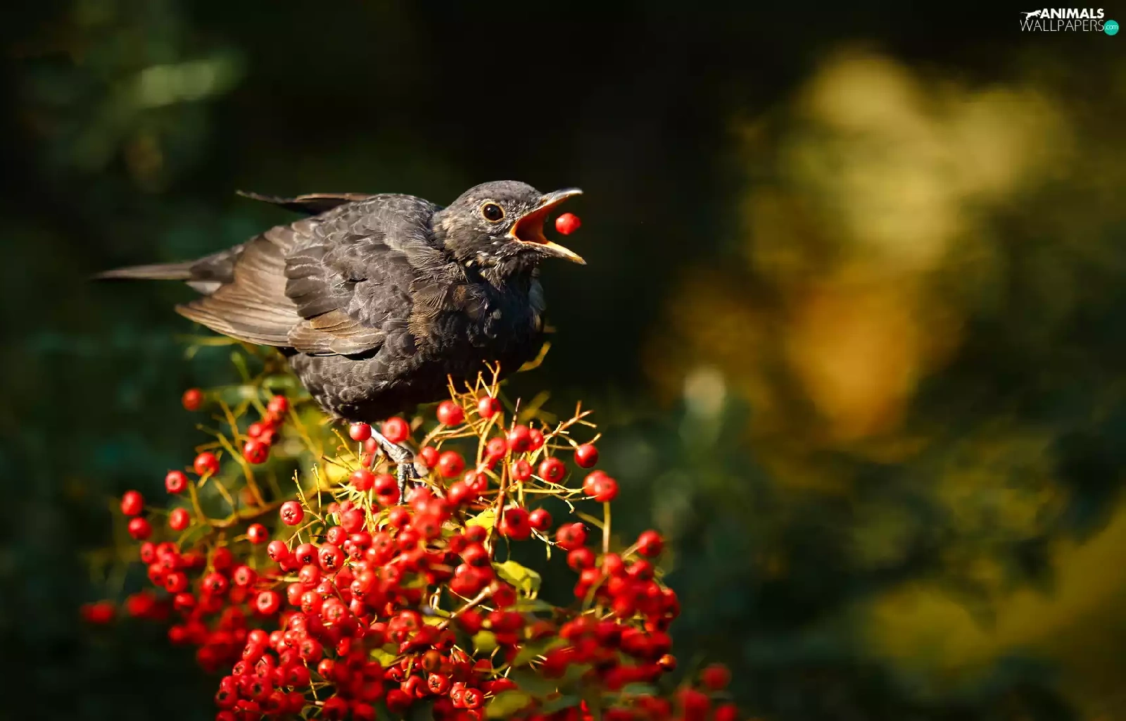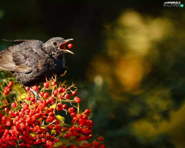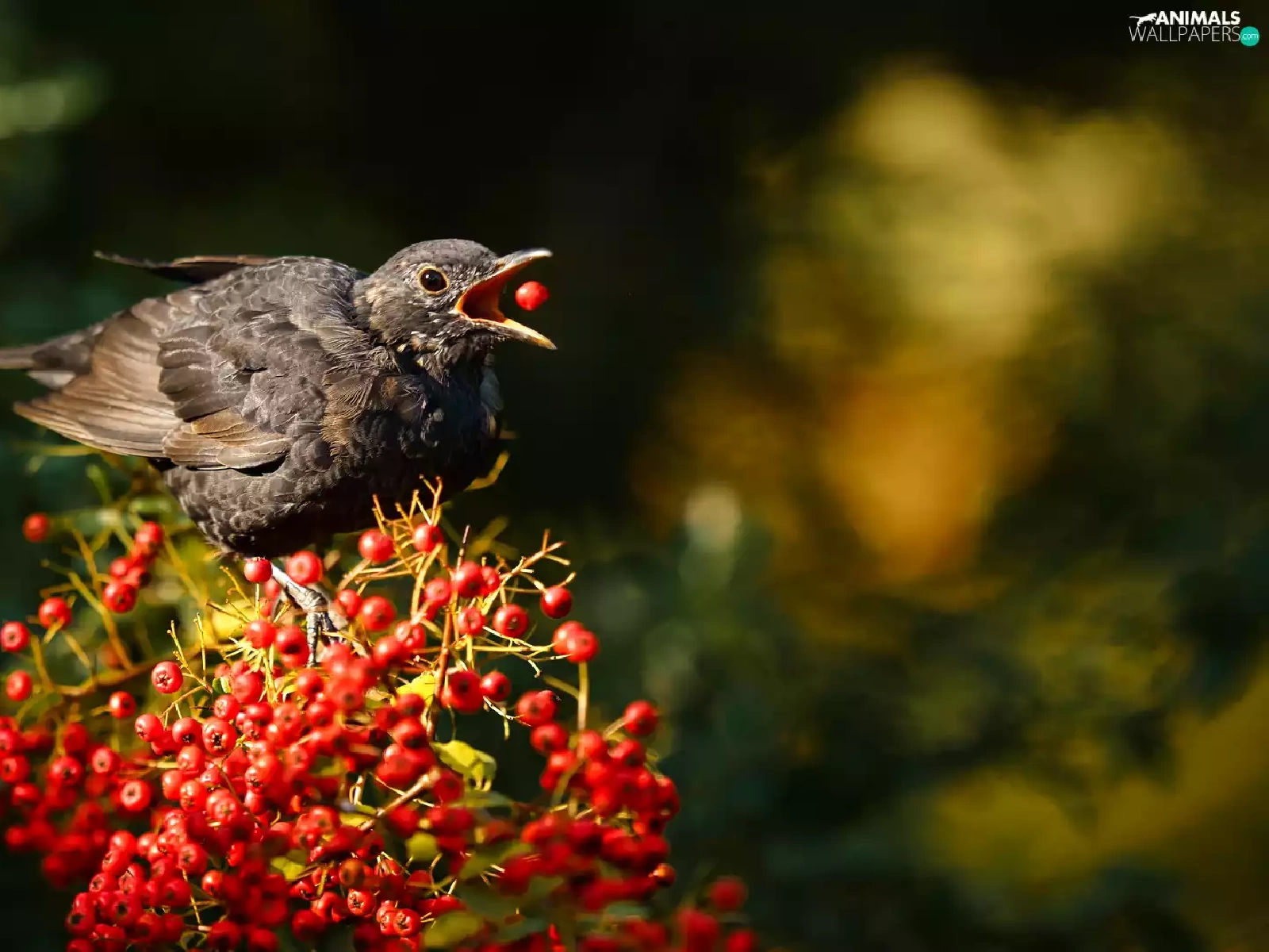 Red, Bird, blueberries, glimmer, Fruits, Blackbird