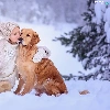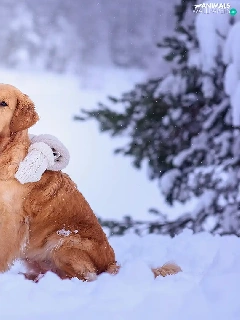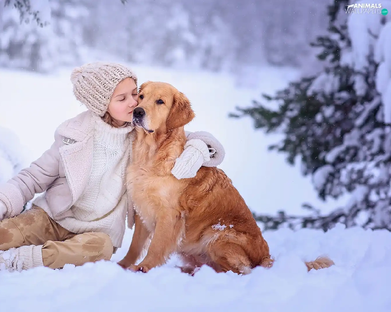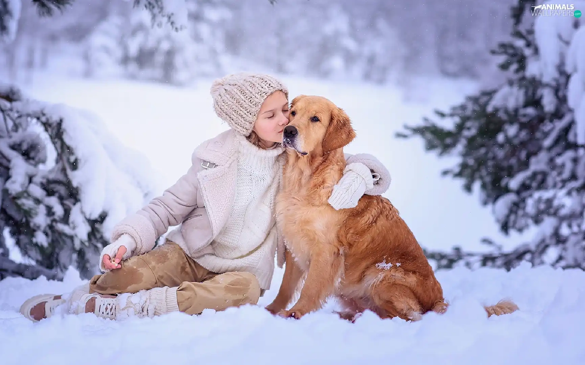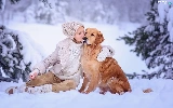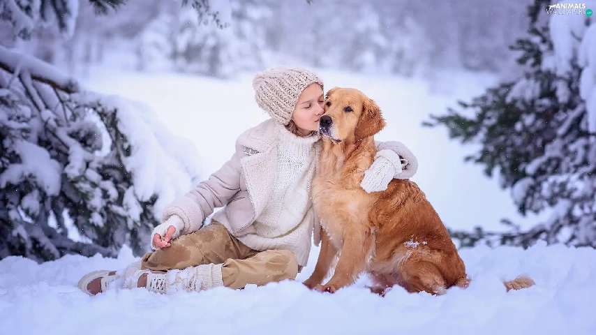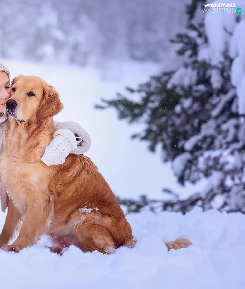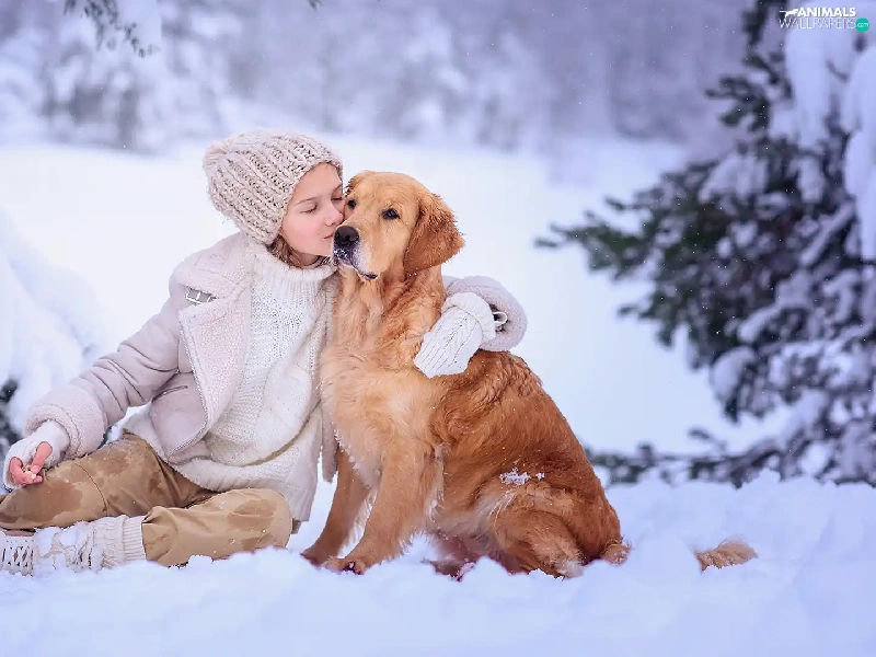 Golden Retriever, Snowy, winter, trees, snow, dog, girl, viewes