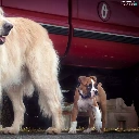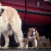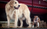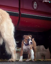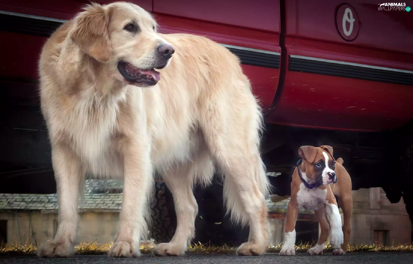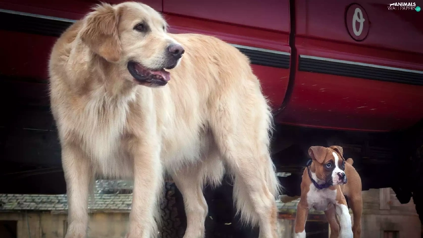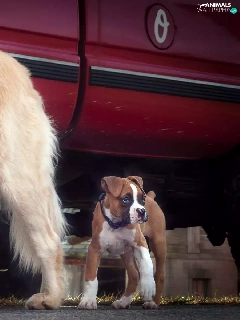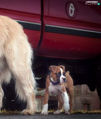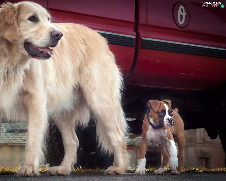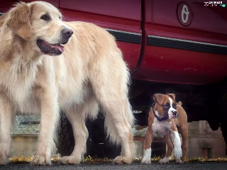 Two cars, boxer, Golden Retriever, Dogs