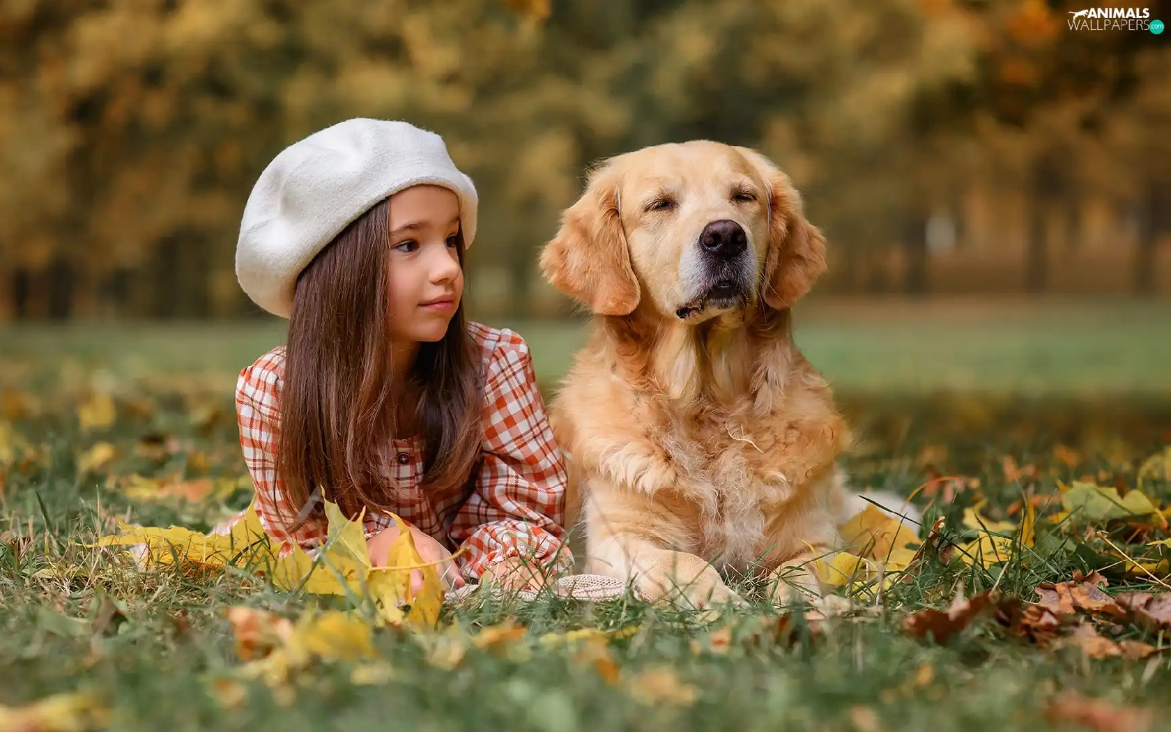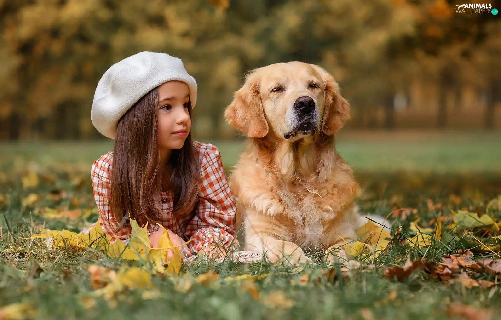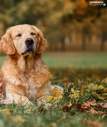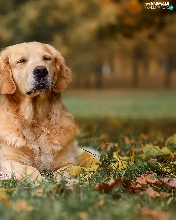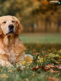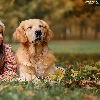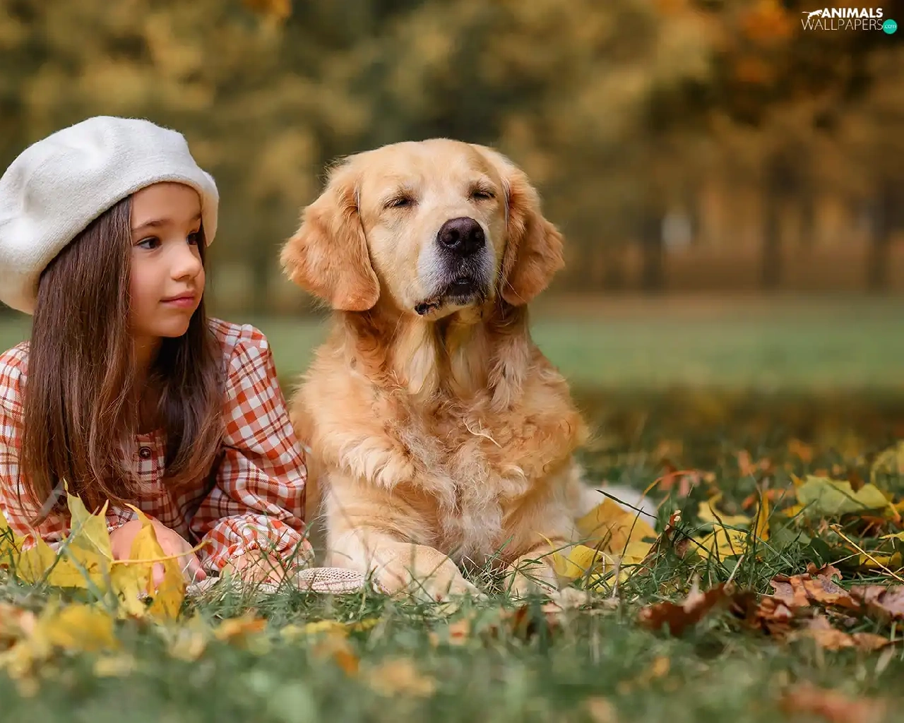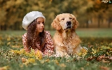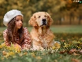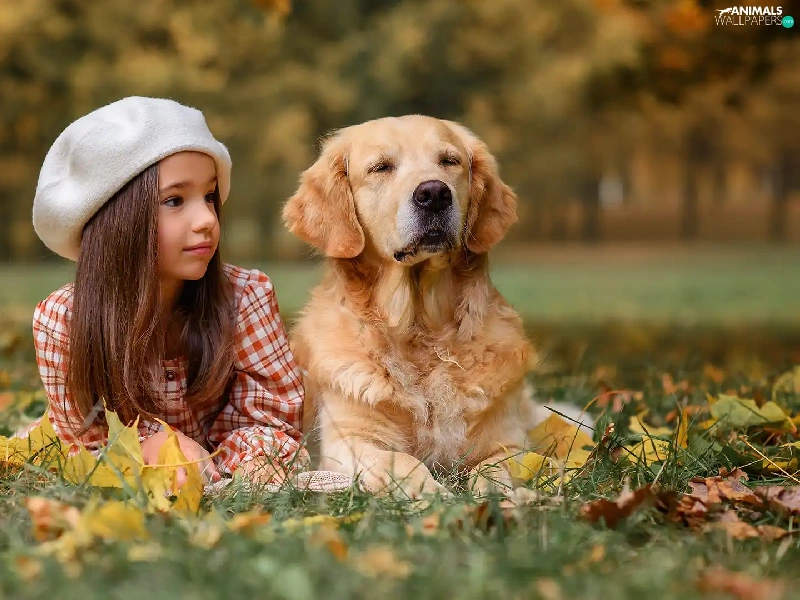 Meadow, autumn, dog, Golden Retriever, girl