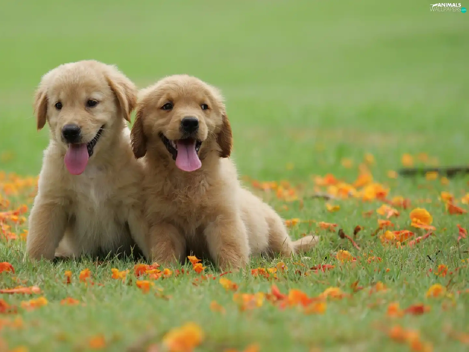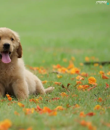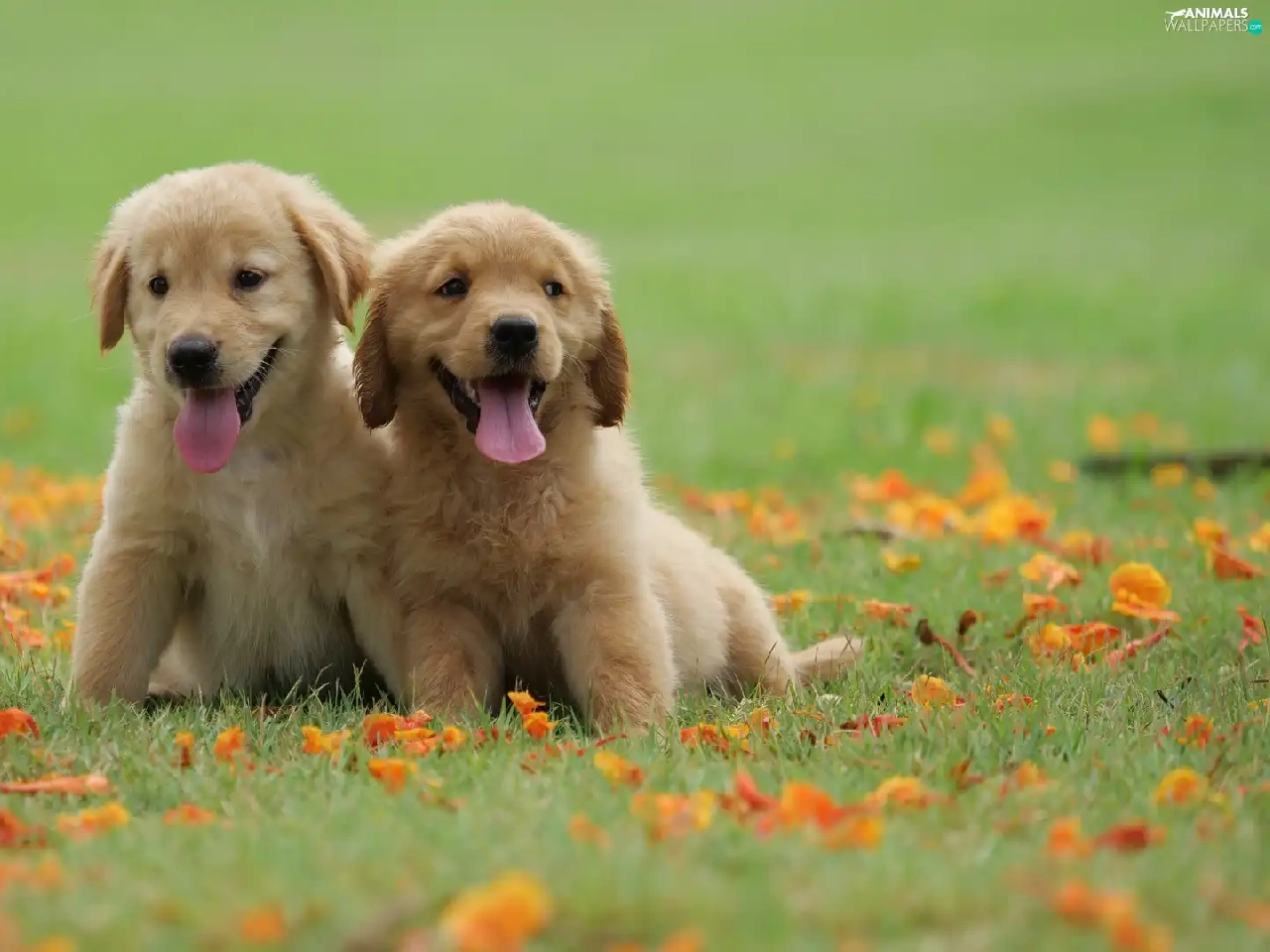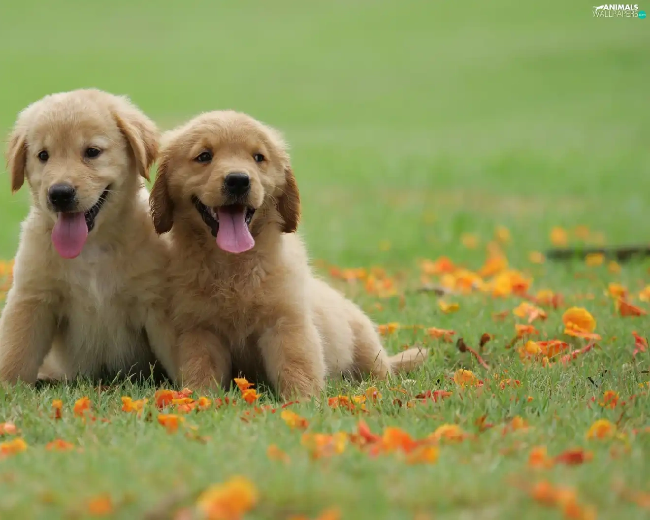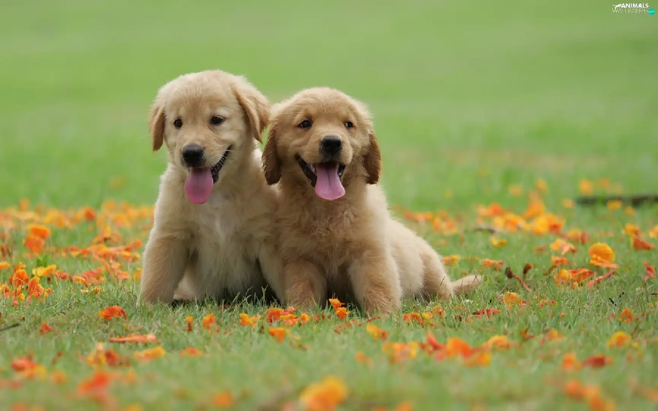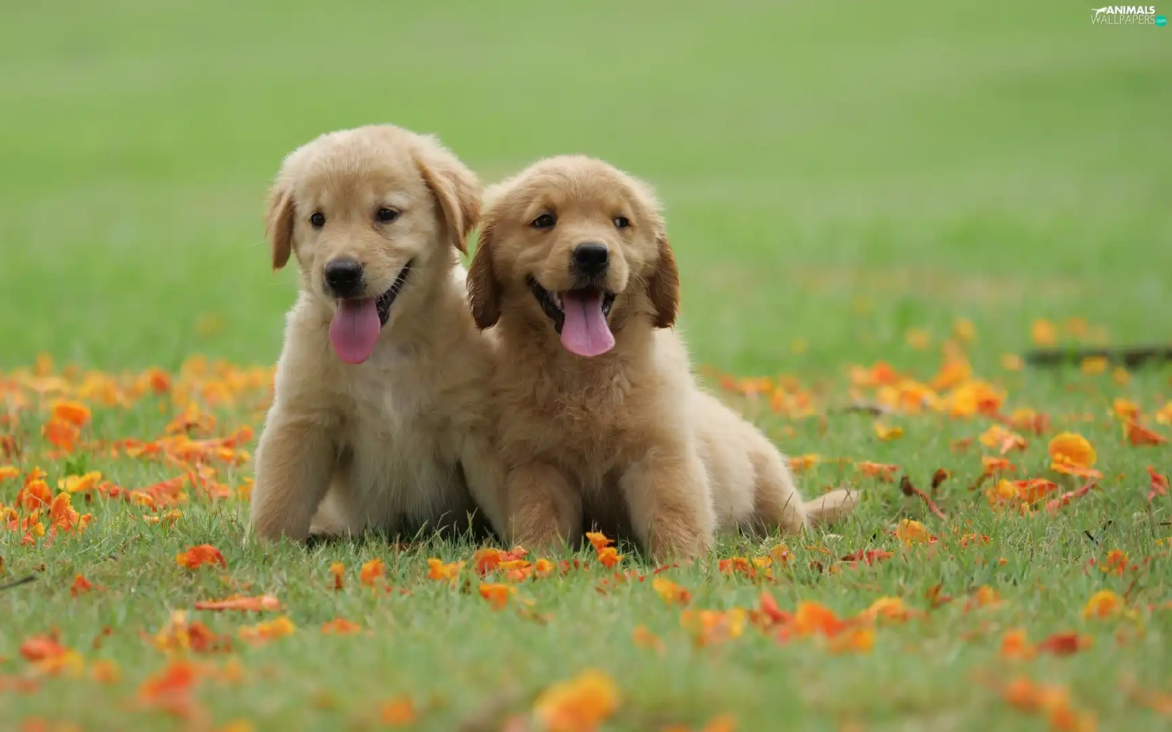 Meadow, Leaf, puppies, Golden Retriever, Two cars