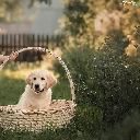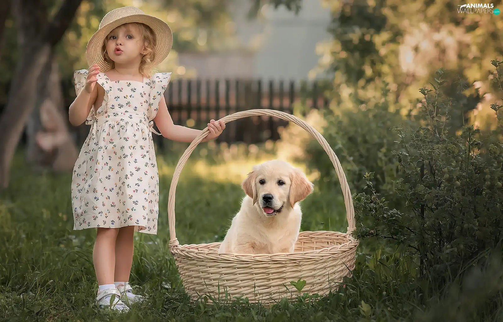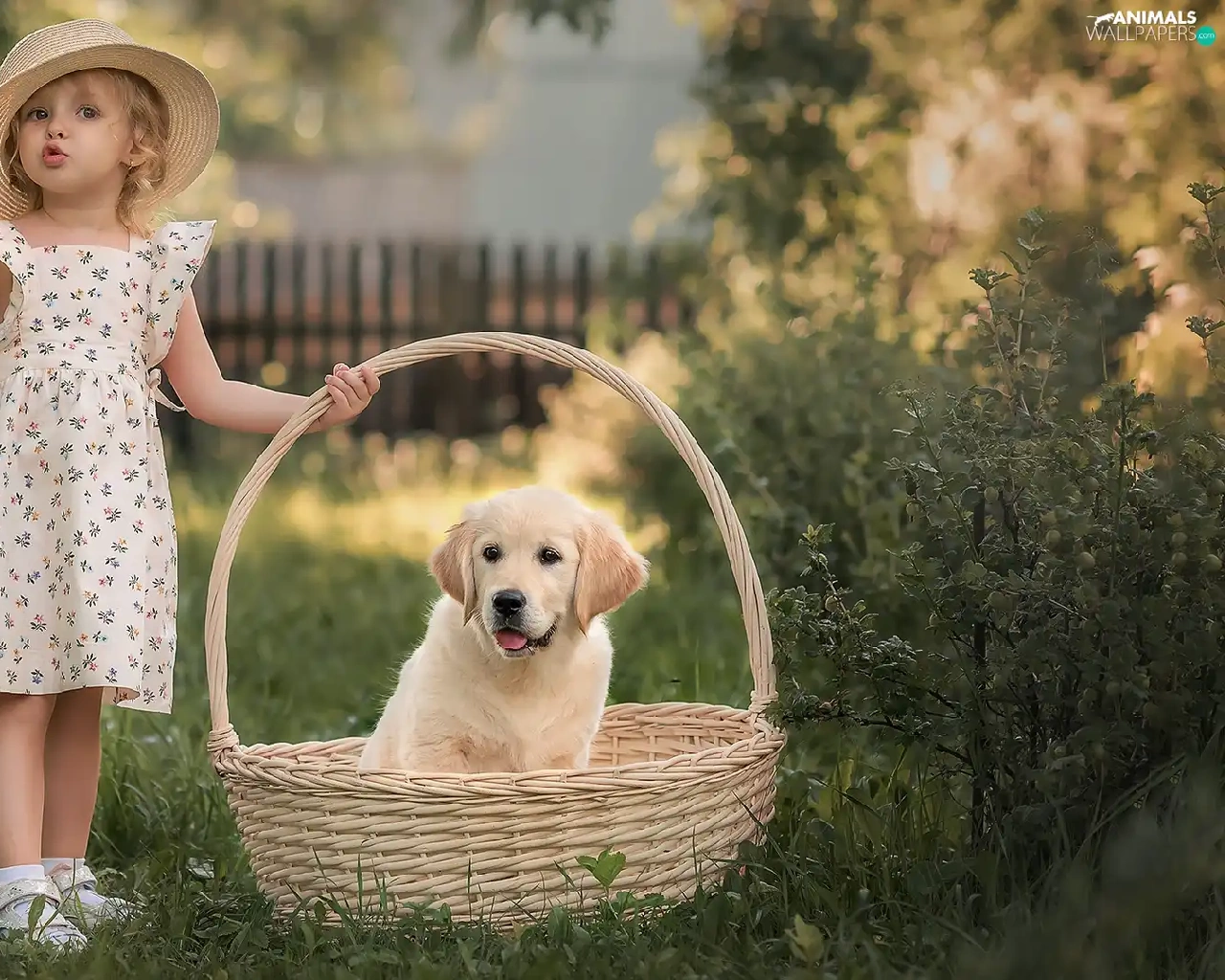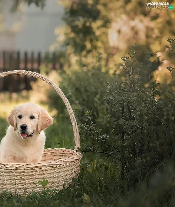basket, girl, Puppy, Golden Retriever, dog, Hat