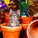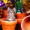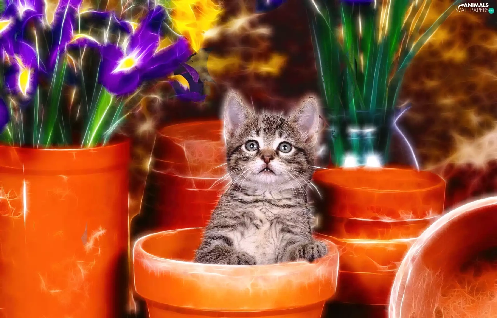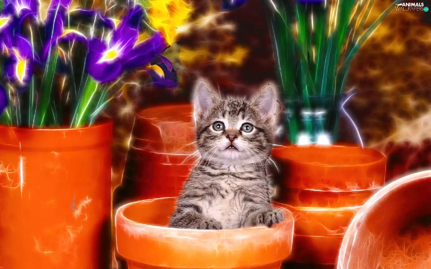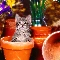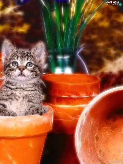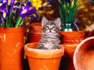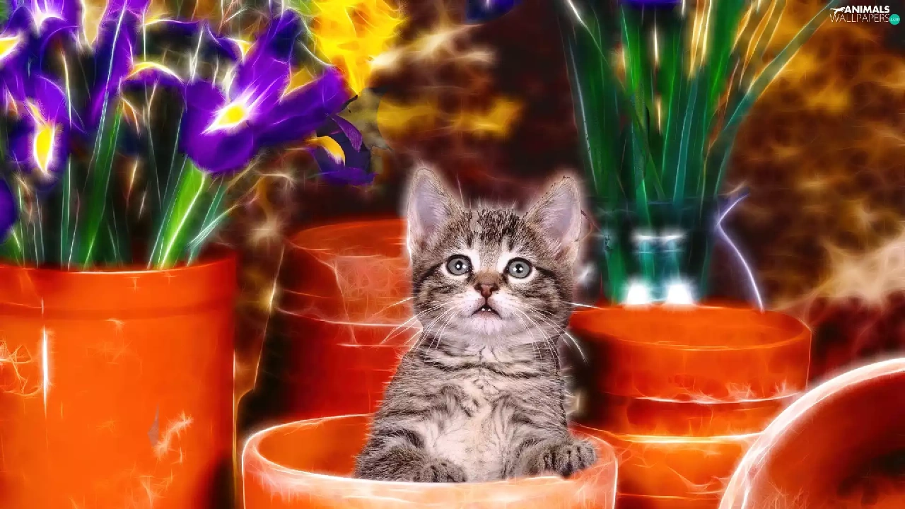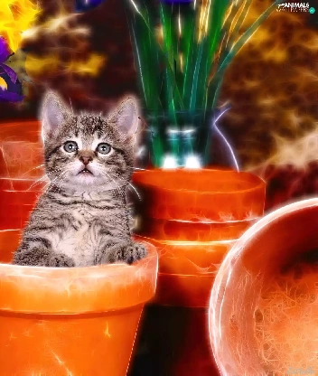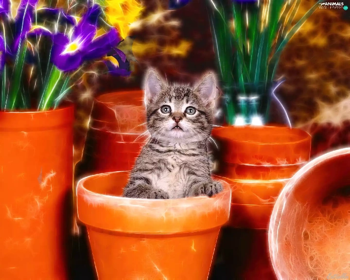 kitten, honeyed, Flowers, graphics, Pots, small