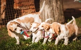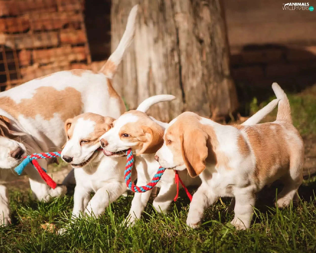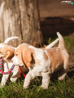 puppies, grass, Beagle, Three, Dogs