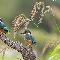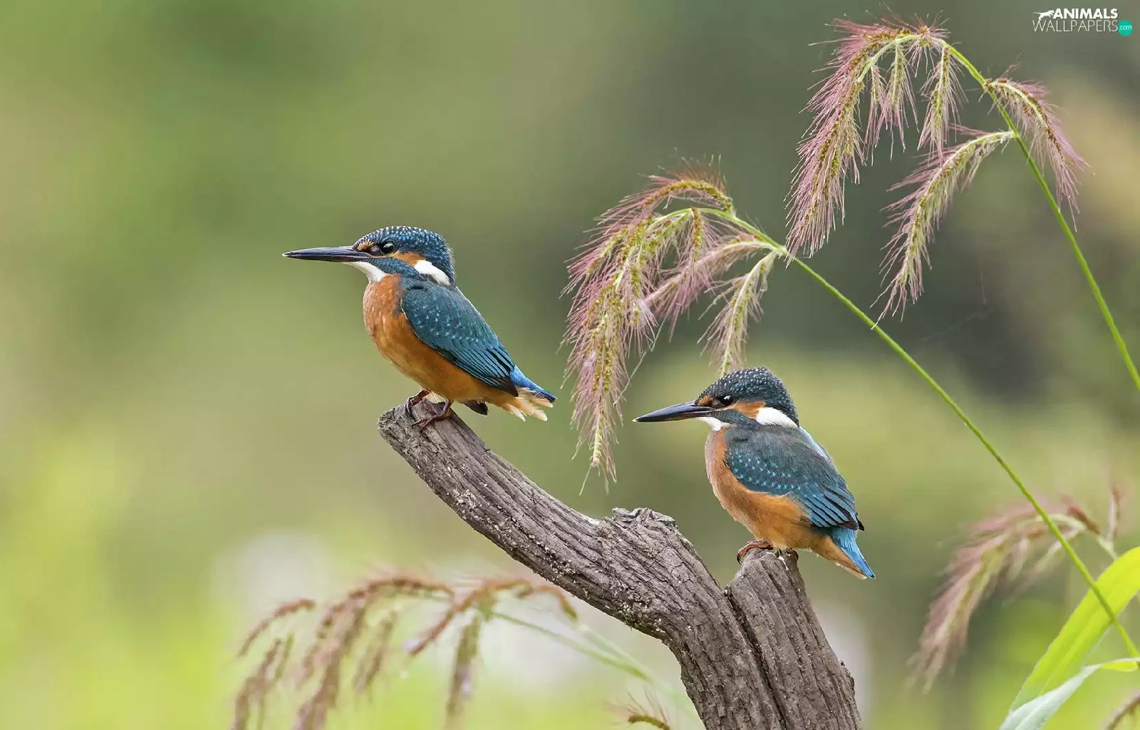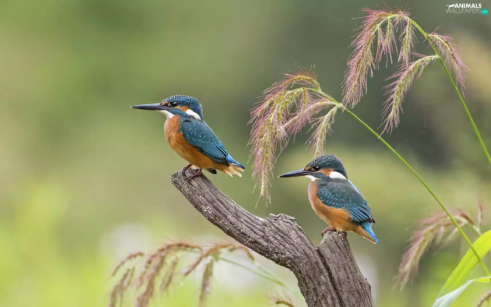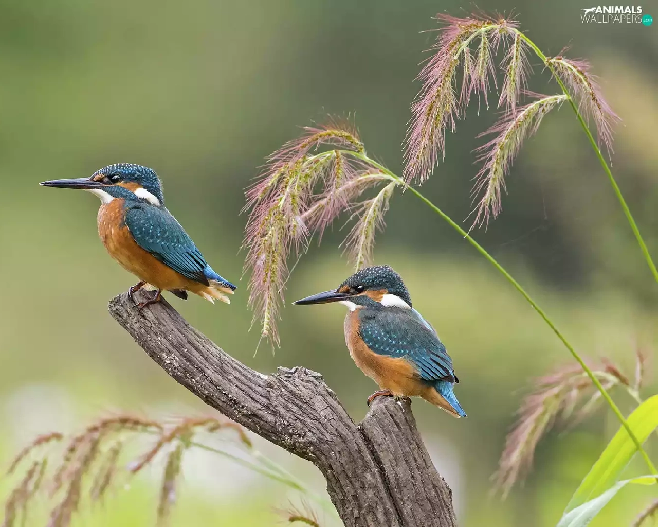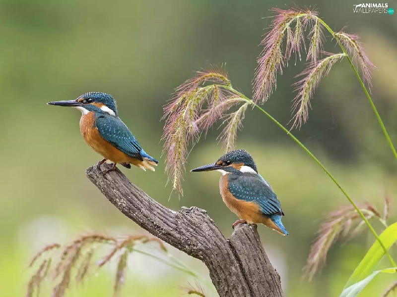 dry, birds, blades, kingfishers, Two cars, branch, grass