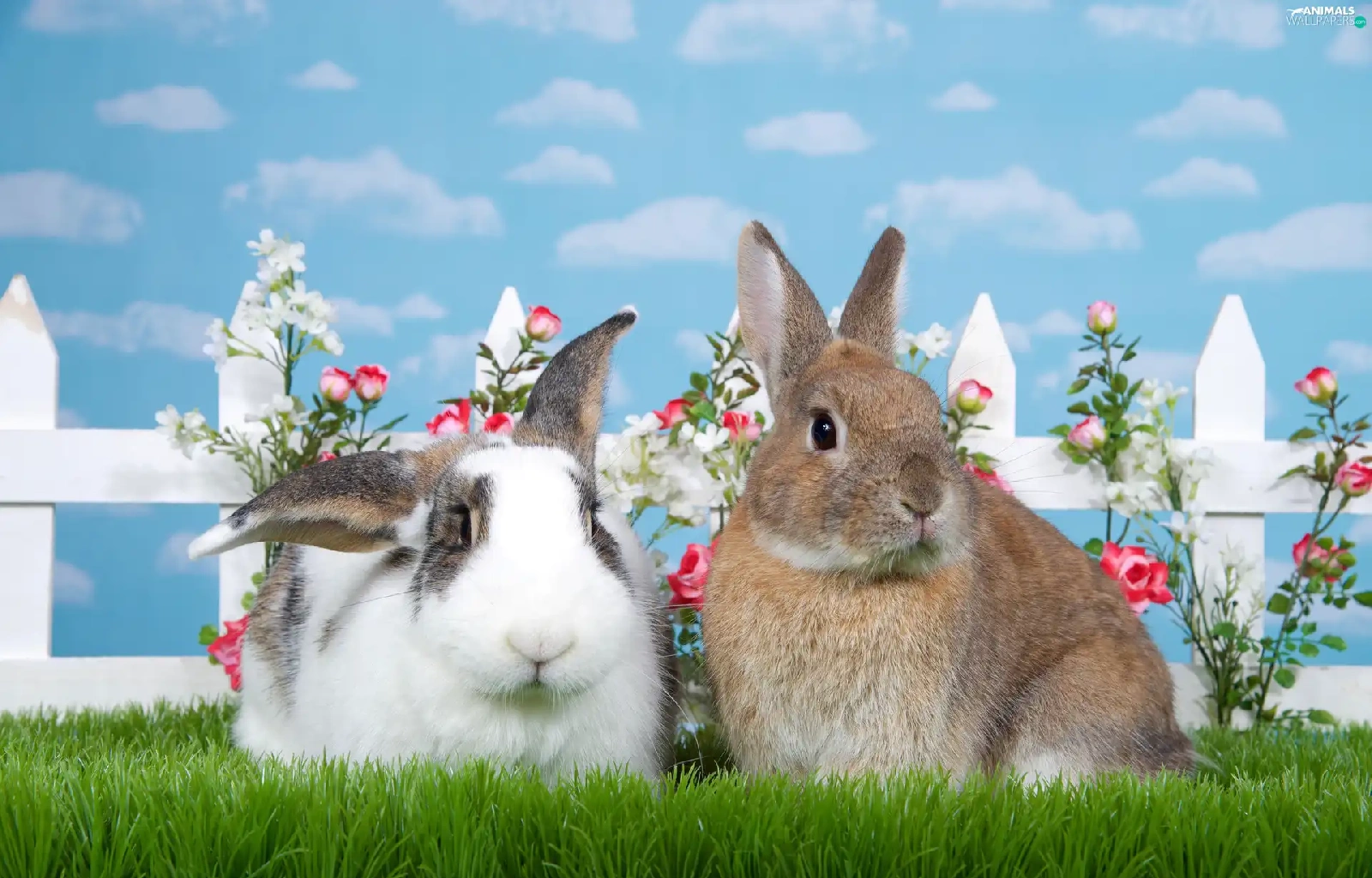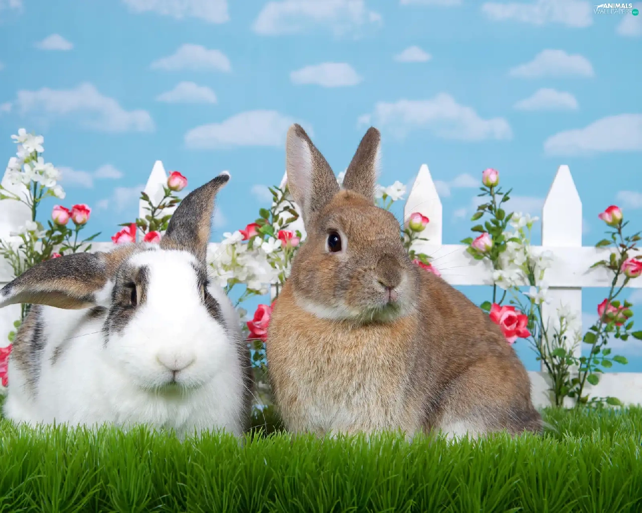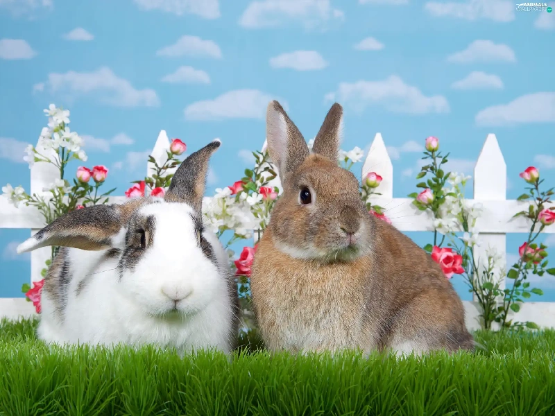 Hurdle, Flowers, Rabbits, grass, Two cars
