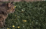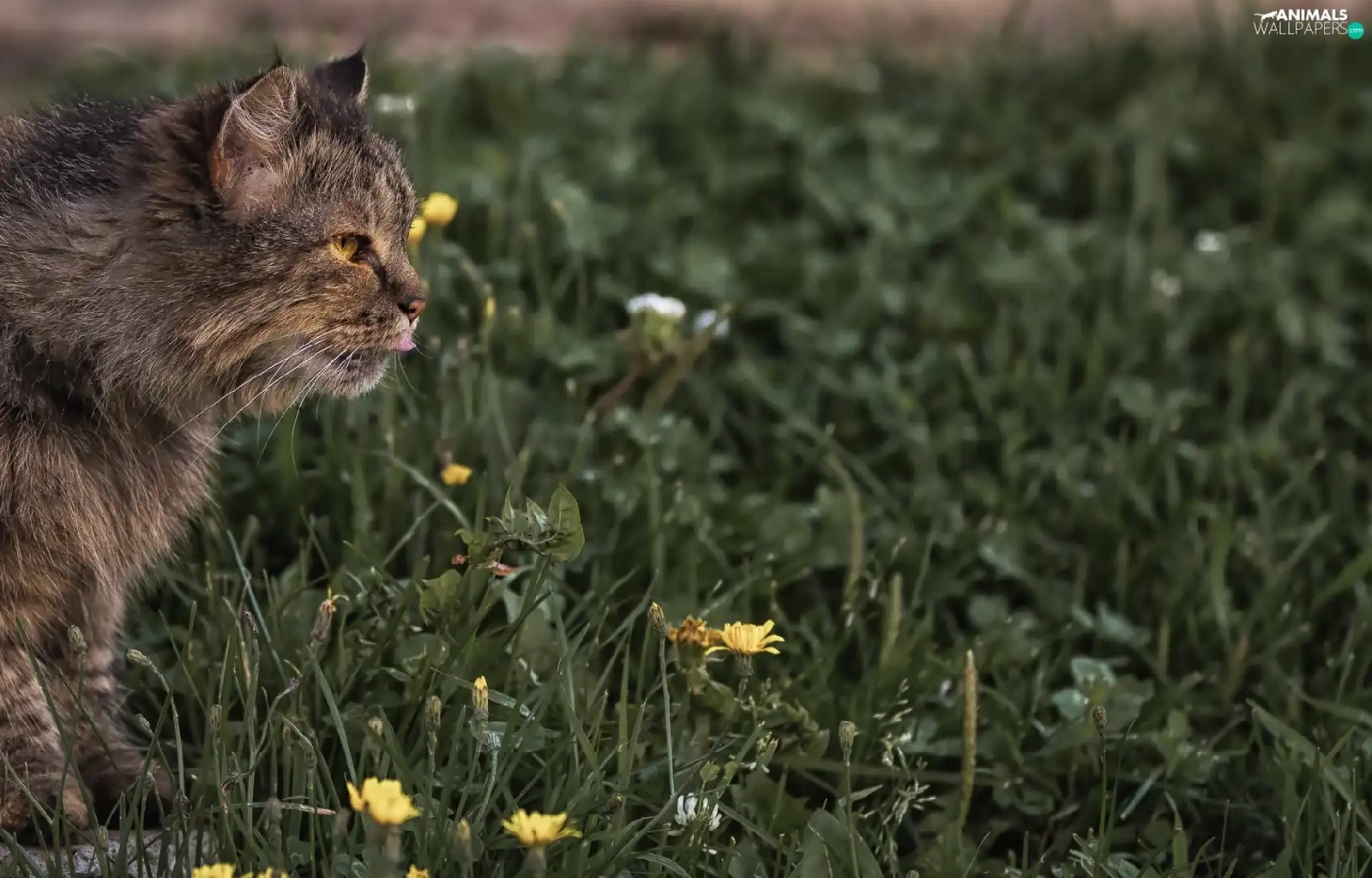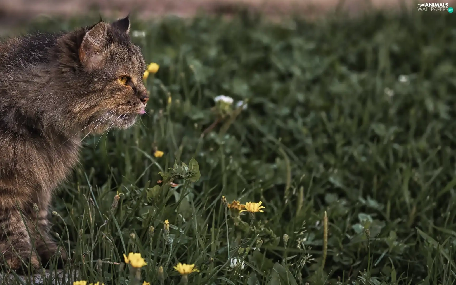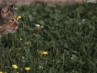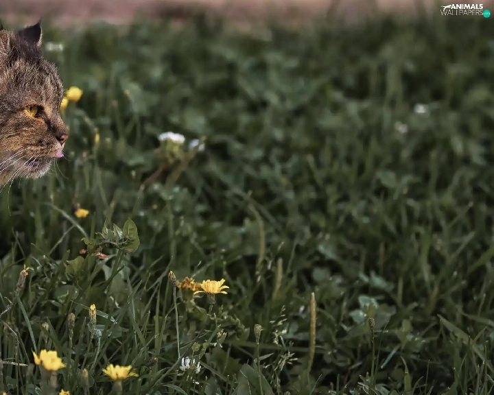 cat, Wildflowers, Flowers, grass