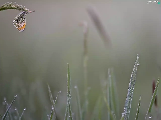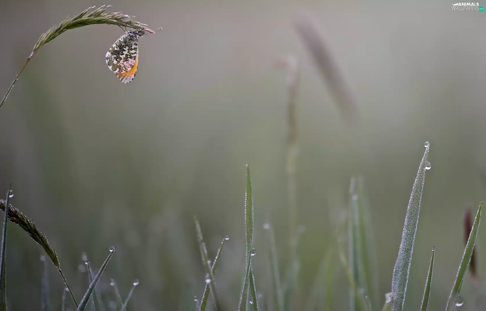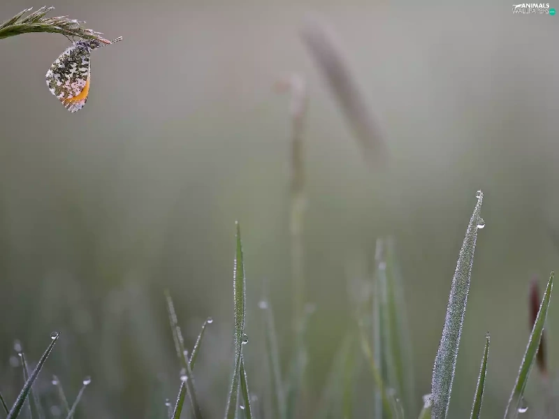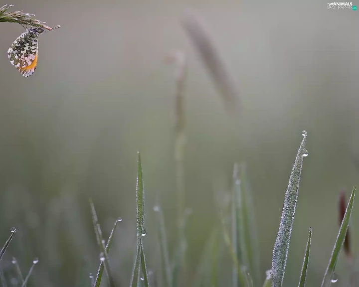 butterfly, grass, drops, Orange Tip