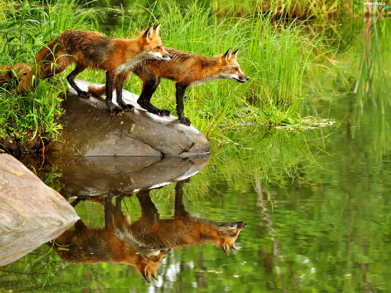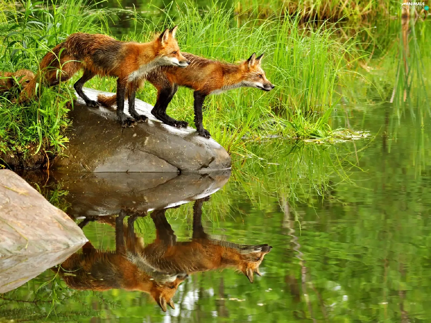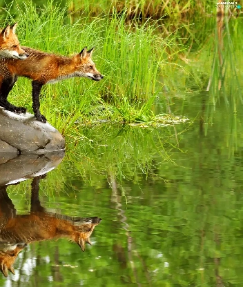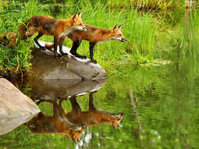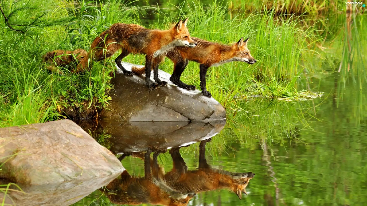 Pond - car, fox, grass, Stones, water, lake