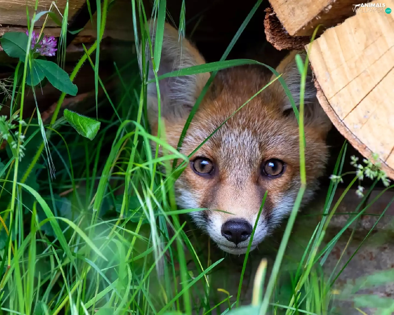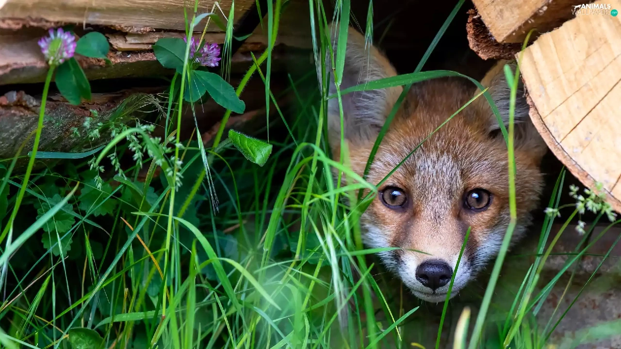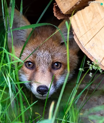 trees, grass, Fox, hide, young