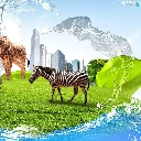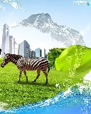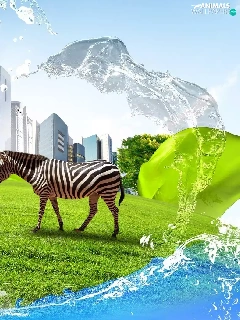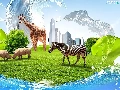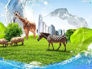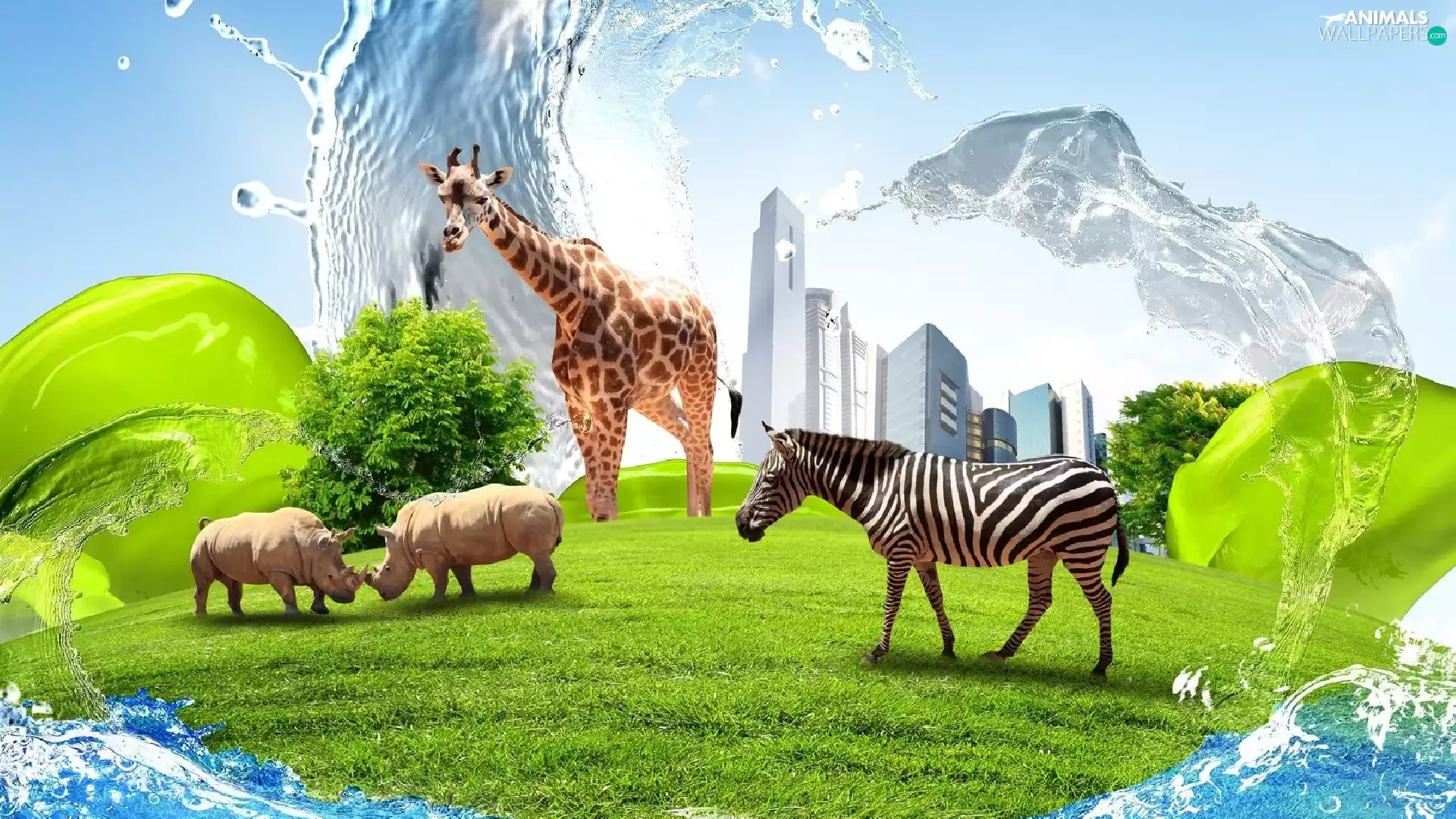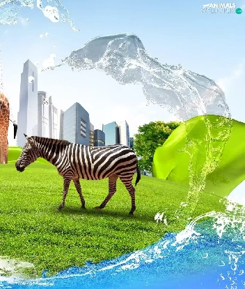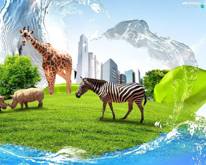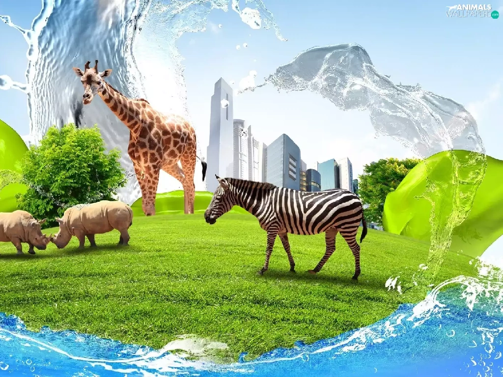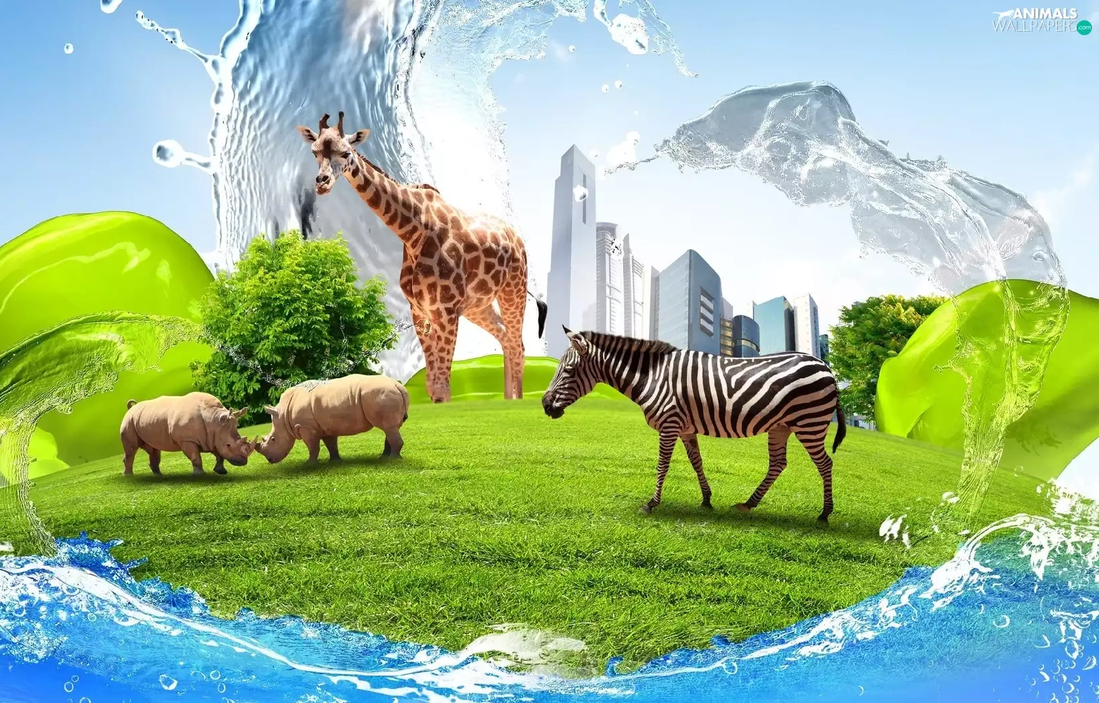 Rhinos, Zebra, clouds, grass, skyscrapers, giraffe