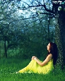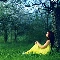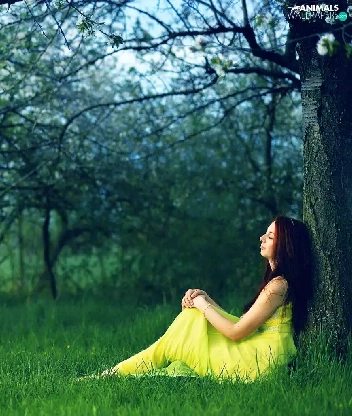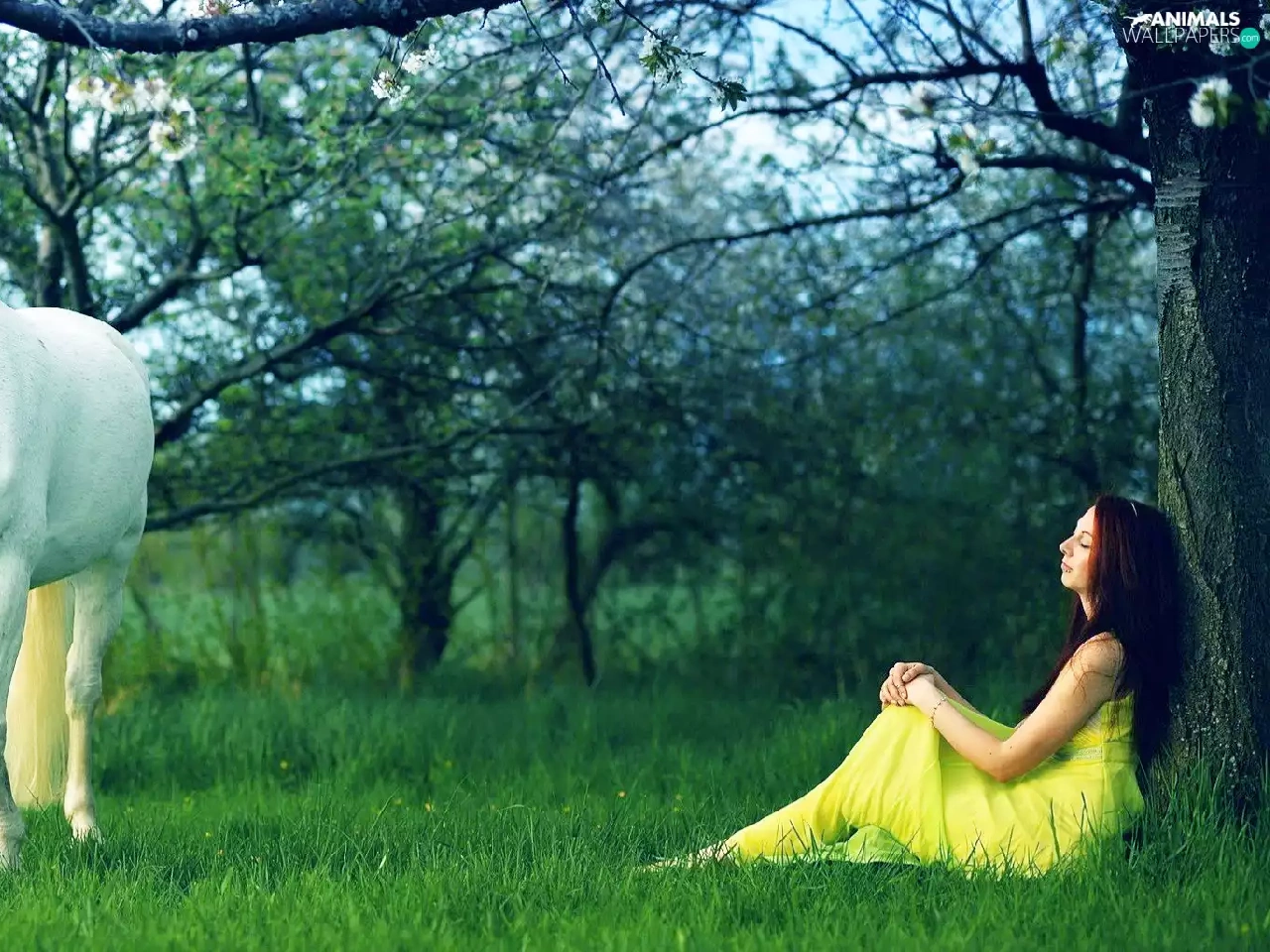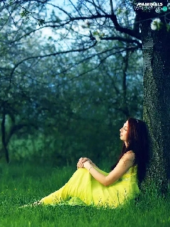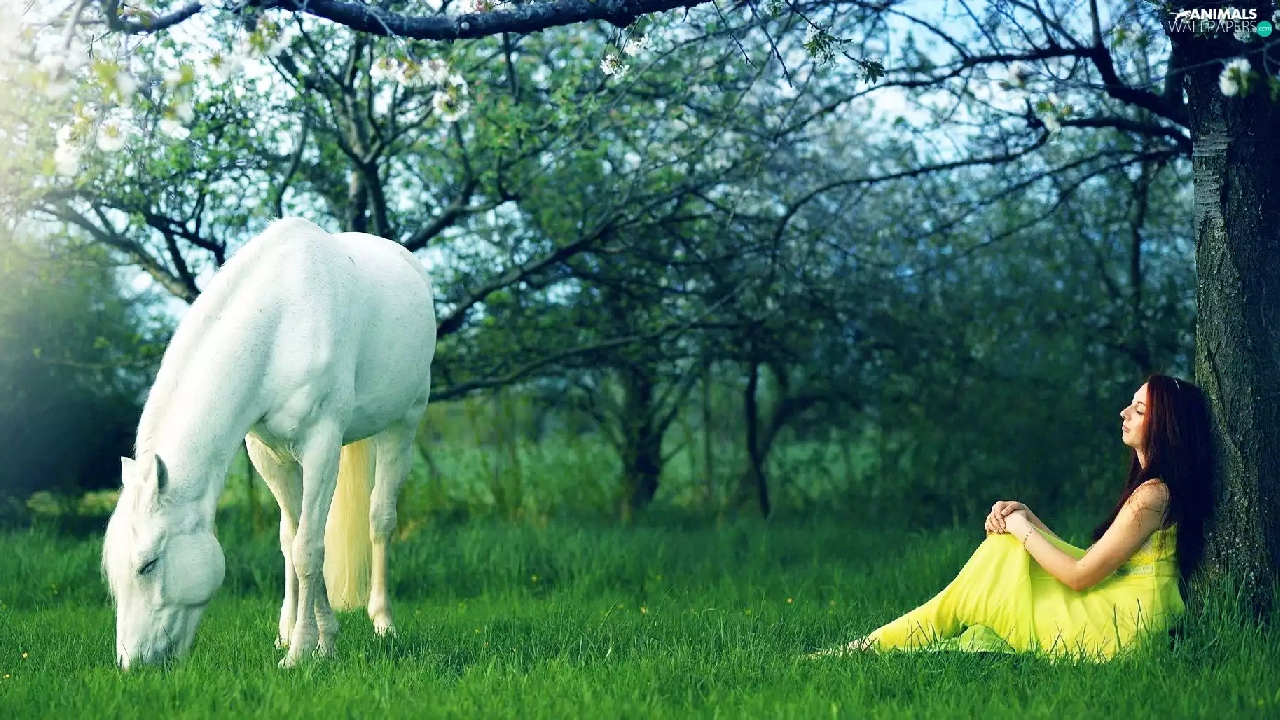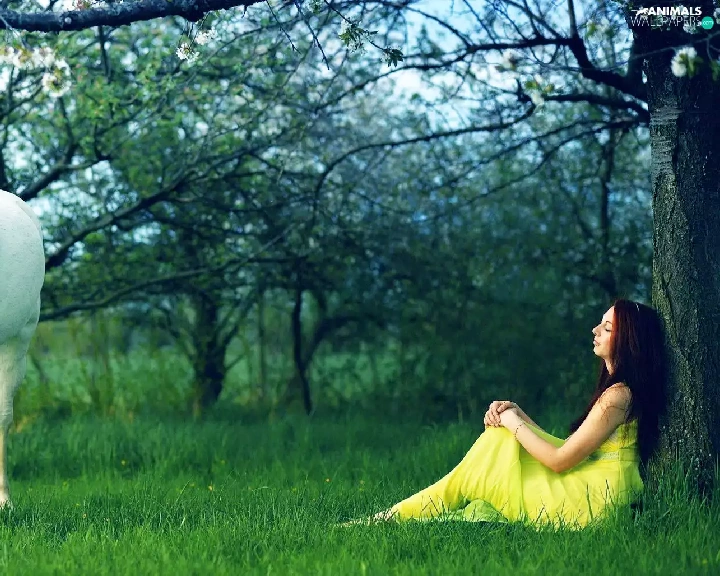 viewes, grass, girl, trees, Horse