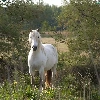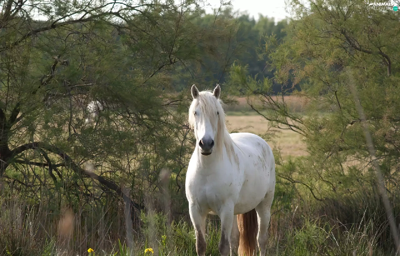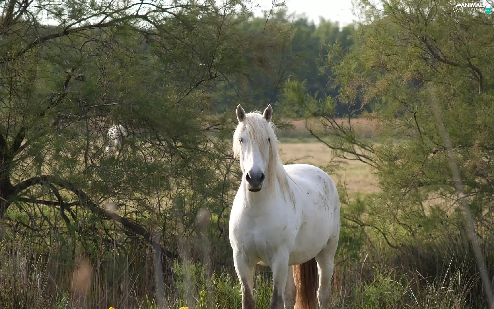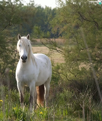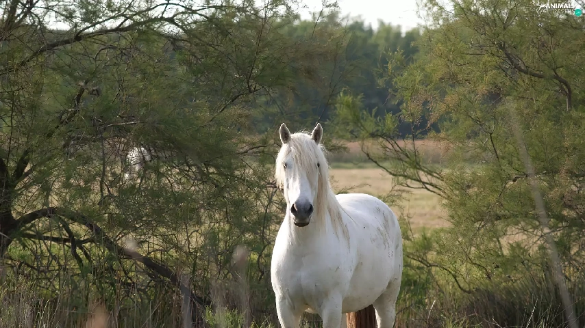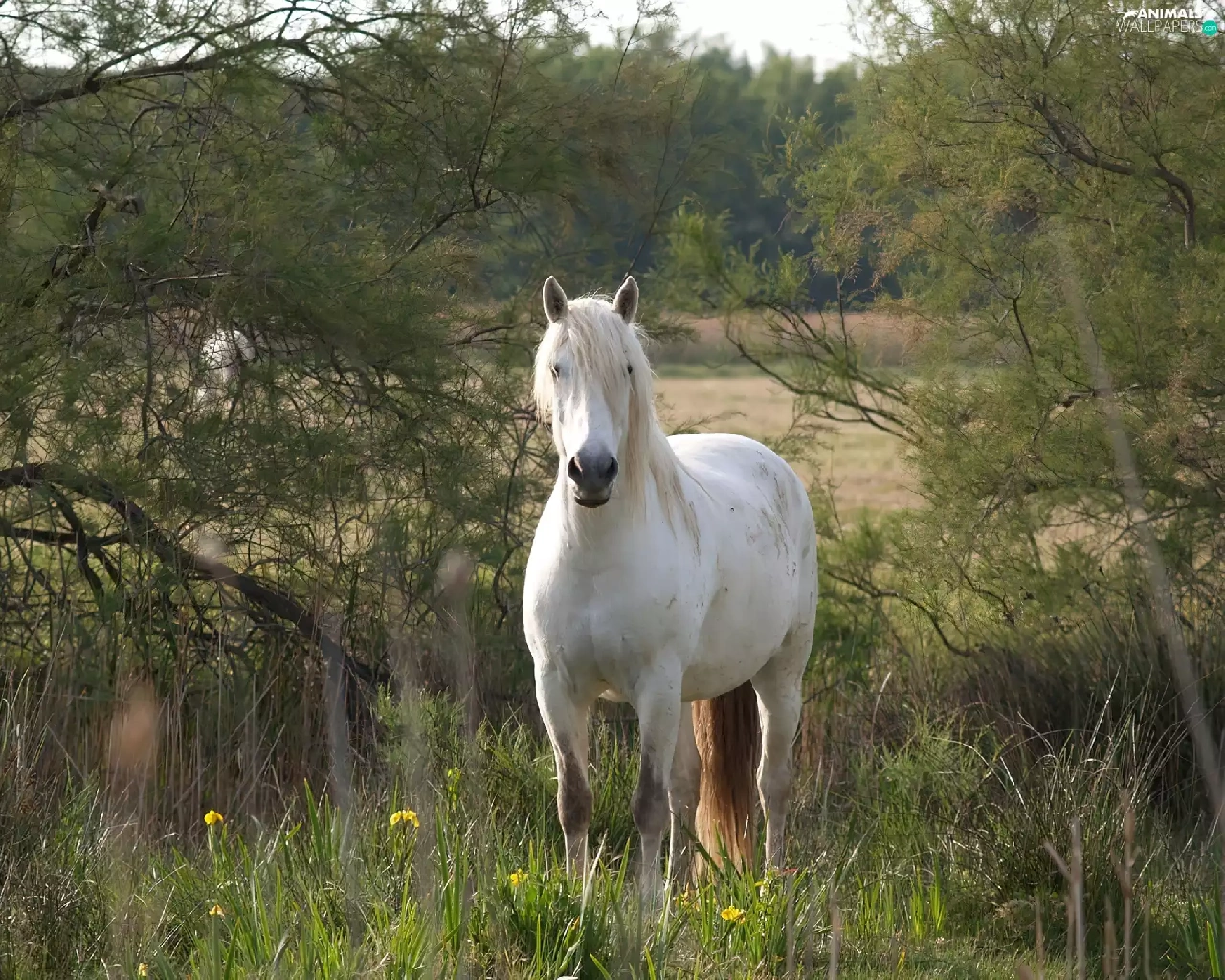 viewes, grass, grizzle, trees, Horse