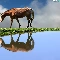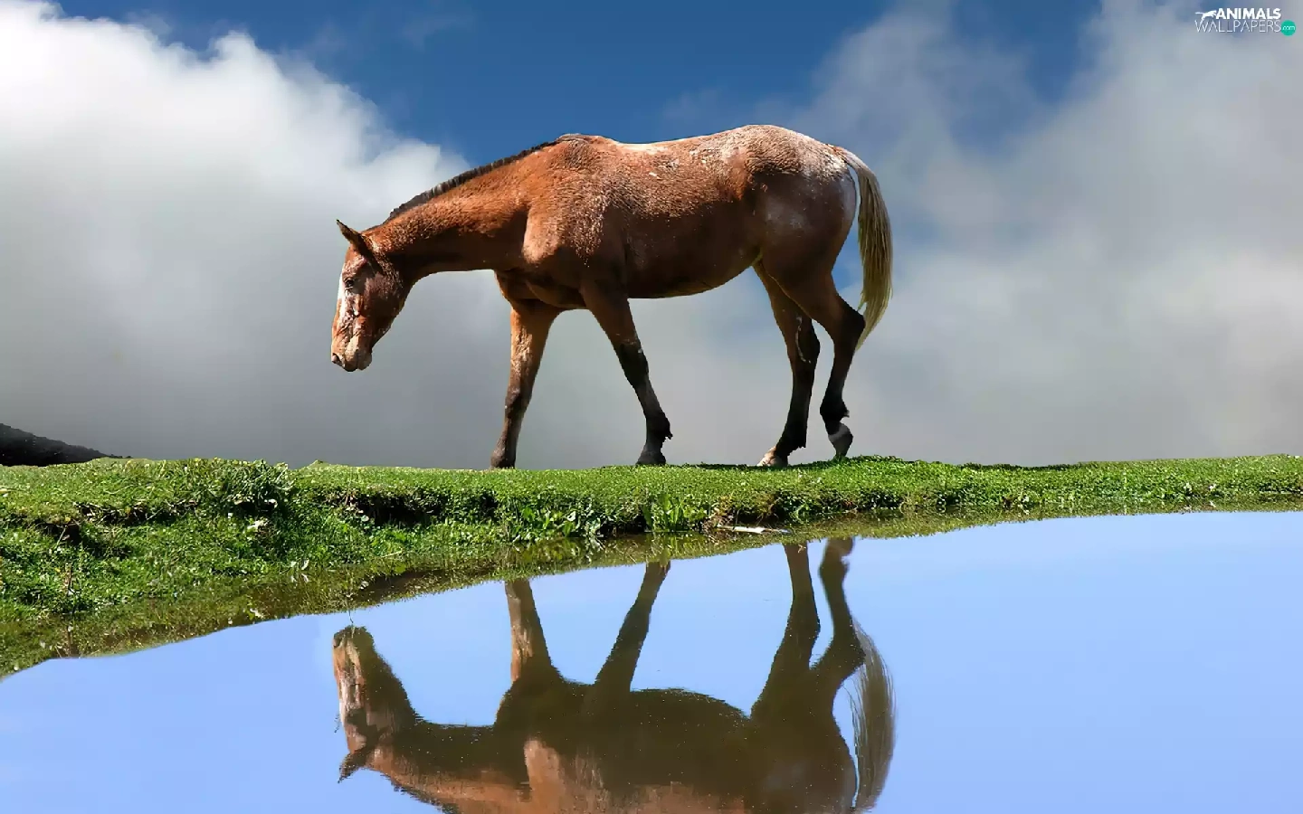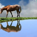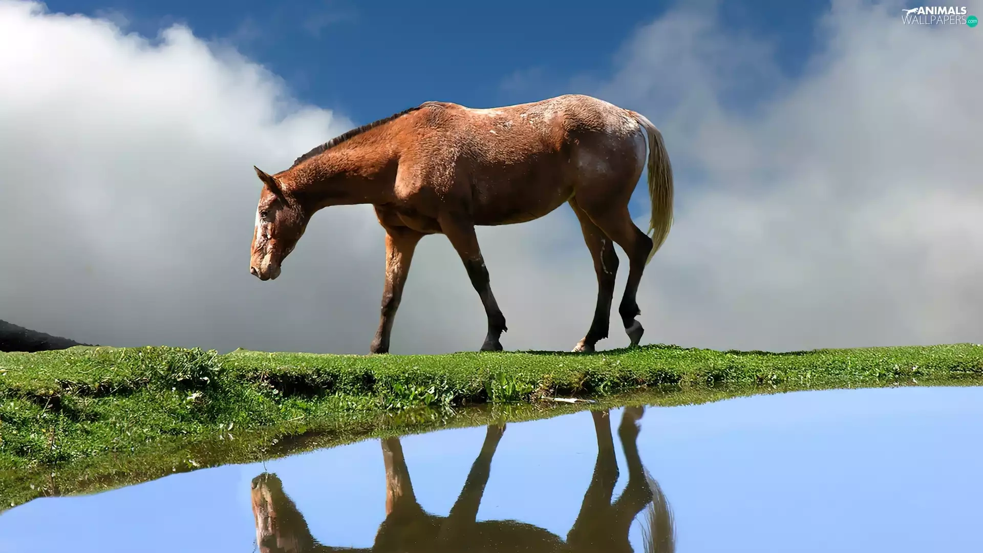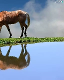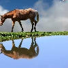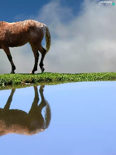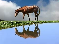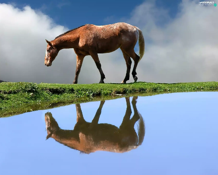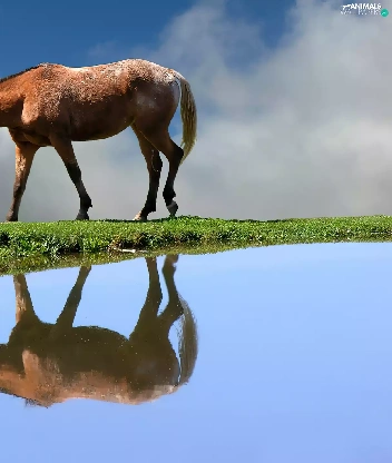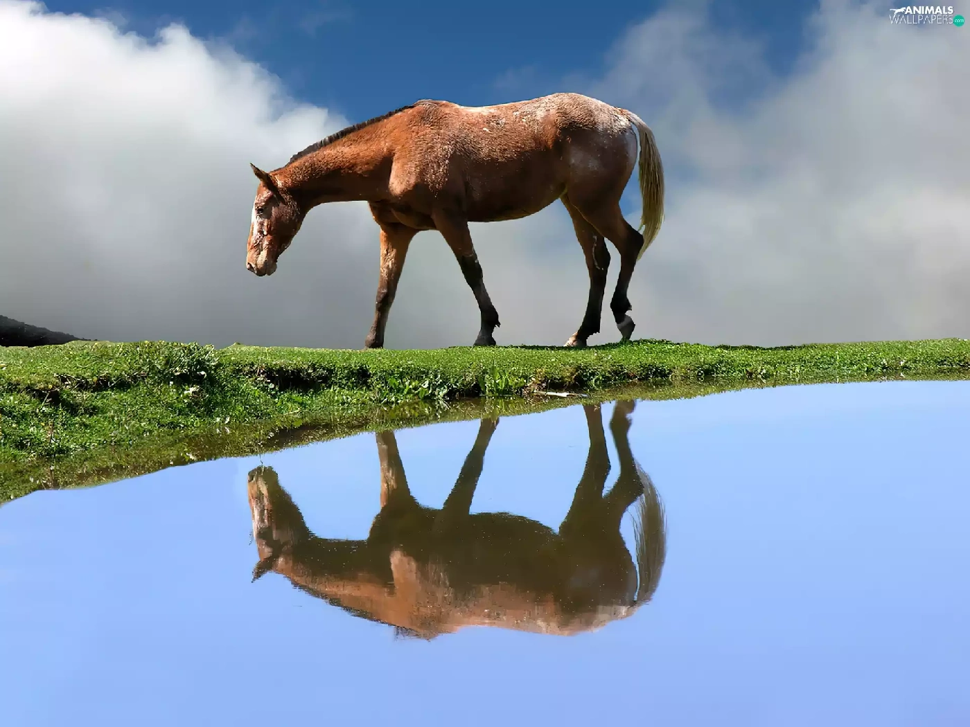 Horse, water, reflection, grass