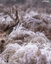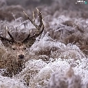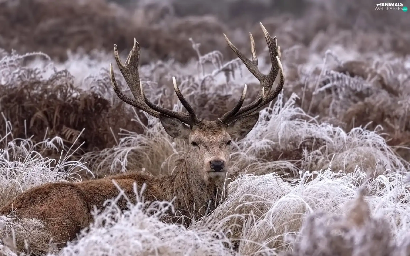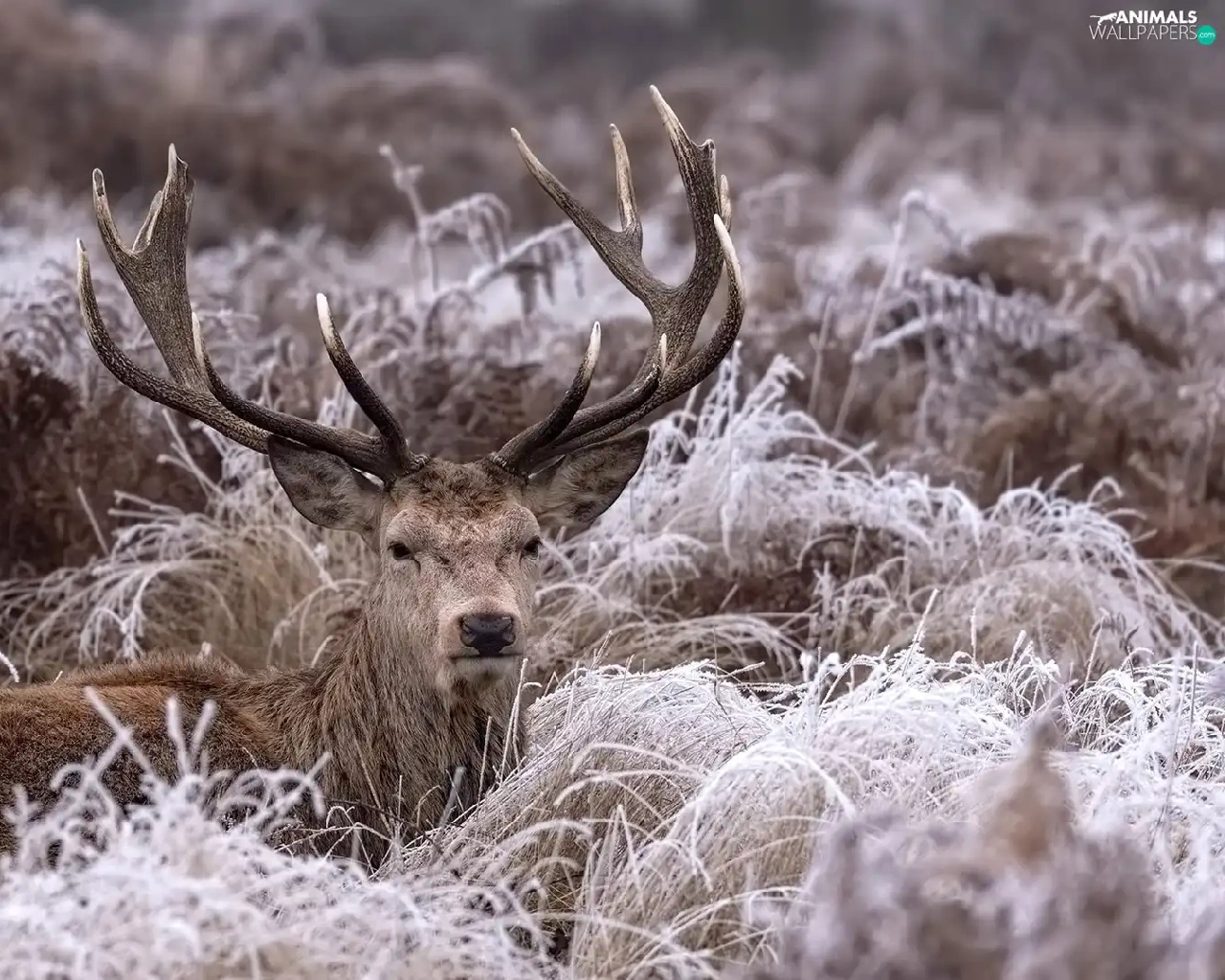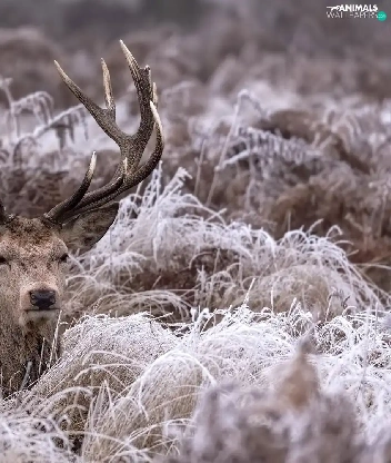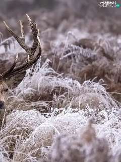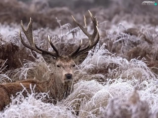 lying, frosty, grass, deer