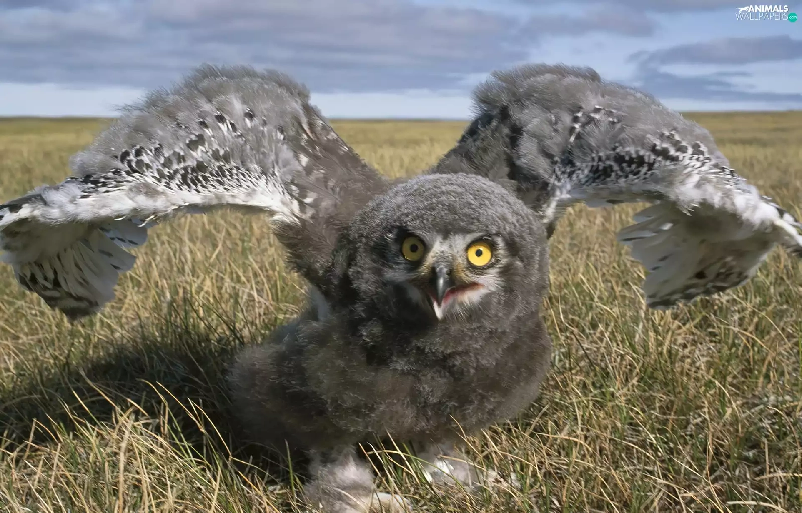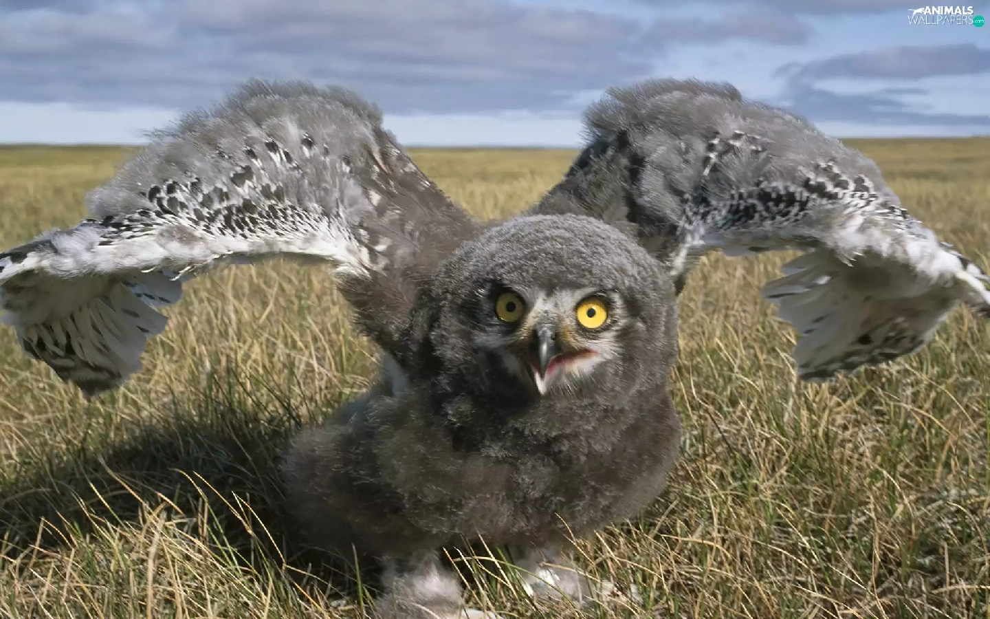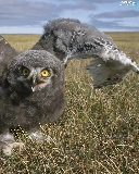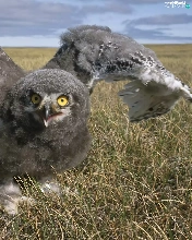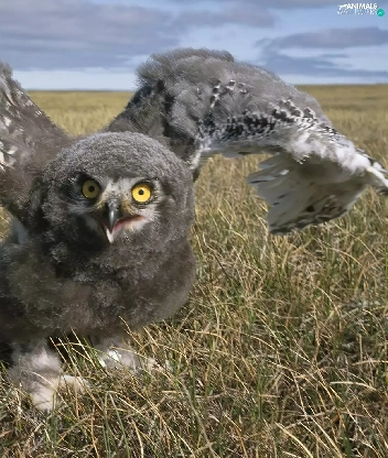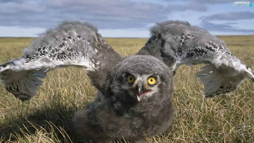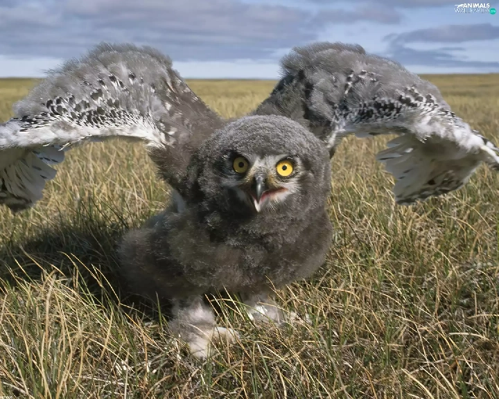 owl, wings, chick, grass