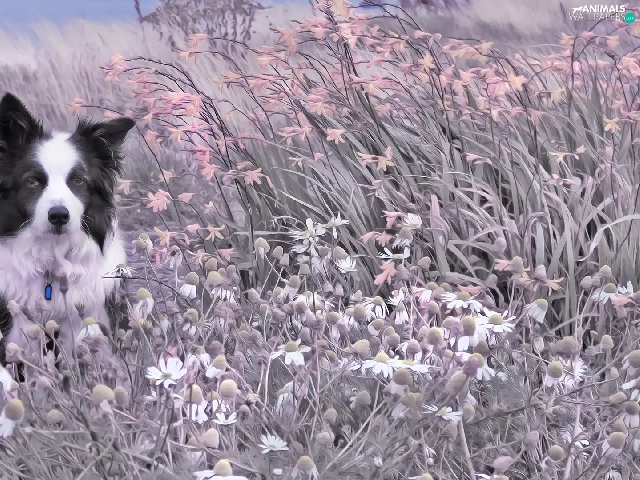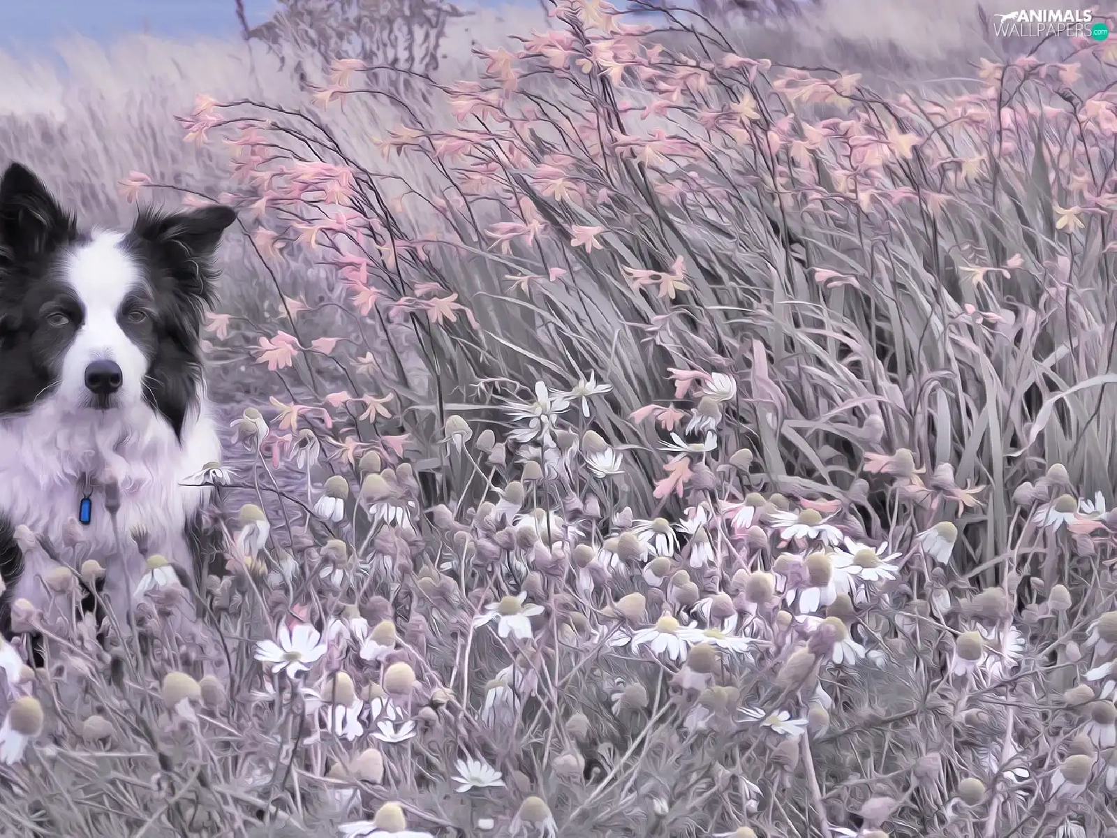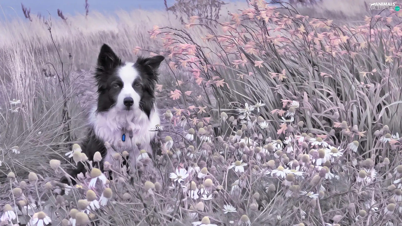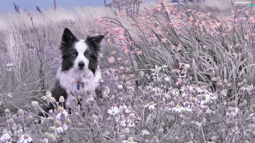 Meadow, dog, Plants, grass, Flowers, Border Collie