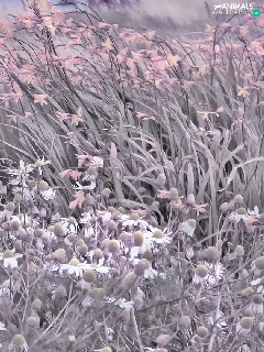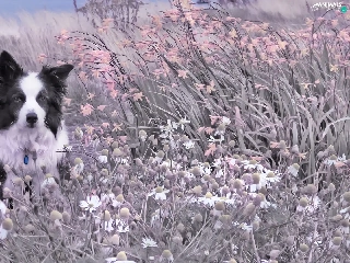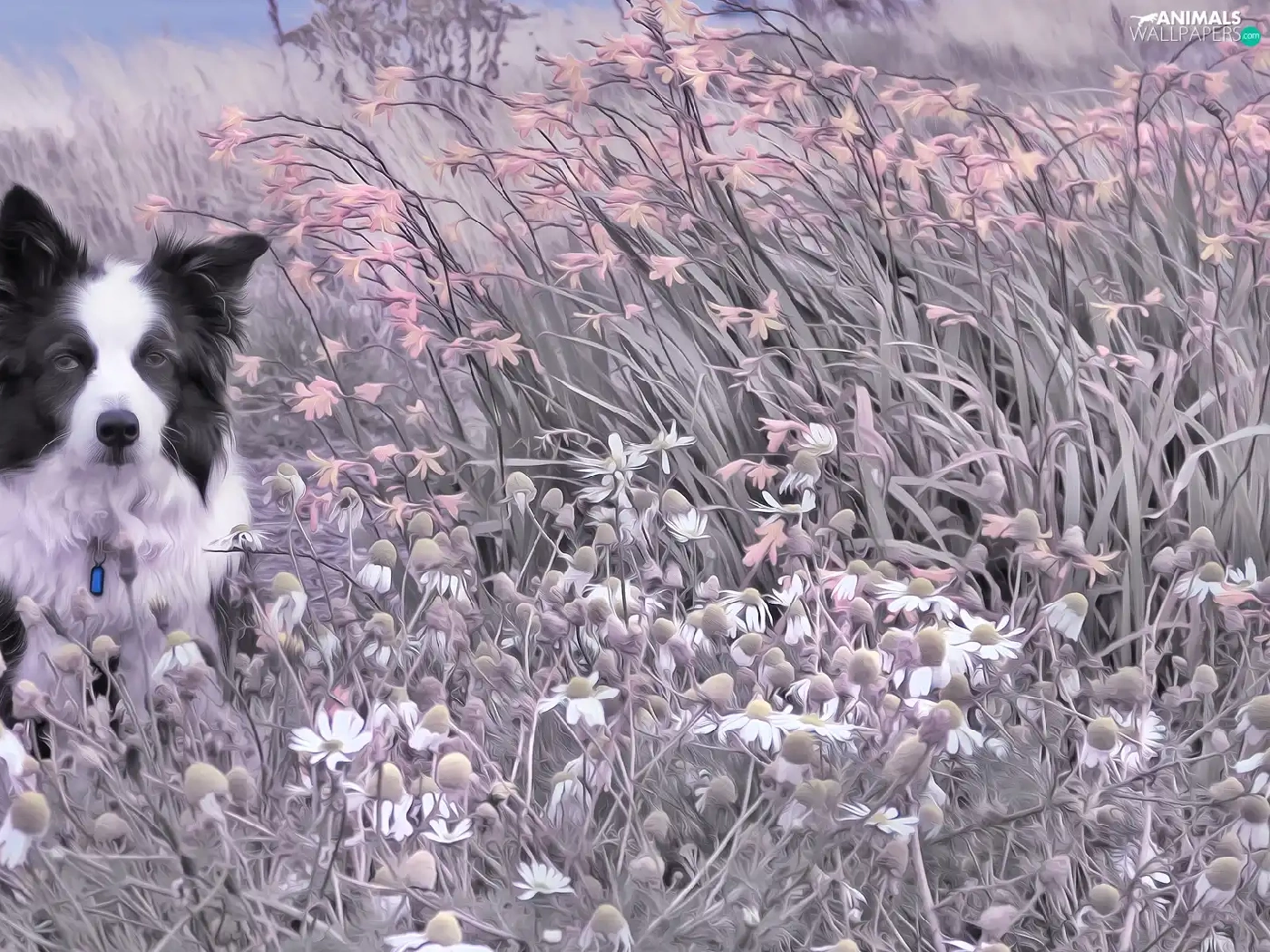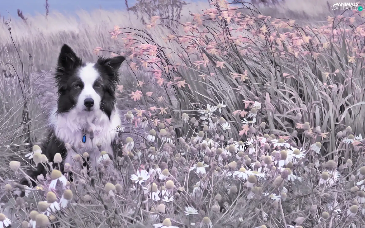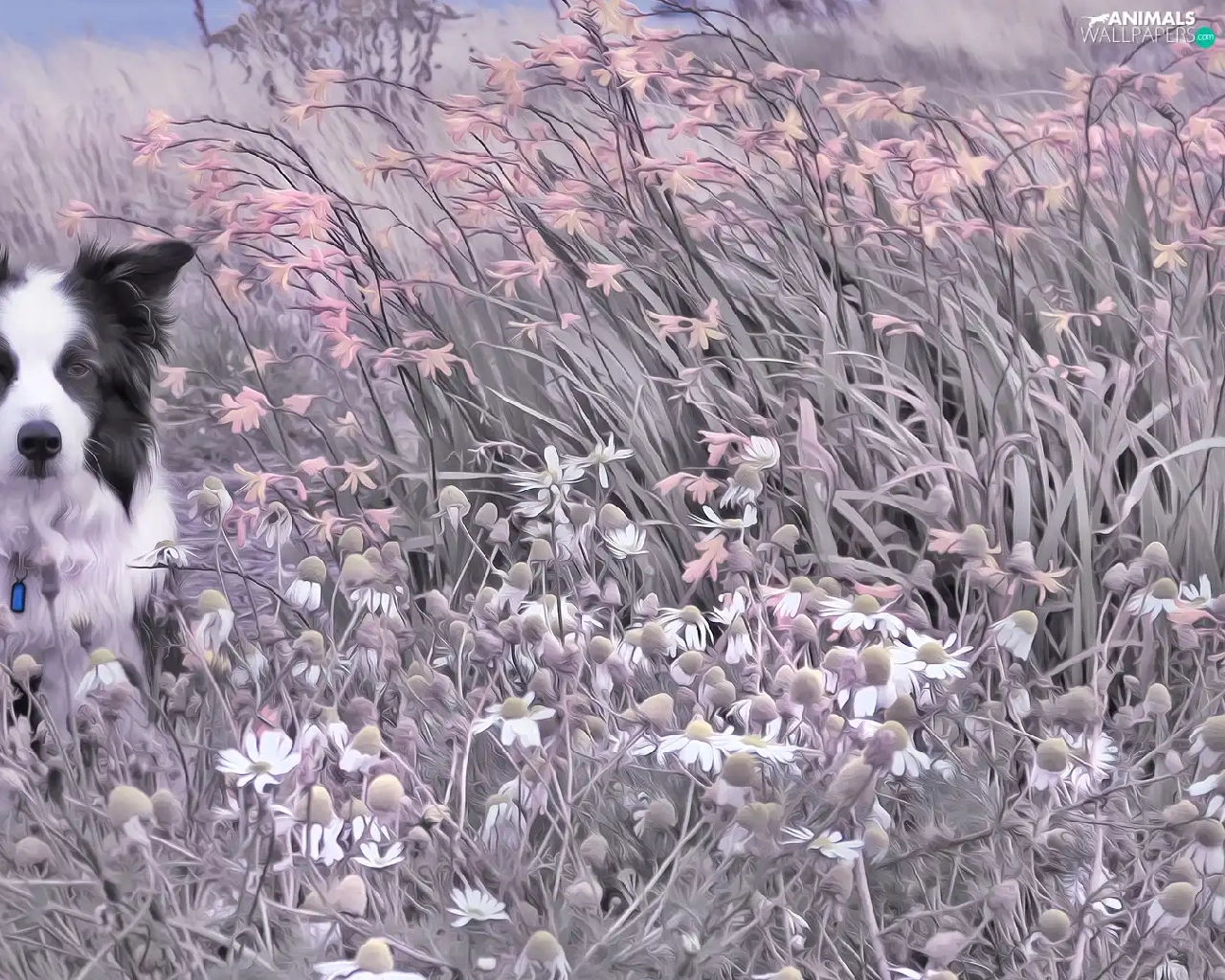 Meadow, dog, Plants, grass, Flowers, Border Collie