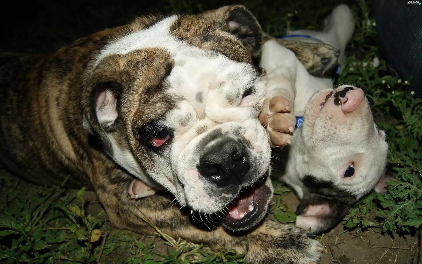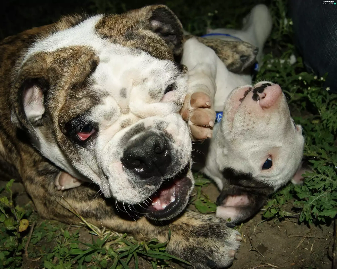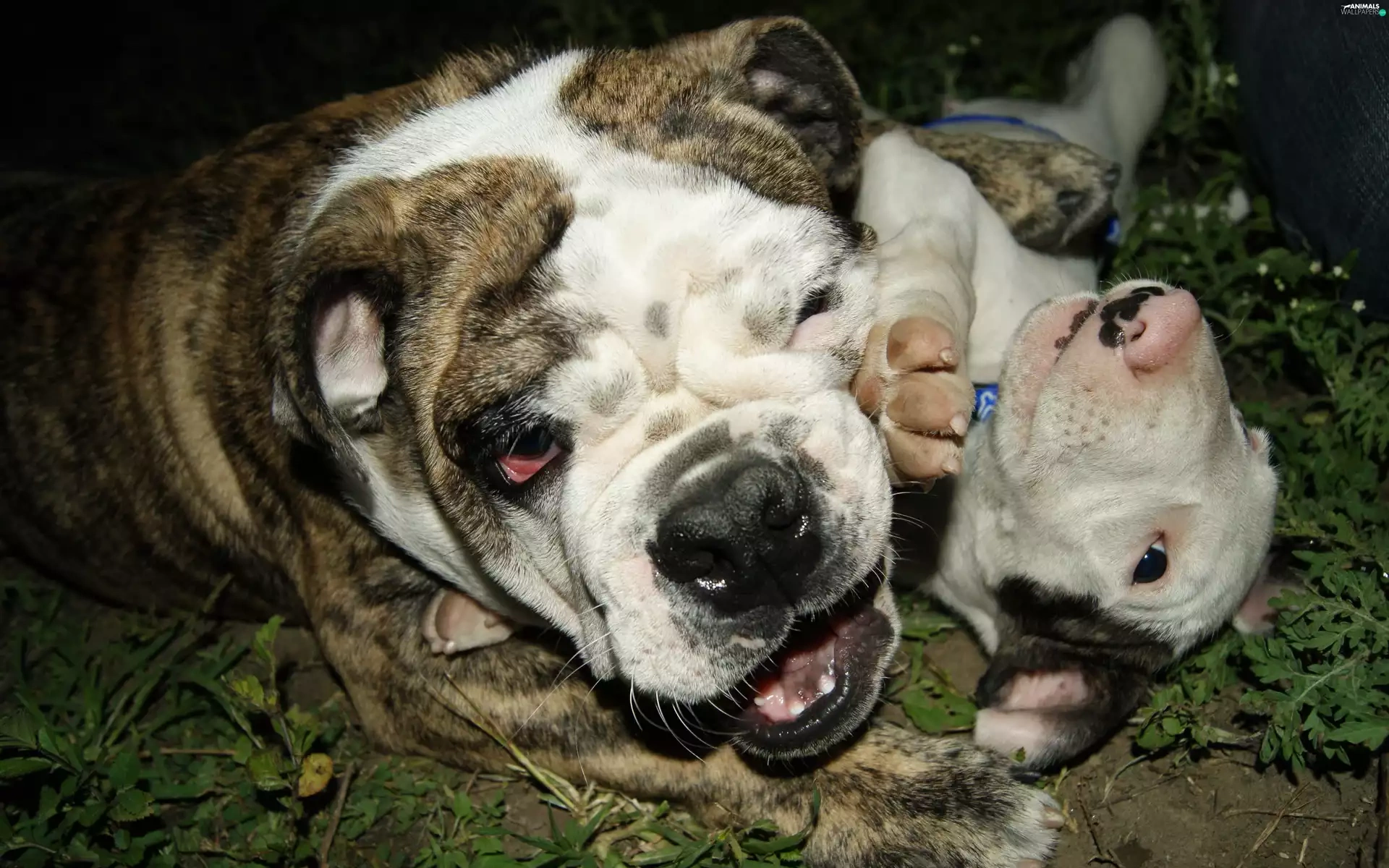 play, English Bulldog, grass